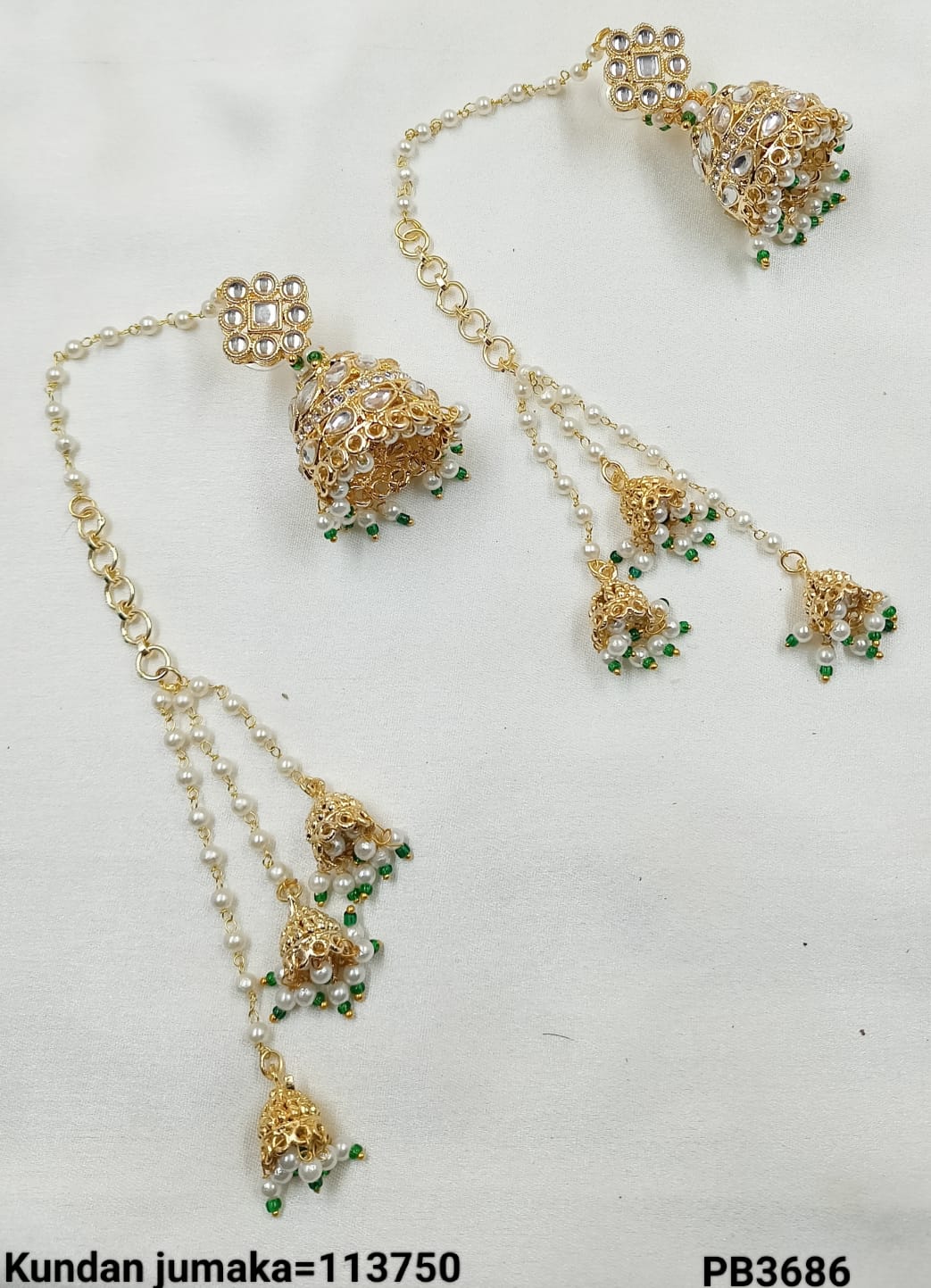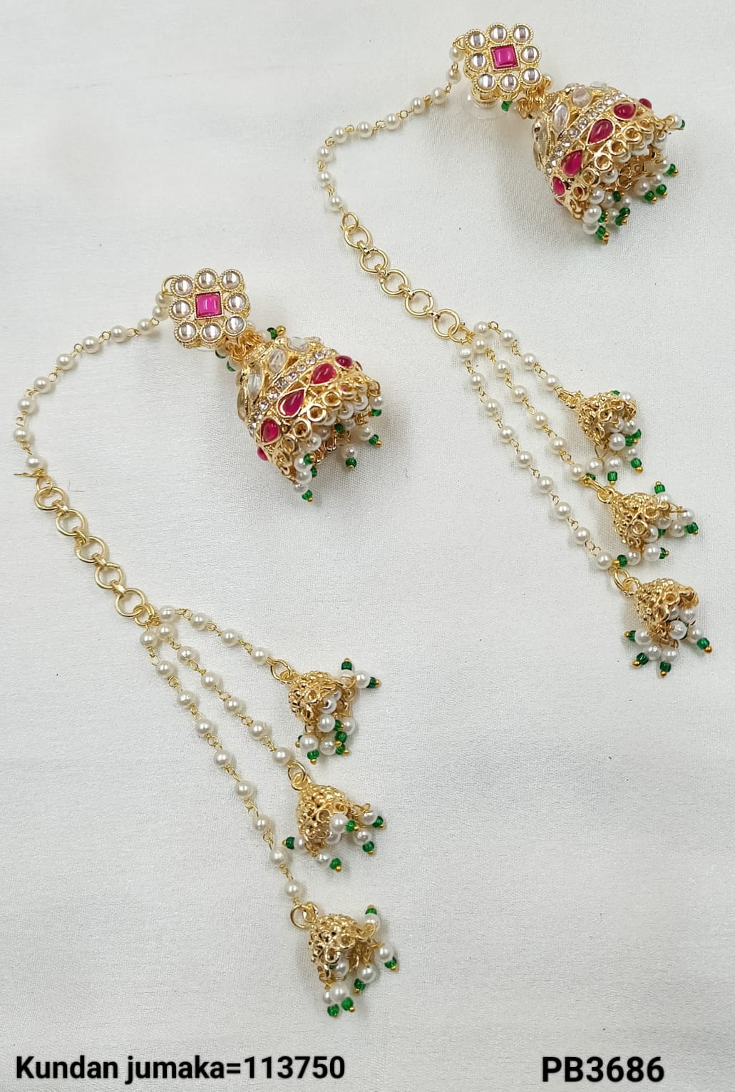 Elegant traditional Kundan earrings paired with a delicate chain, showcasing refined artistry and timeless elegance. Ideal for complementing traditional attire with a sophisticated flair. It Has...