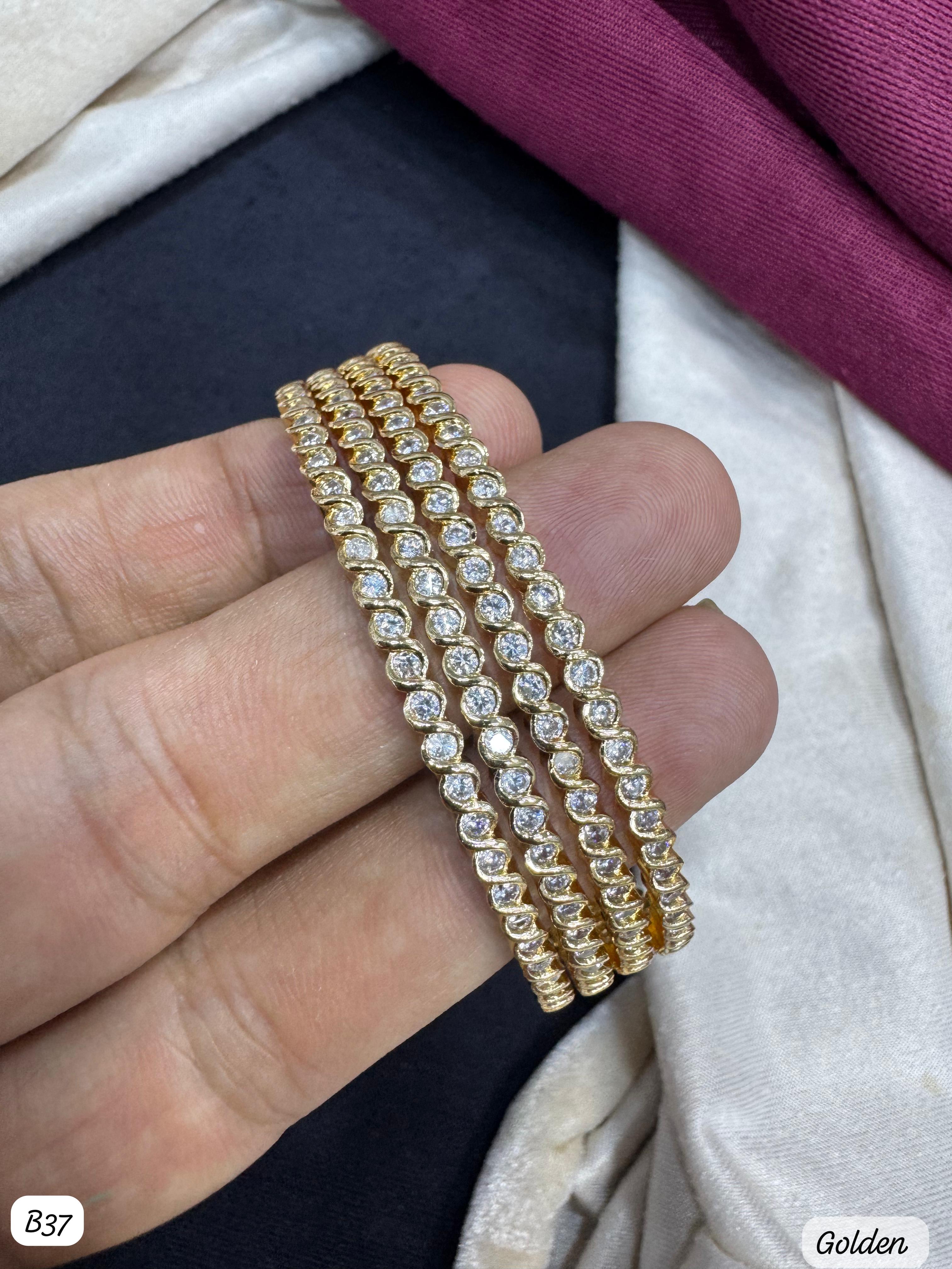 Enhance your look with our stunning American Diamond Gold Plated Bangles. These bangles add a touch of elegance with their intricate design and sparkling diamonds. Crafted...