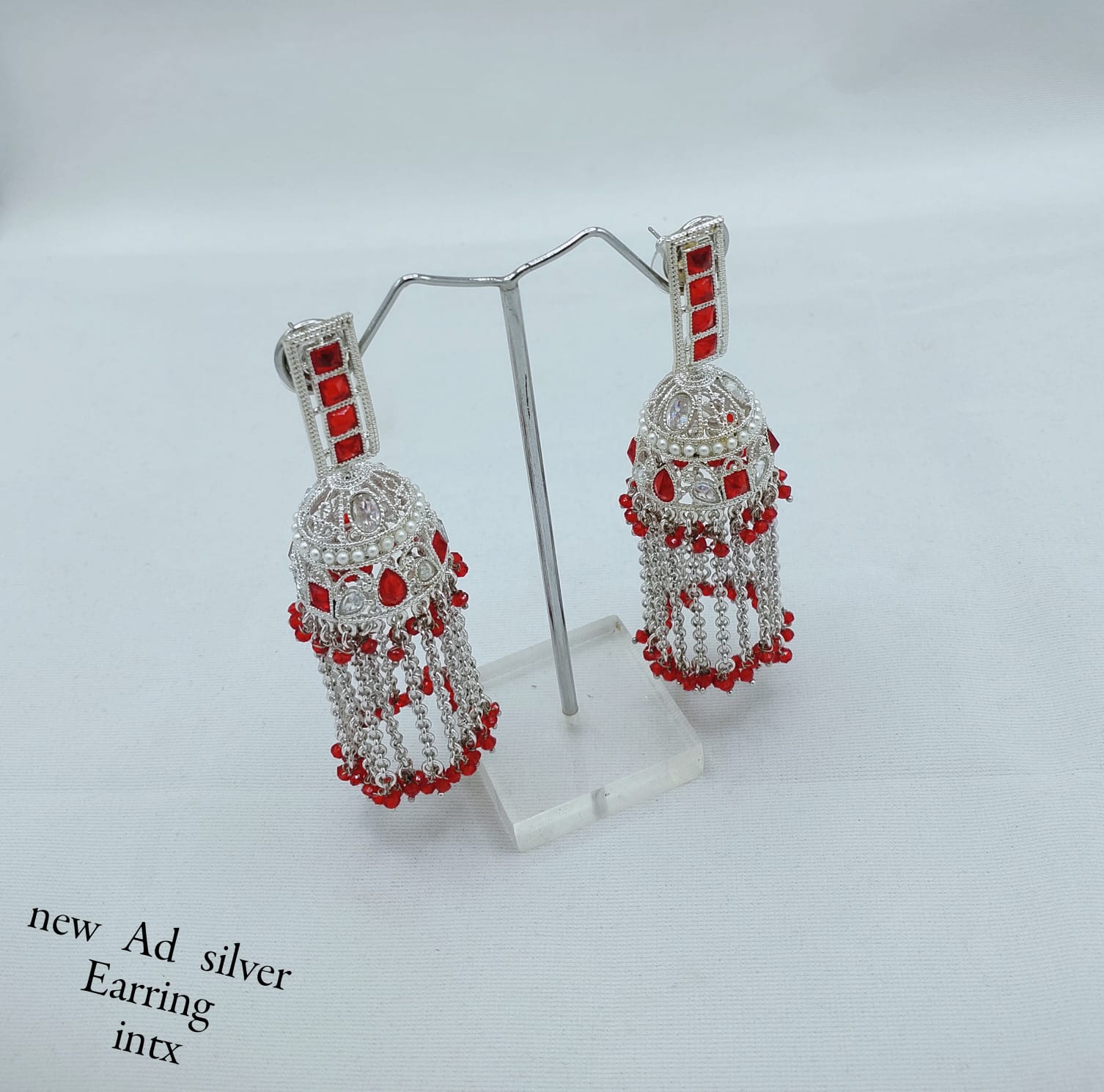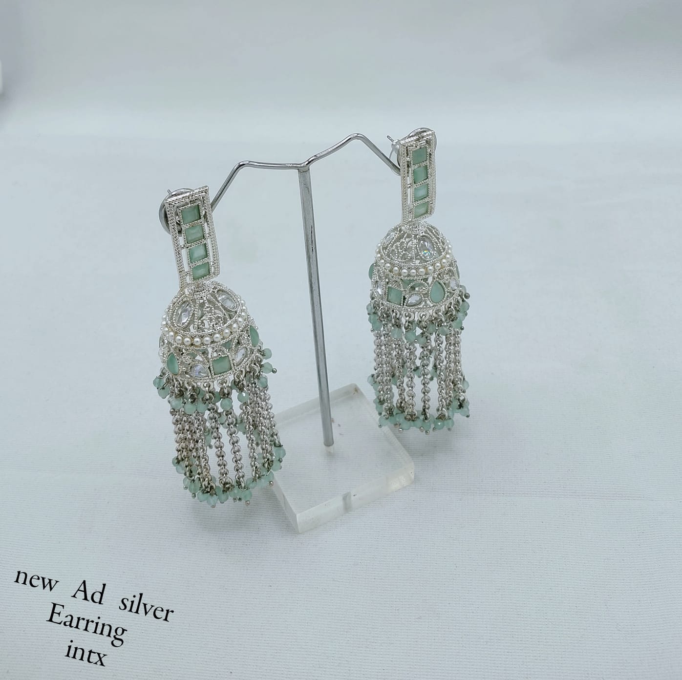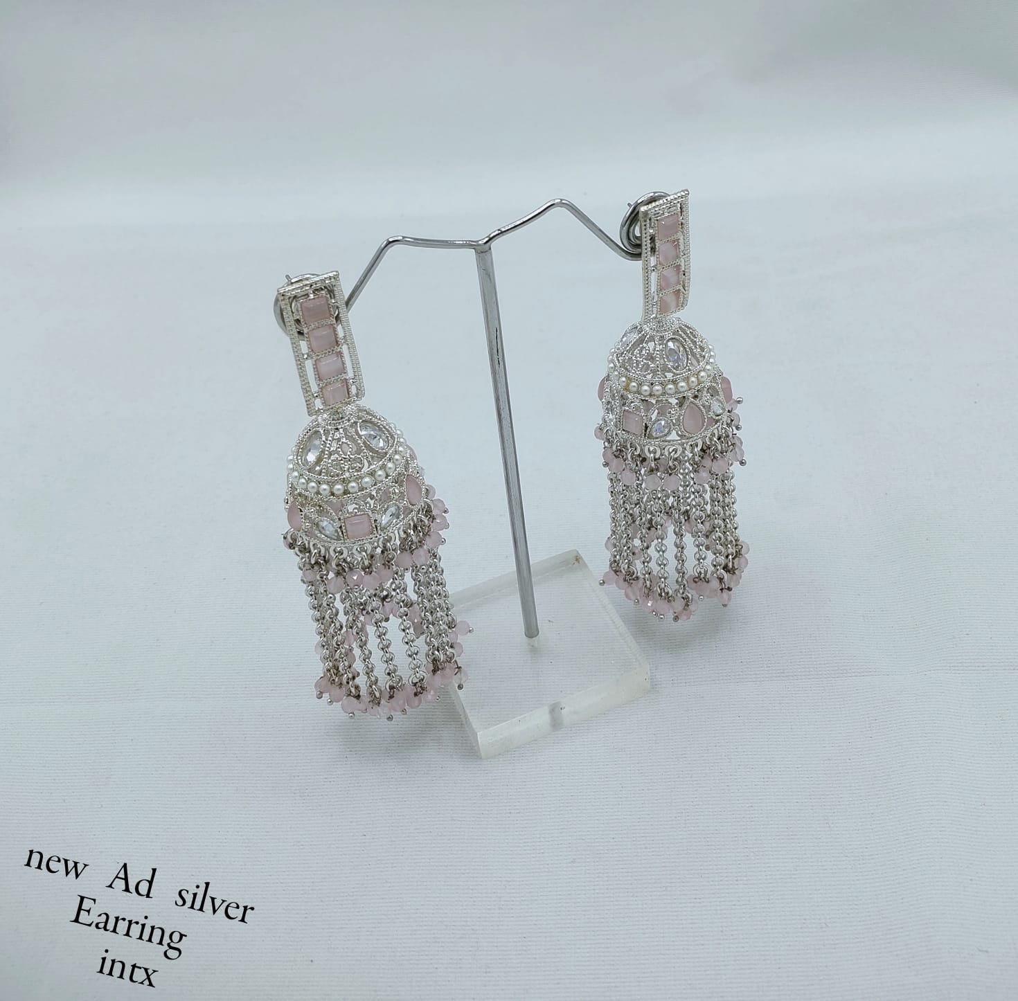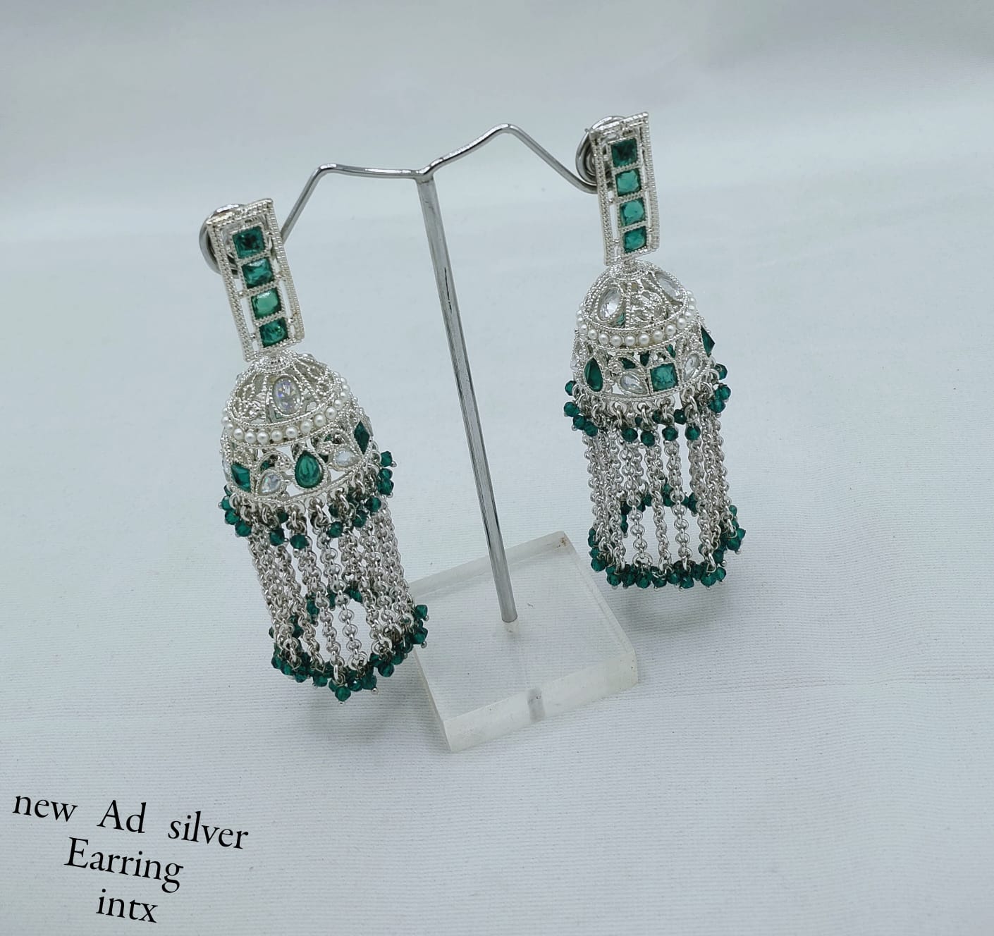 Designer Silver Finish AD Jhumka Earrings with Beaded Tassels – Elegant Traditional Style