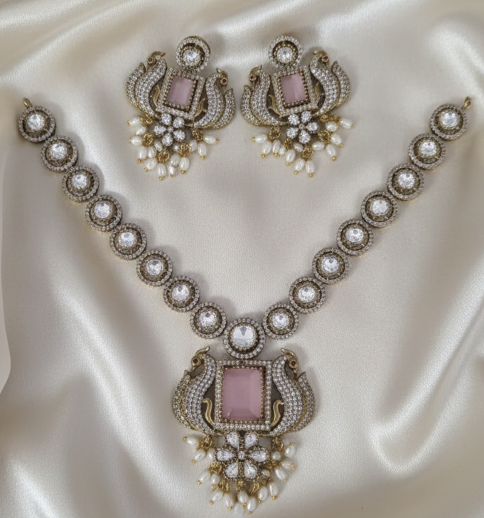 Product Highlights Majestic Peacock Artistry: The centerpiece features twin peacock motifs meticulously crafted in American Diamonds, symbolizing grace and eternal beauty. Royal Rani Pink Centerpiece: Highlighted...