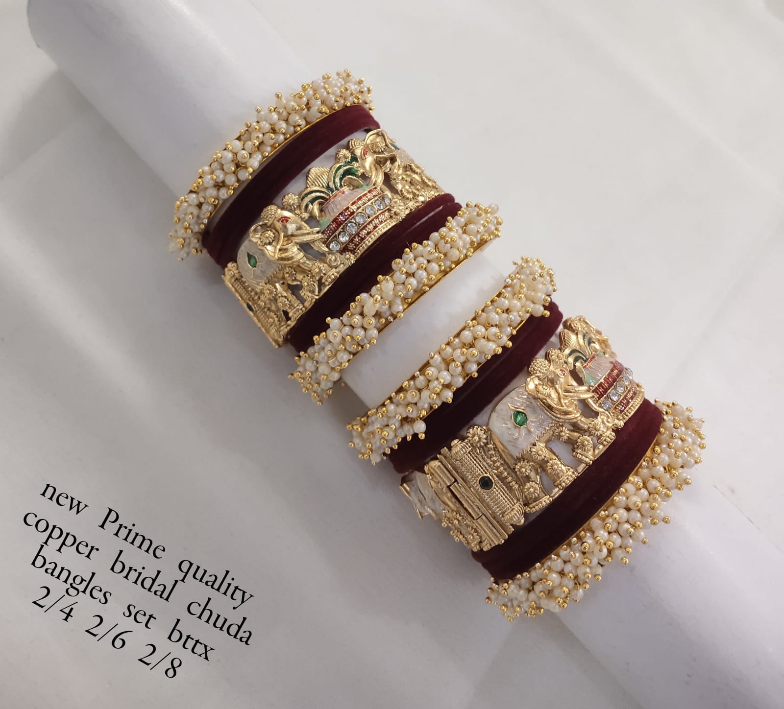 This Bridal Chuda Set features a luxurious gold-plated finish combined with rich velvet, designed to enhance traditional bridal elegance. It Has A Pack Of :-1 Bangles...