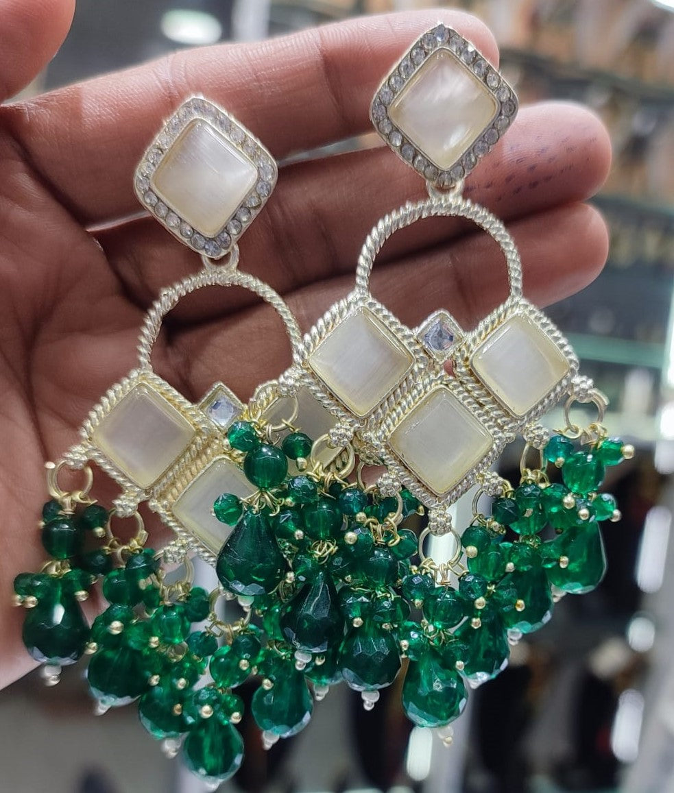 Square Emerald Green Crystal Kundan Drop Earrings Gold Plated Jali Work Dangles