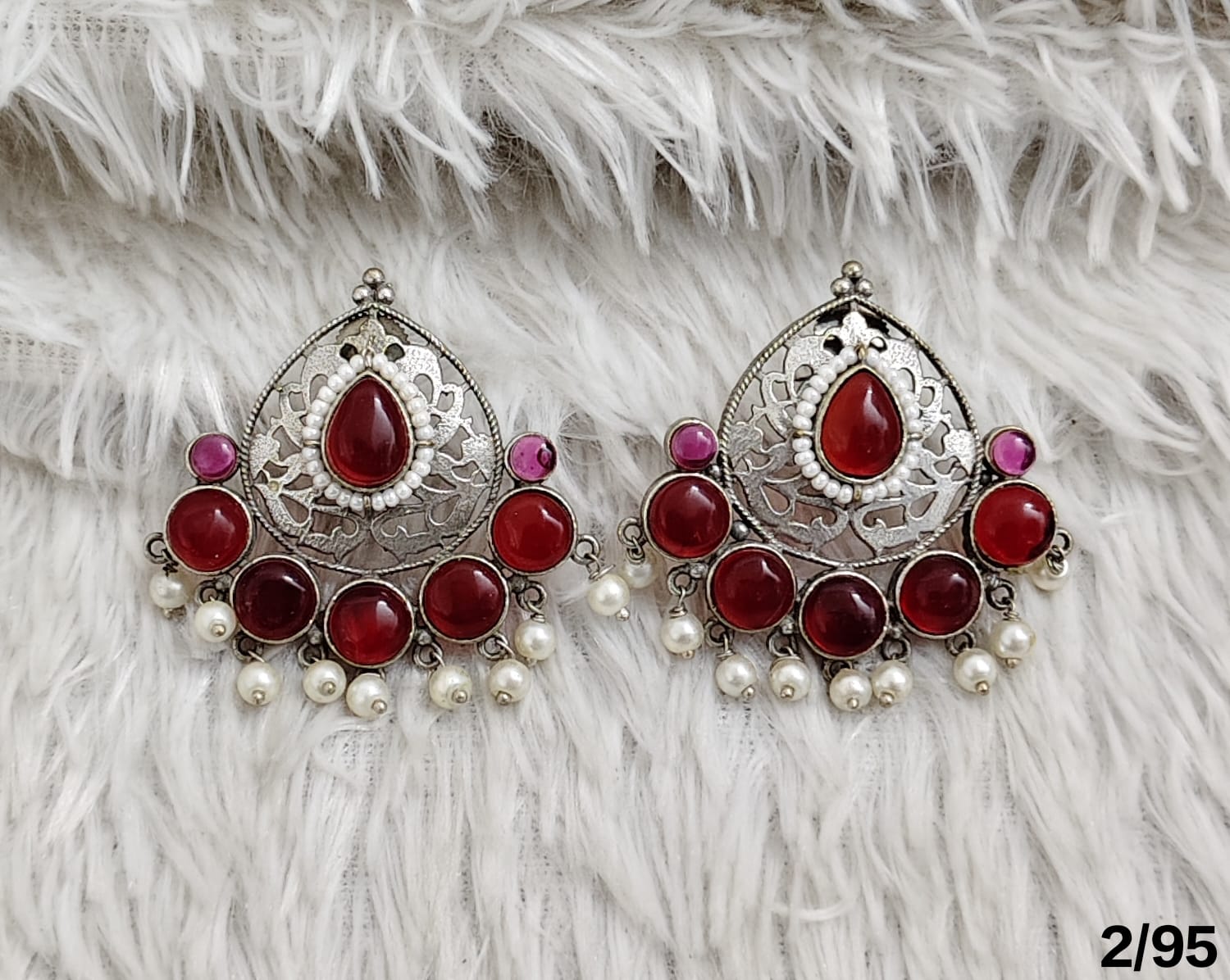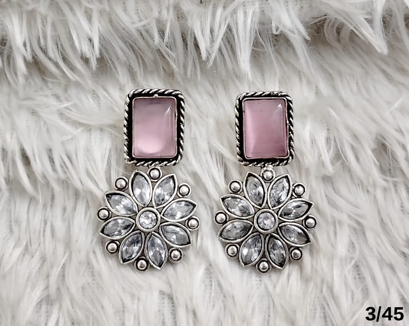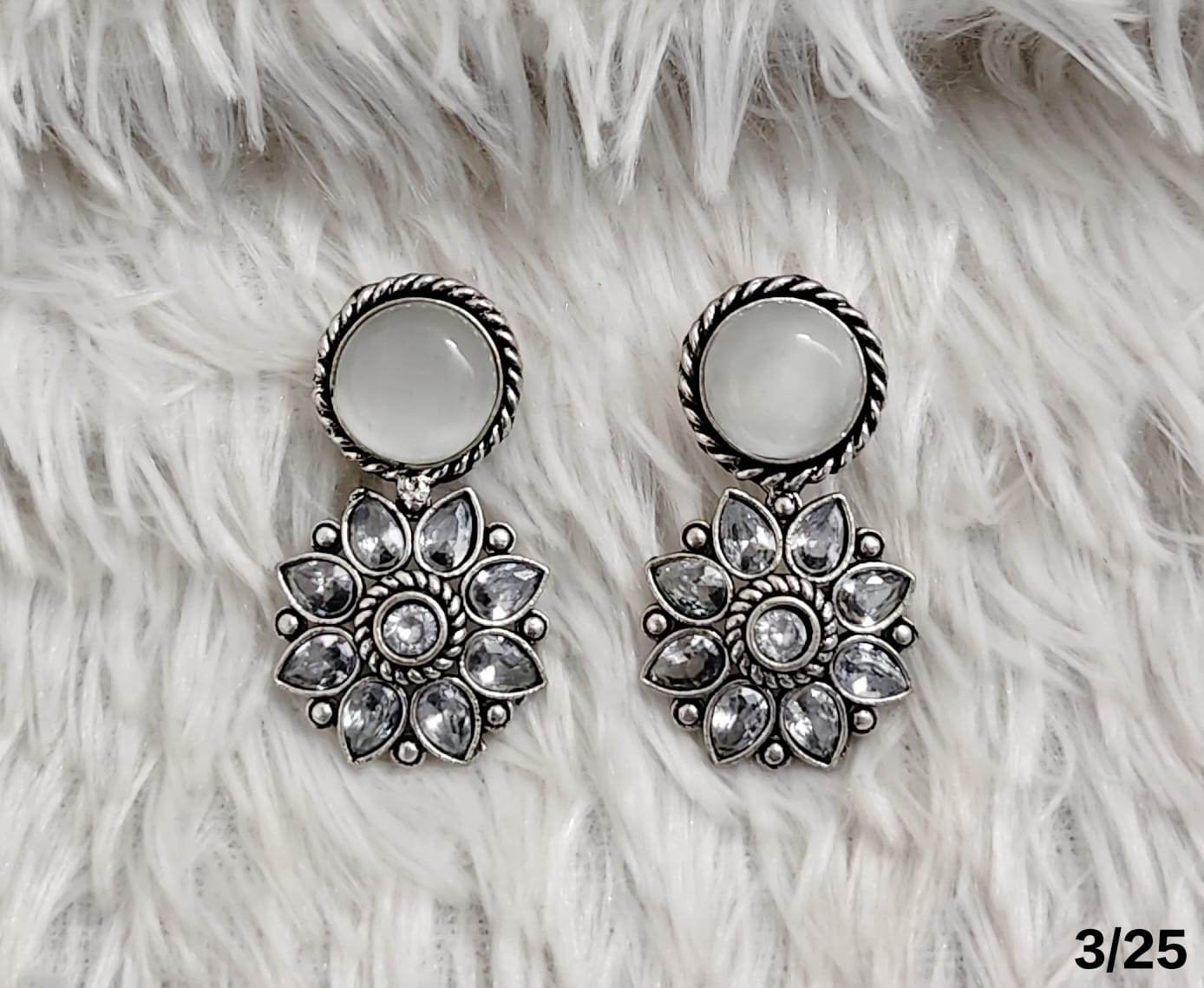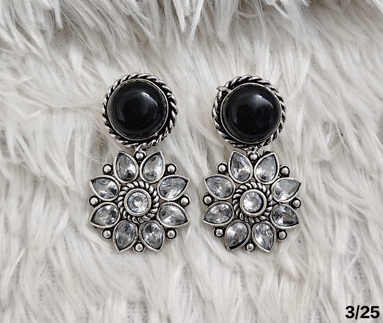 Oxidised Floral Drop Earrings with Stone Stud – Antique Silver Finish