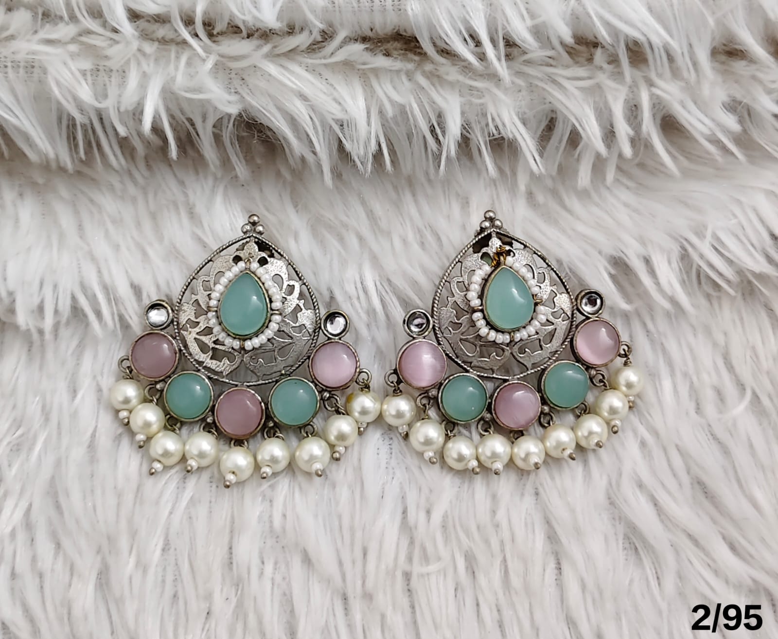 Add a touch of timeless elegance to your look with these beautifully crafted oxidized silver earrings. Featuring intricate traditional designs adorned with delicate pearl drops, these...
