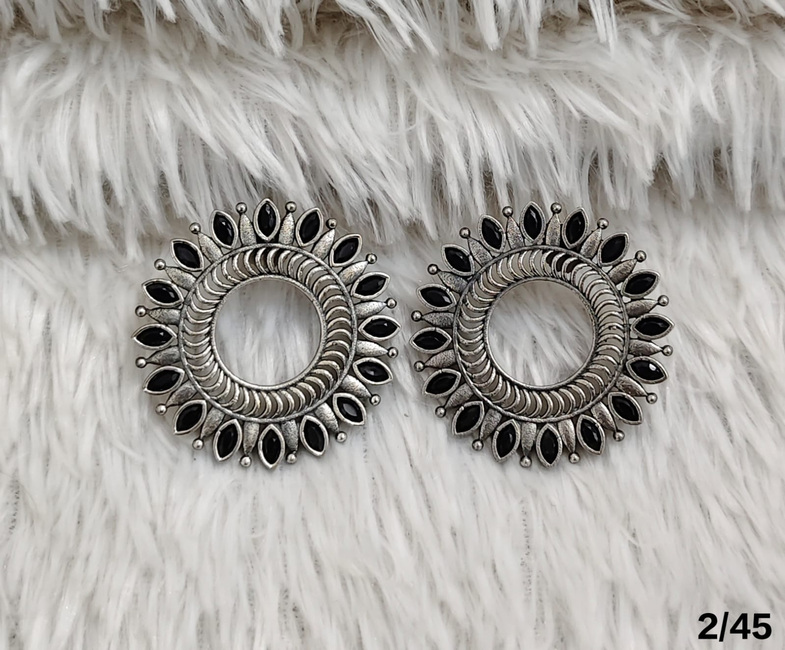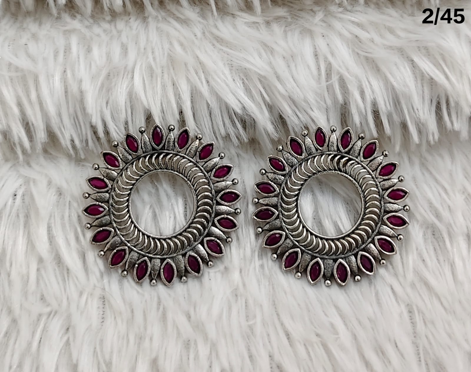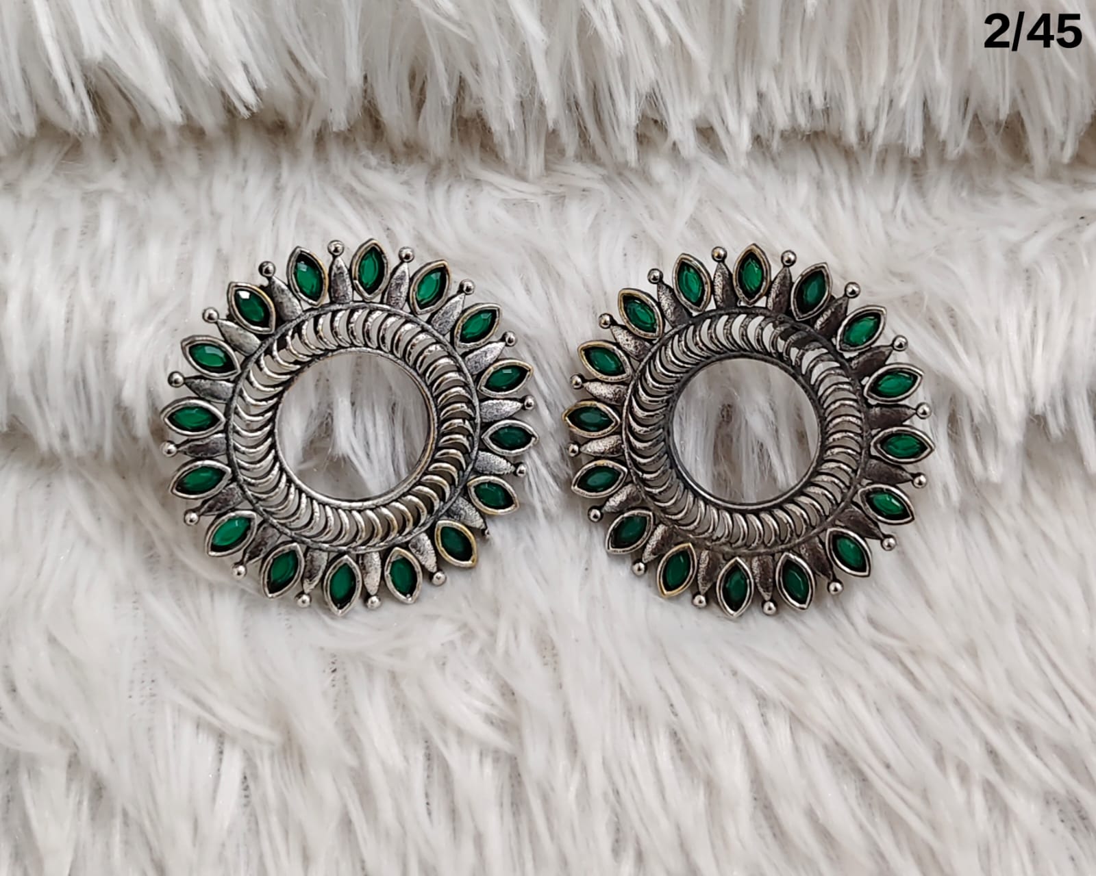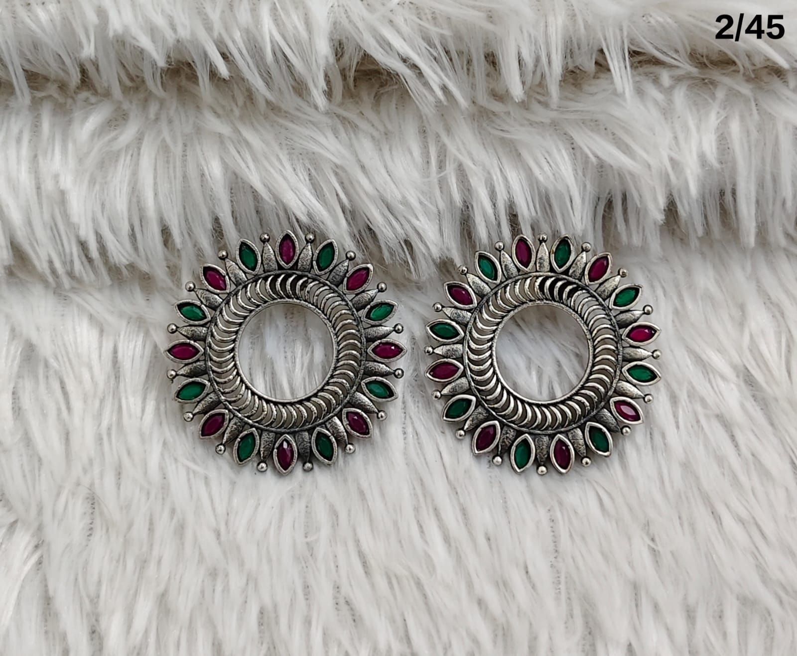 Add a touch of vintage flair to your ensemble with these intricately crafted oxidised circular stud earrings. Designed with a bold round frame and detailed with...