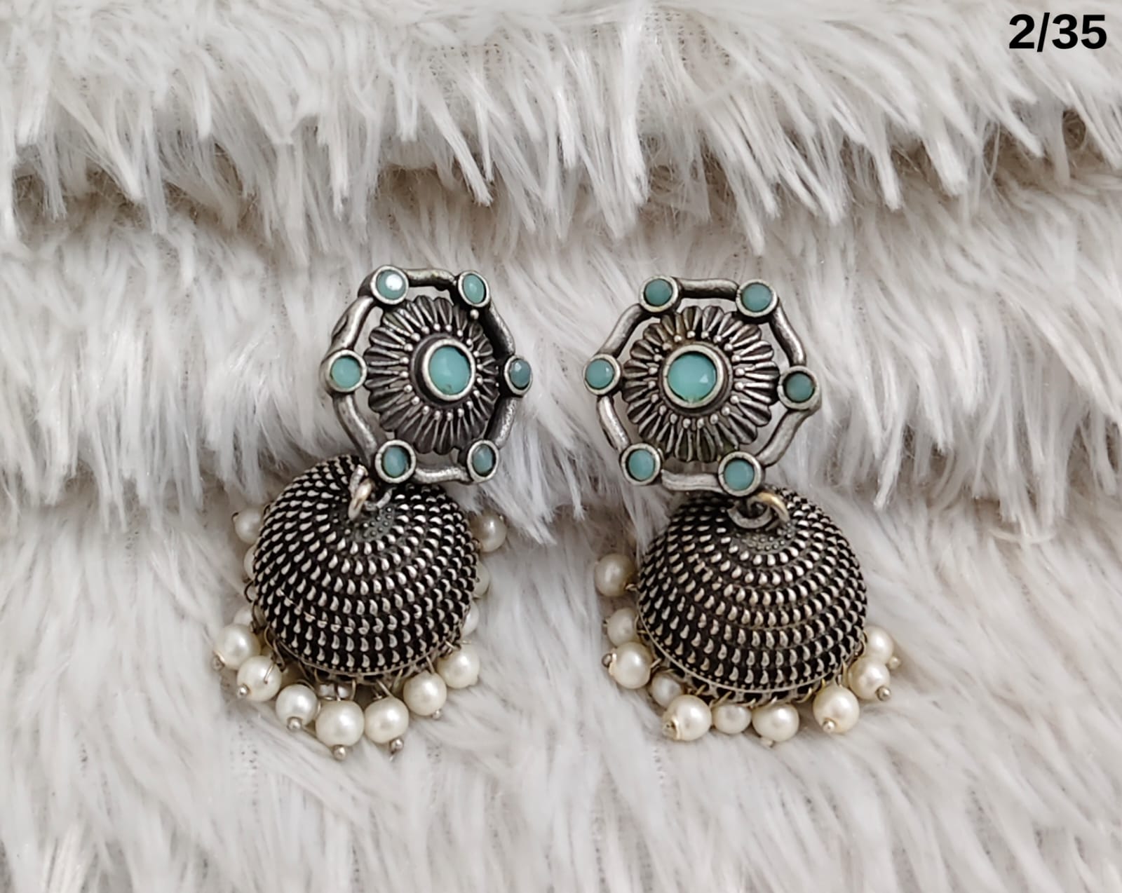 Elevate your ethnic style with these beautifully crafted oxidised dome earrings featuring a floral-inspired stud and intricately textured jhumka design. Finished with delicate pearl-like danglers, these...
