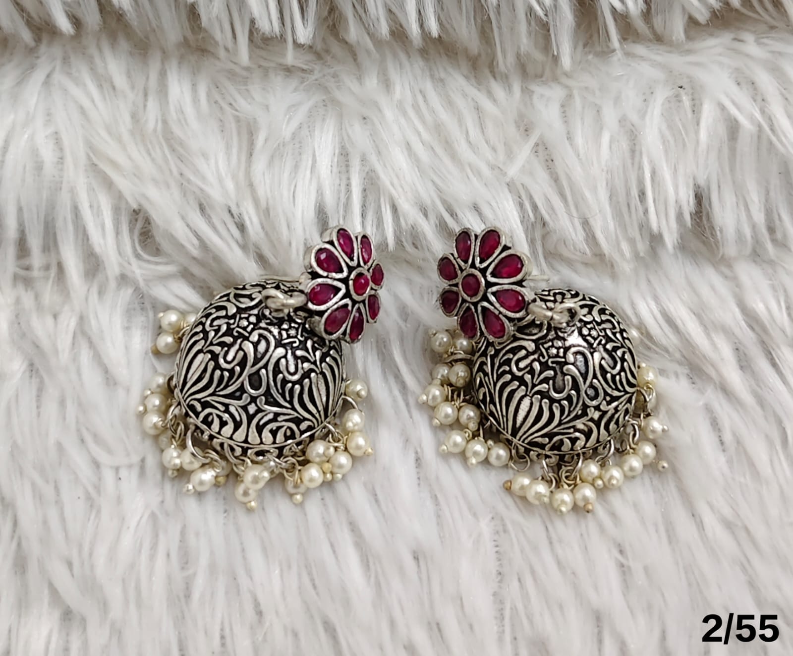 Oxidised Dome Earrings with Floral Stud and Pearl Detailing – Ethnic Design