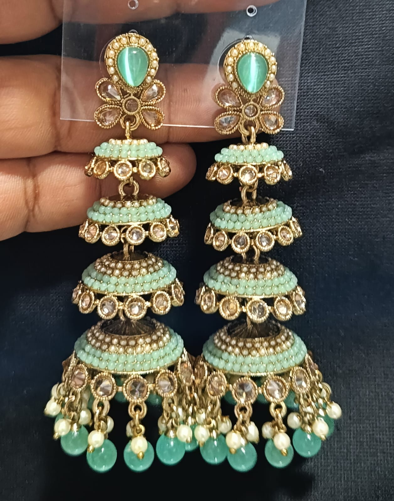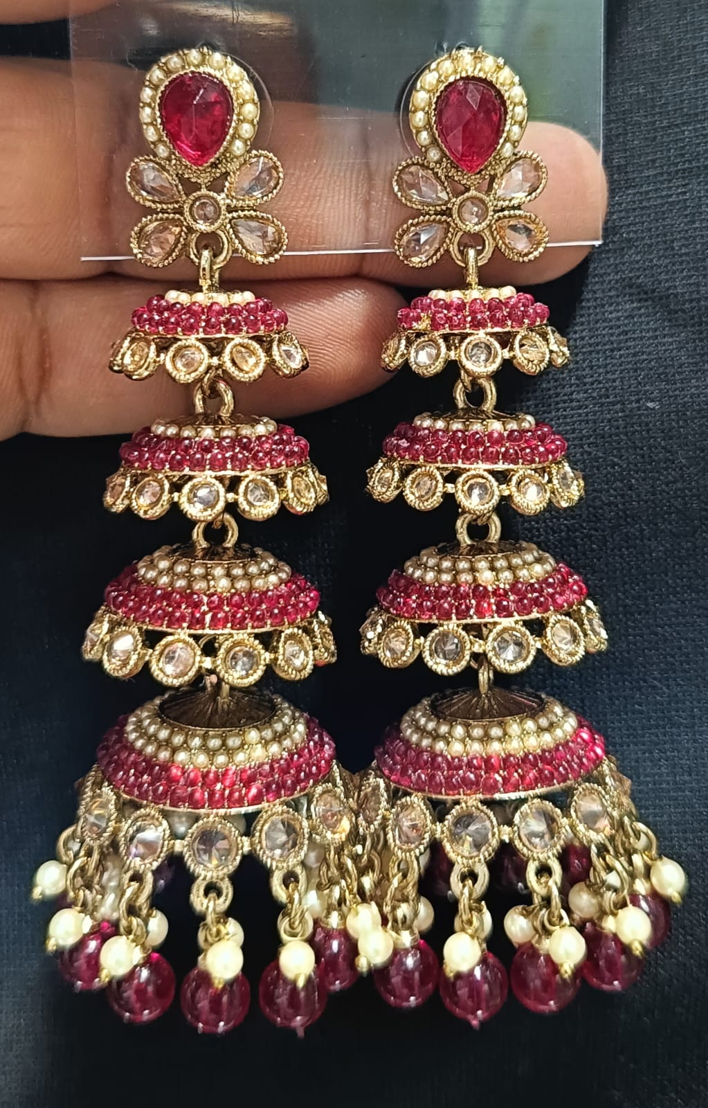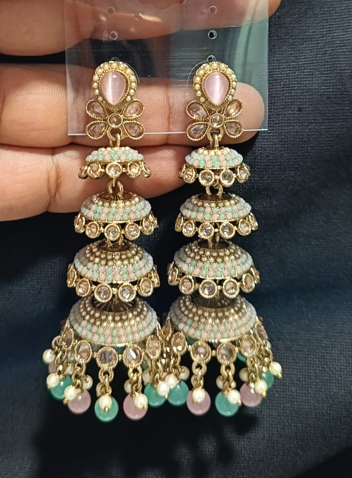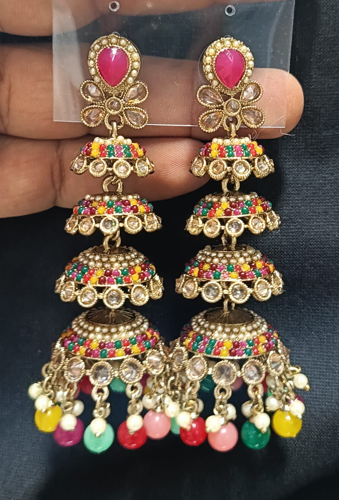 Multi-Tier CZ Jhumka Earrings with Dangling Beads - Lucentemarket
