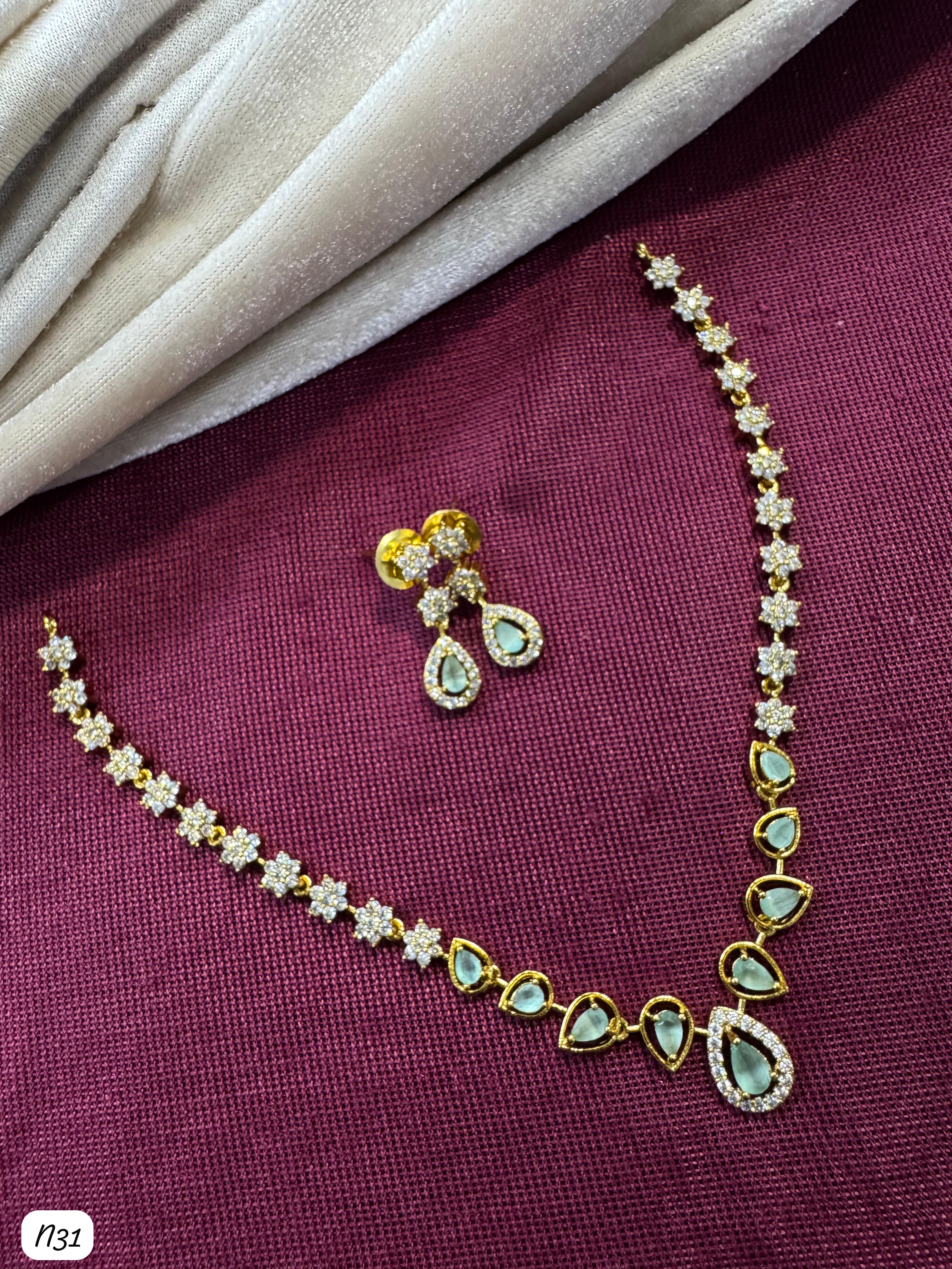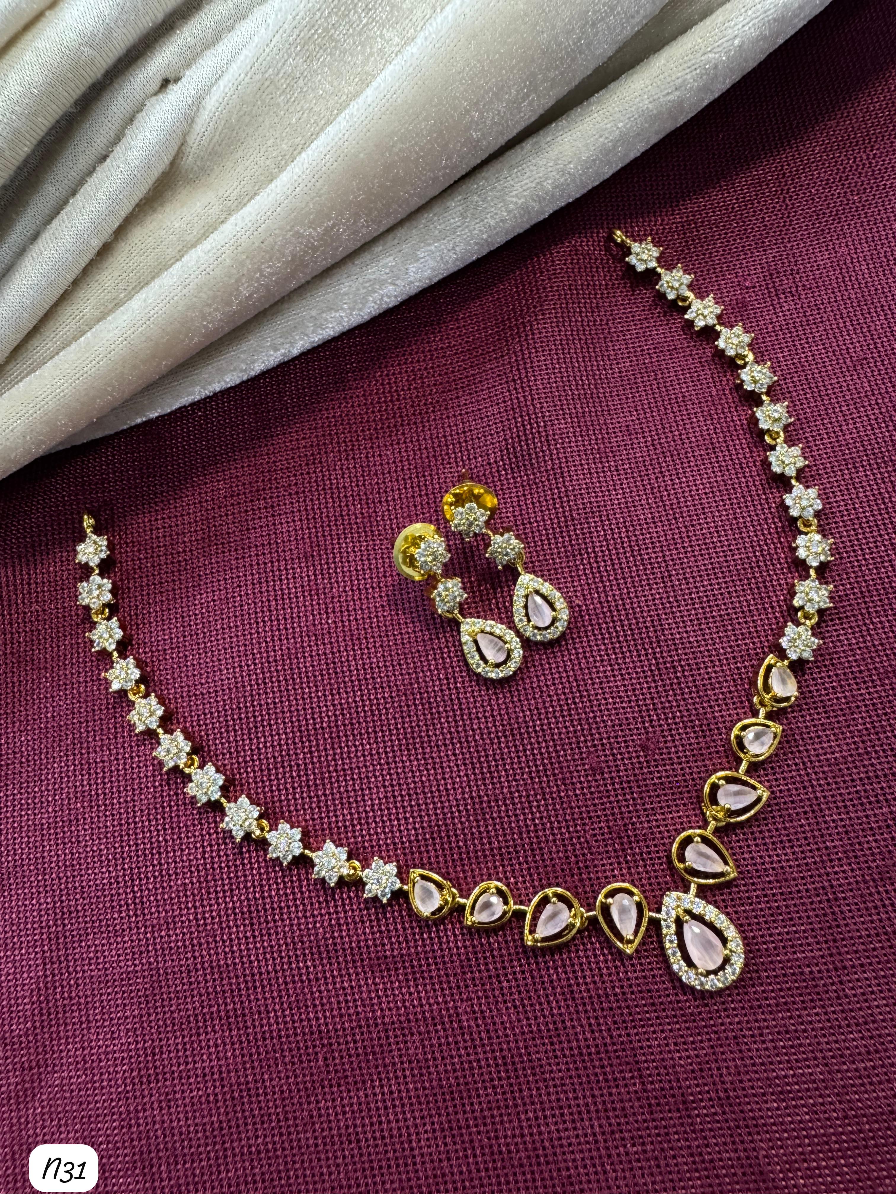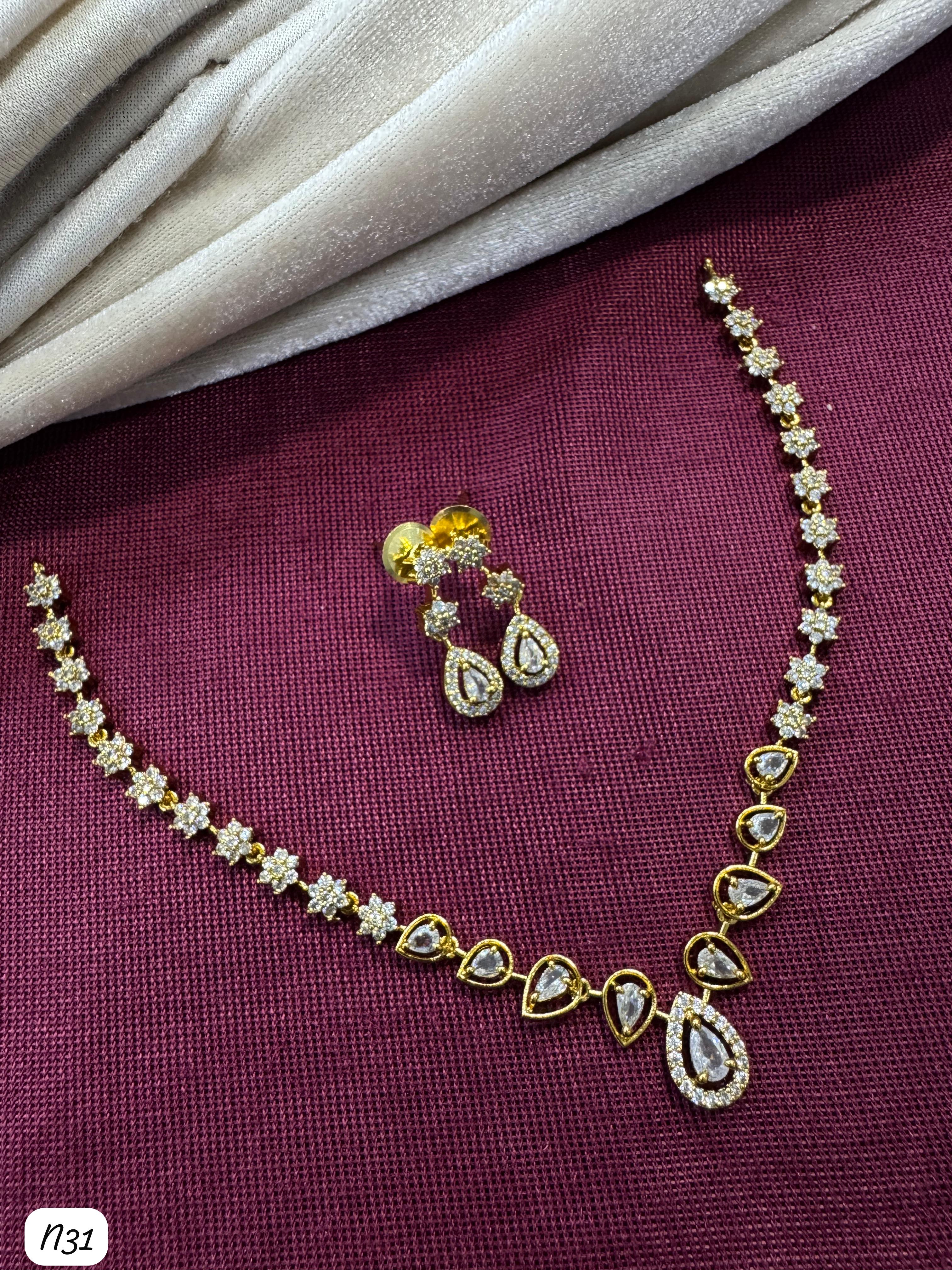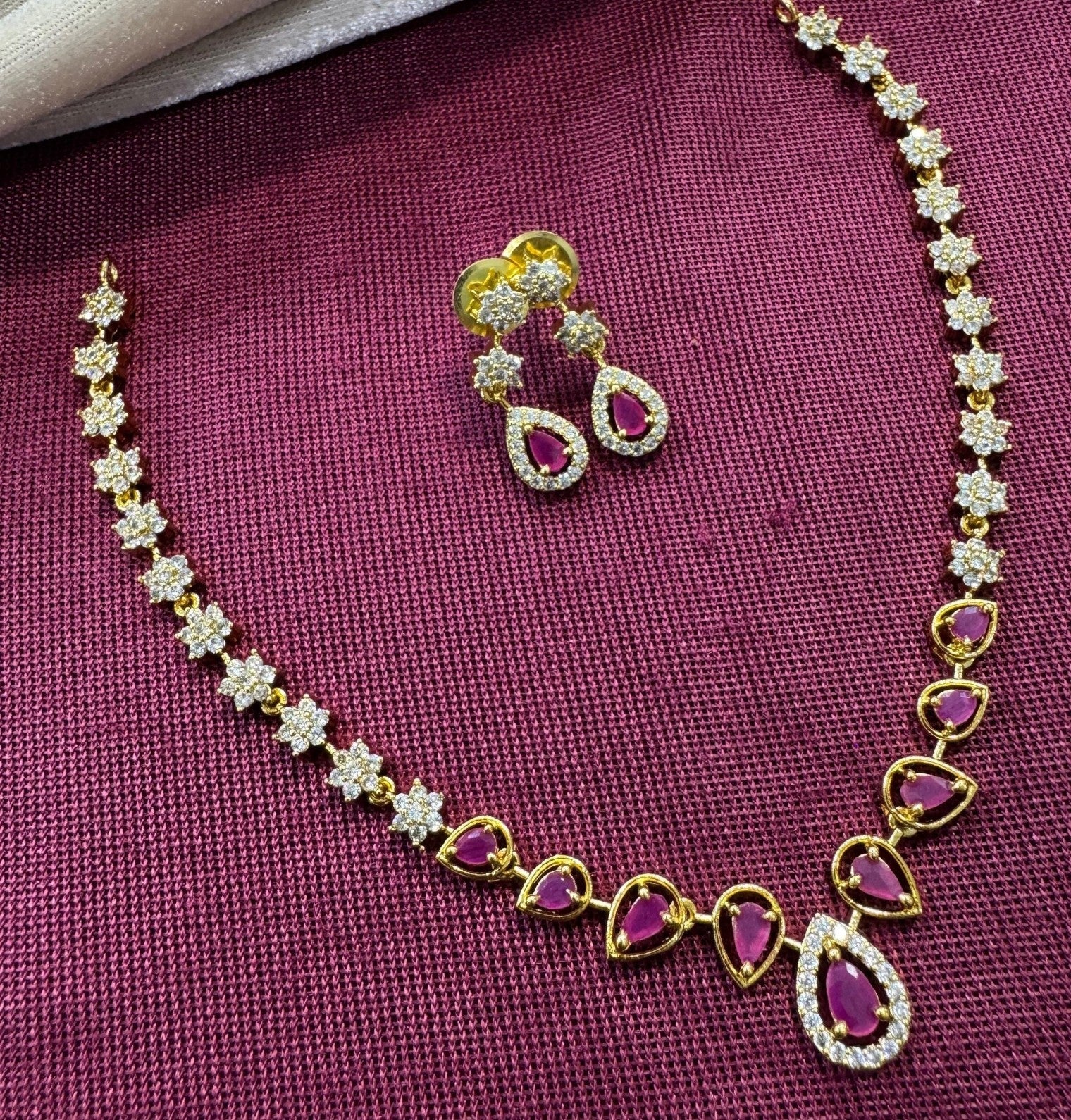 This stunning piece features a cascading design with shimmering teardrop and oval-cut American diamonds, beautifully accented by lustrous stones that elevate its traditional charm. The intricate...