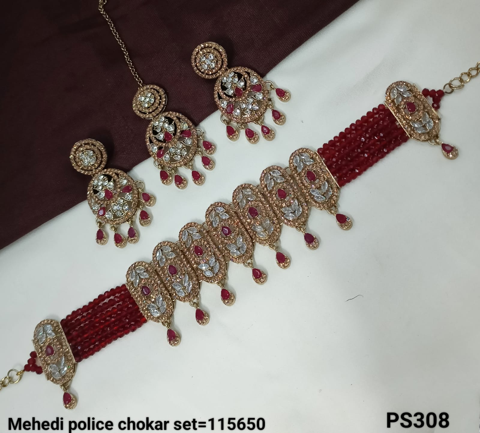Elegant Mehedi Police Choker Set with Detailed Pendant and Matching Earrings