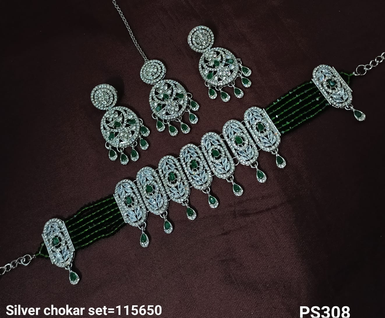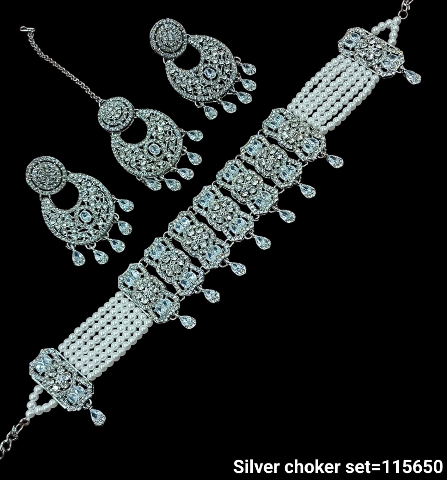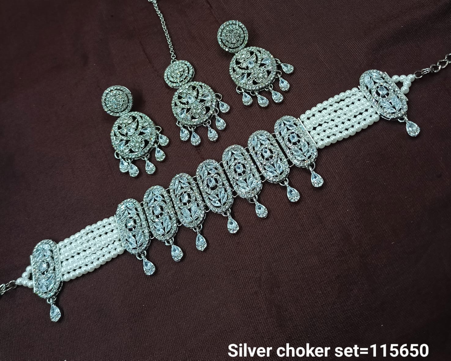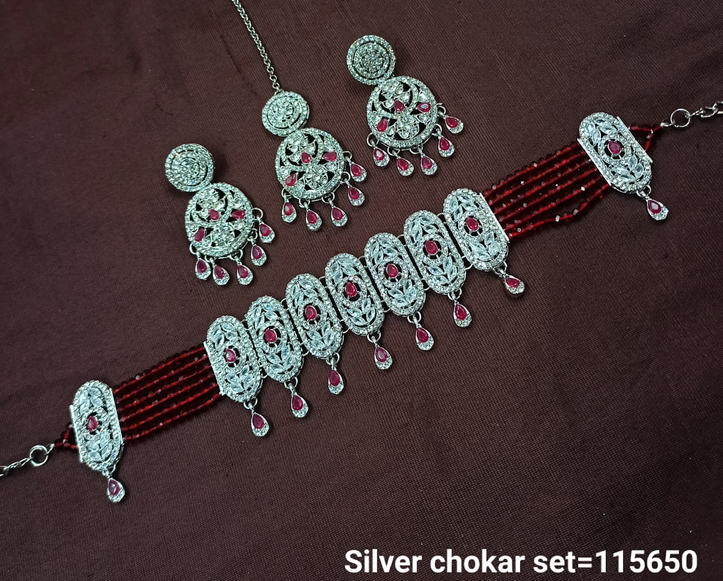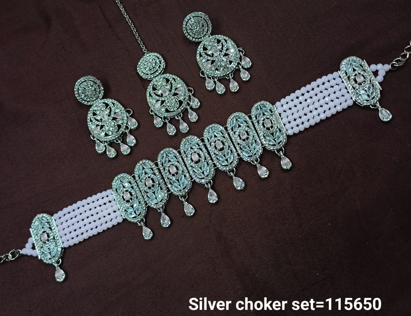Elegant Silver Choker Set with Intricate Detailing and Matching Earrings