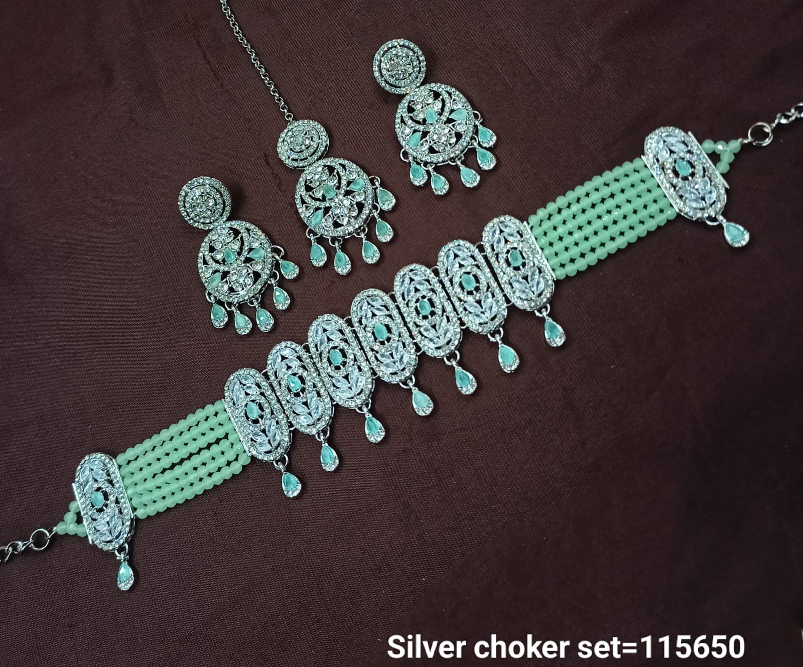 Elevate your style with this exquisite silver choker set, featuring intricate craftsmanship and detailed embellishments. The matching earrings complement the choker perfectly, making it an ideal...