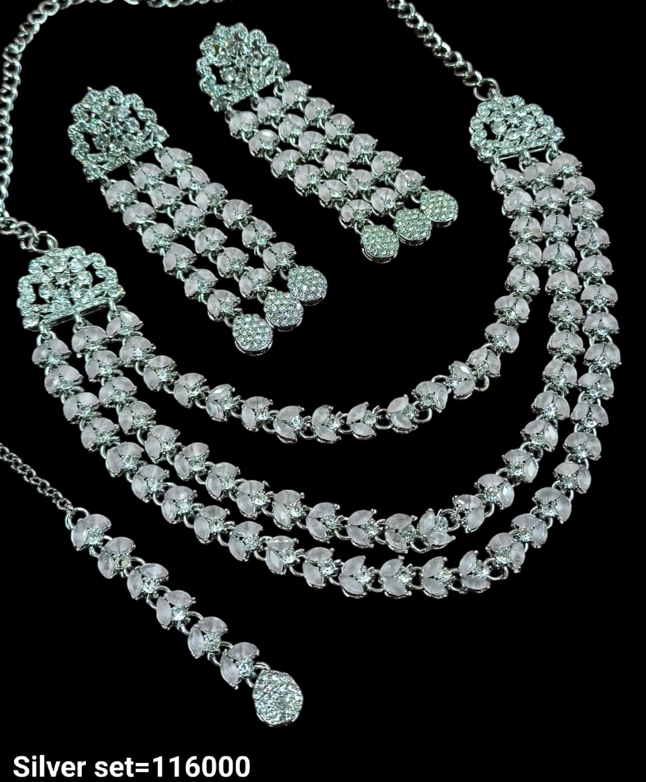 This elegant silver necklace and earring set showcases intricate detailing that reflects refined craftsmanship. Crafted from high-quality silver, it offers both durability and a radiant finish....