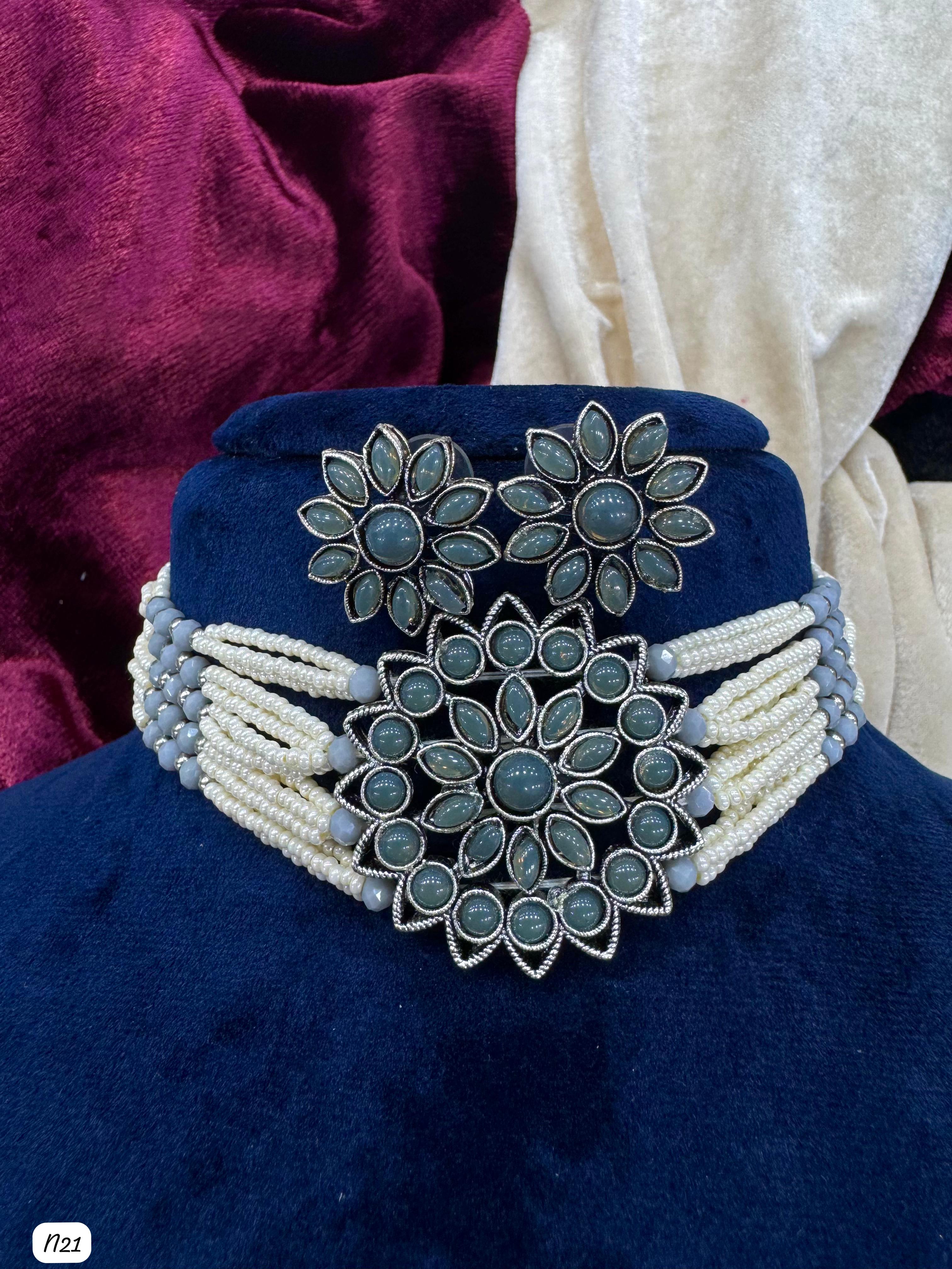 Elevate your look with this exquisite handcrafted choker necklace set featuring a bold floral centerpiece. Designed with multiple strands of delicate beads, this set offers a...