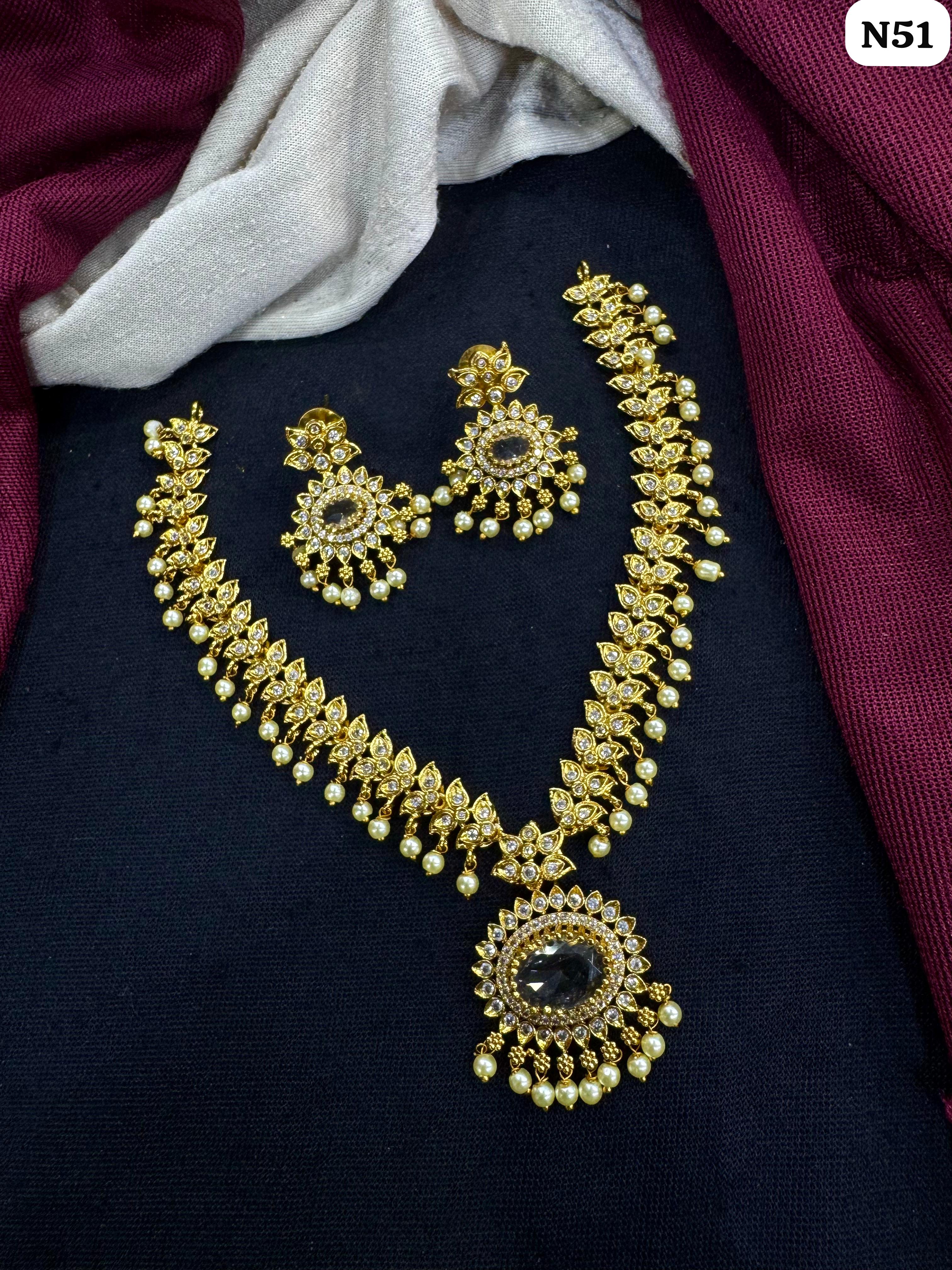 This Premium Gold-Plated AD Necklace Set is a blend of elegance and tradition, designed to enhance your ethnic attire. Featuring intricate floral motifs adorned with high-quality...