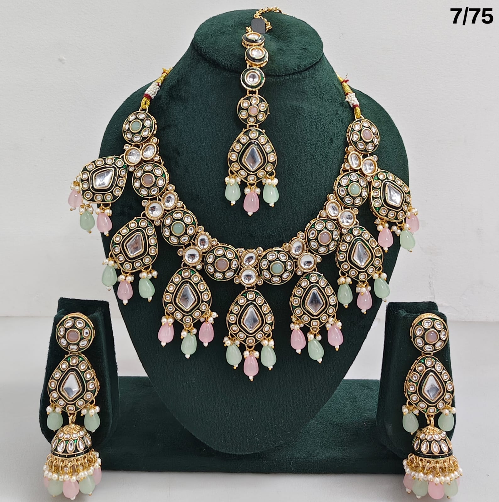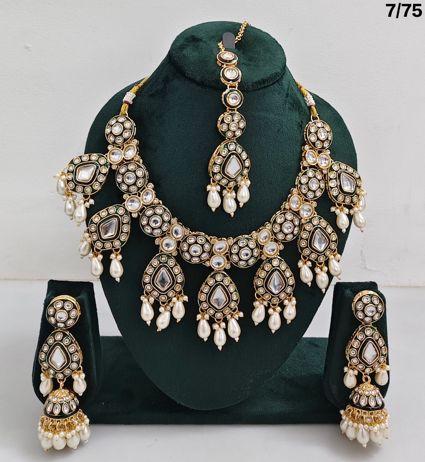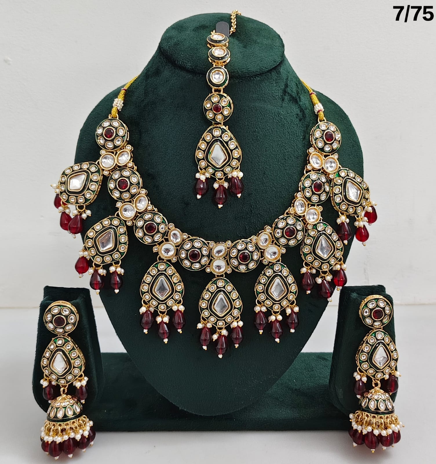 Enhance your bridal and festive look with this Kundan stone necklace set, beautifully crafted with intricate stonework, hanging pearls, and delicate beads. The set includes a...