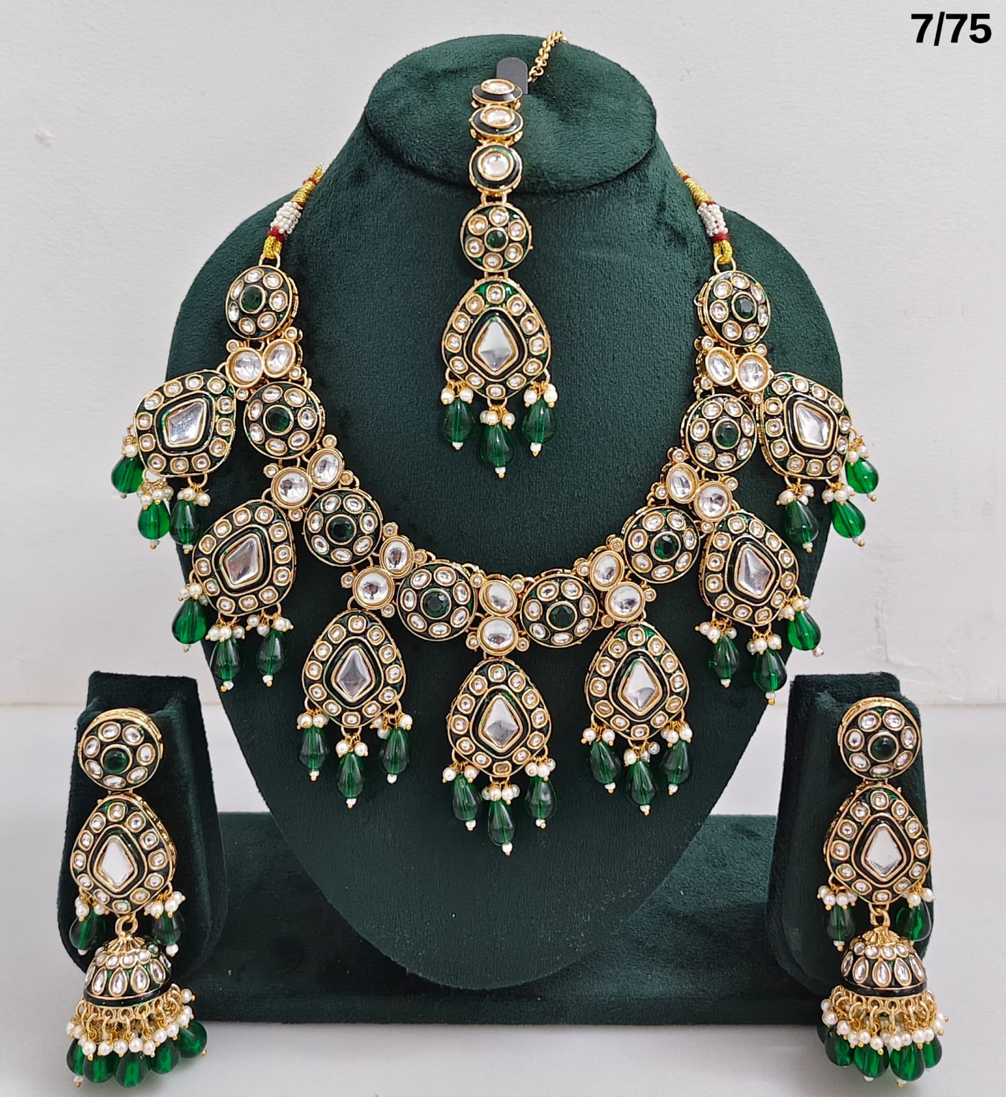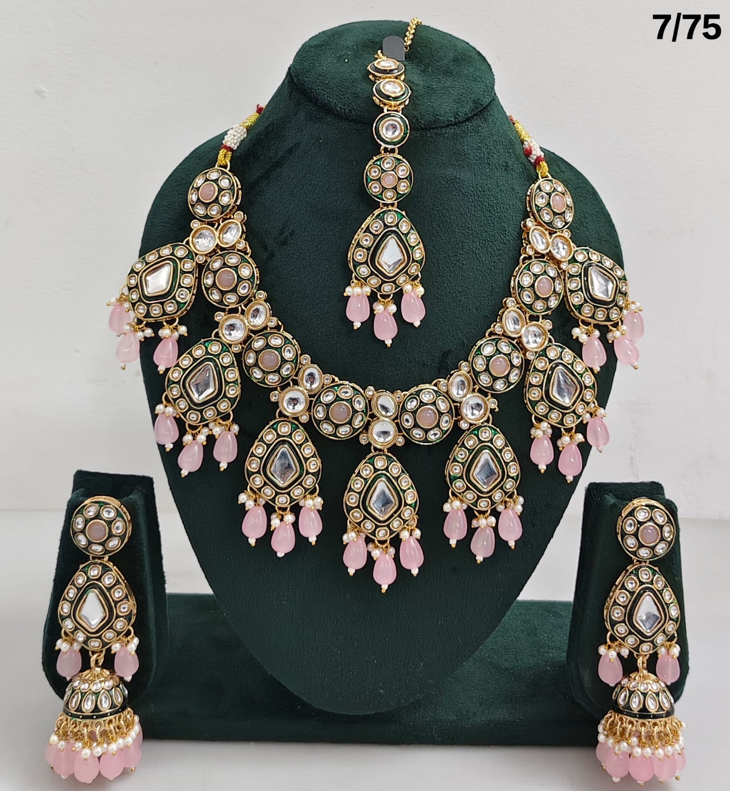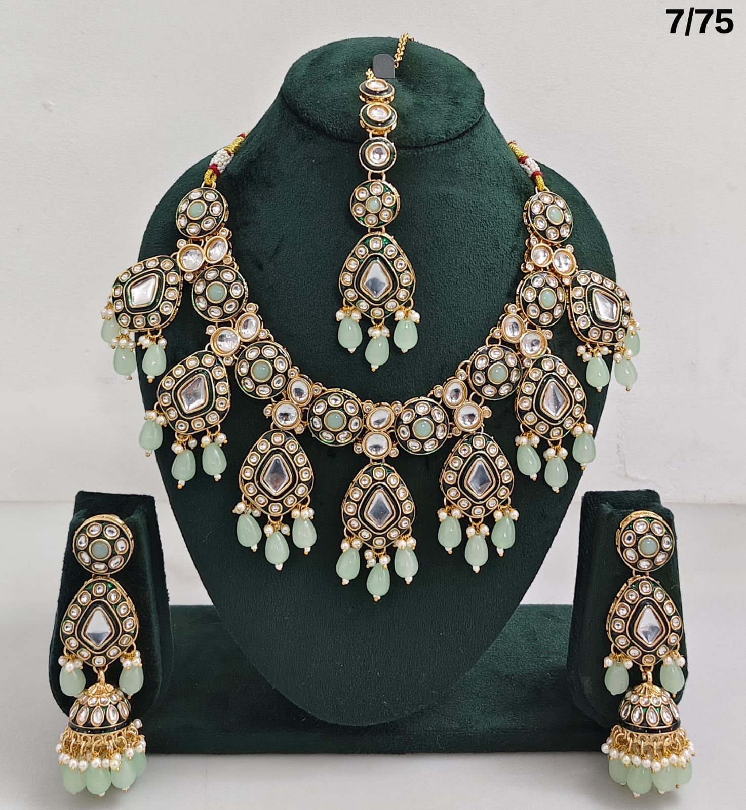 Enhance your bridal and festive look with this Kundan stone necklace set, beautifully crafted with intricate stonework, hanging pearls, and delicate beads. The set includes a...