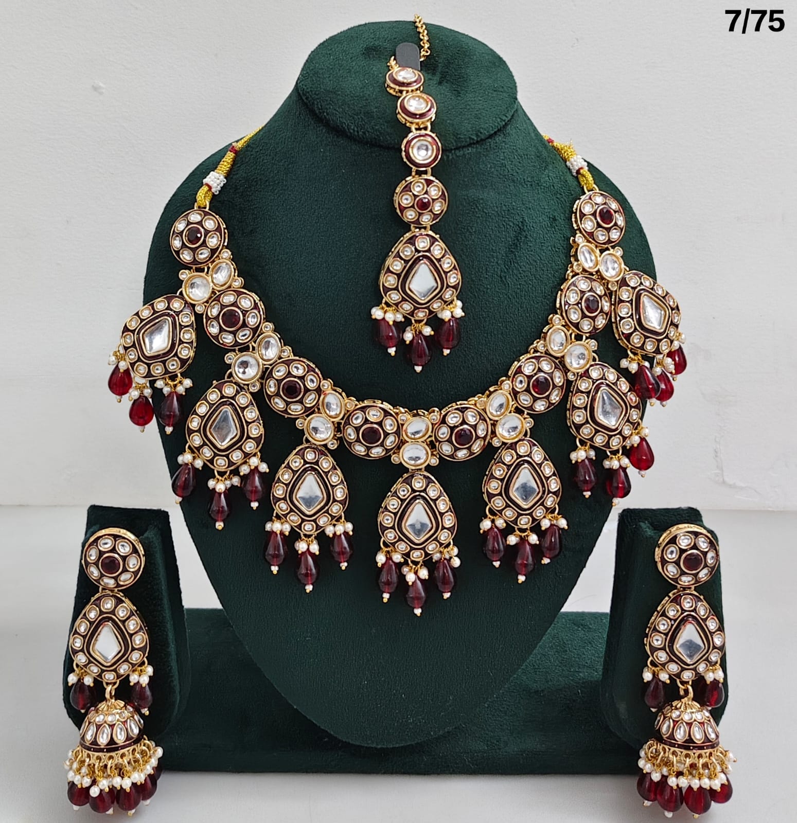 Kundan Stone Necklace Set with Hanging Pearls & Beads – Earrings & Maang Tikka Included