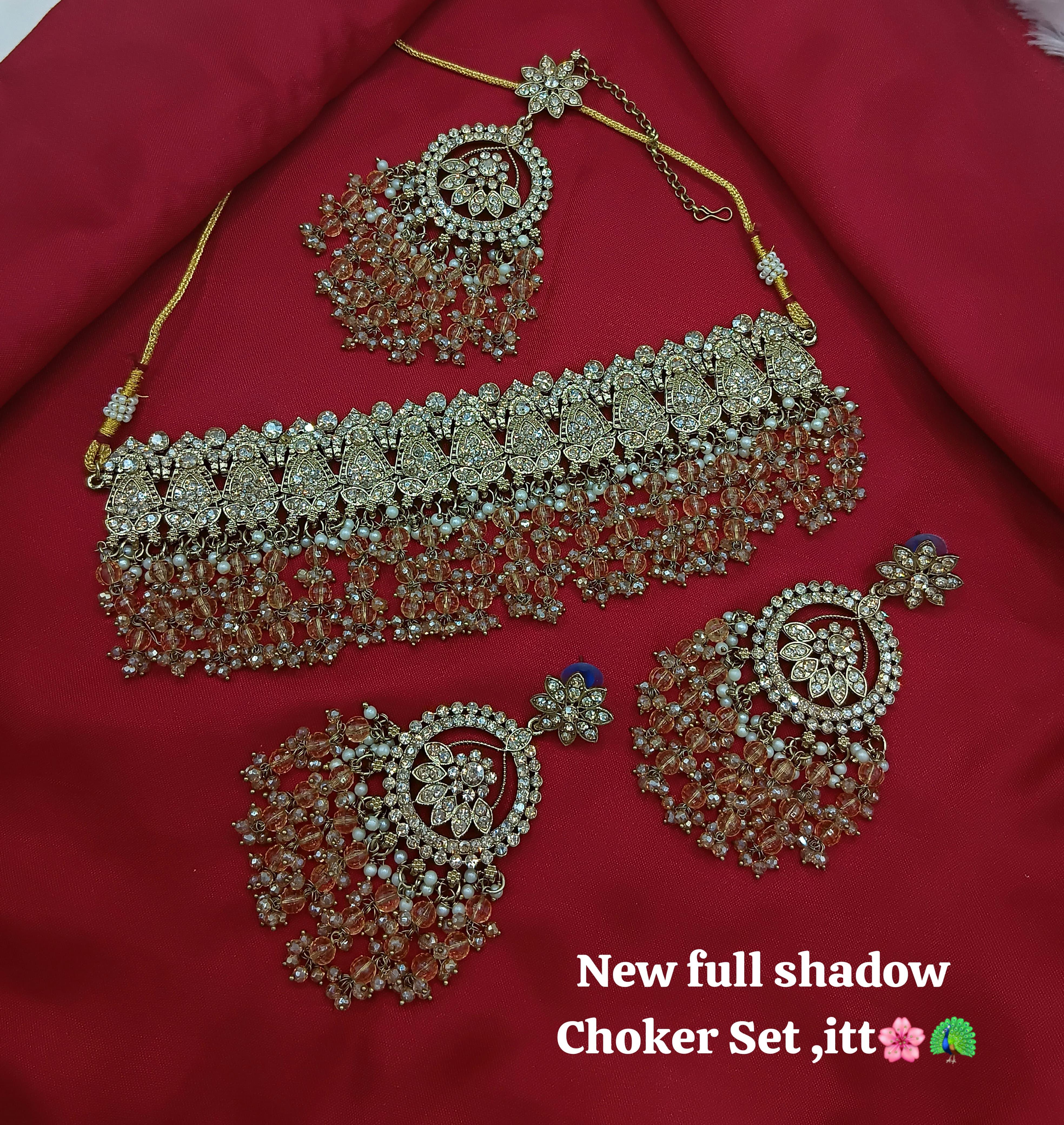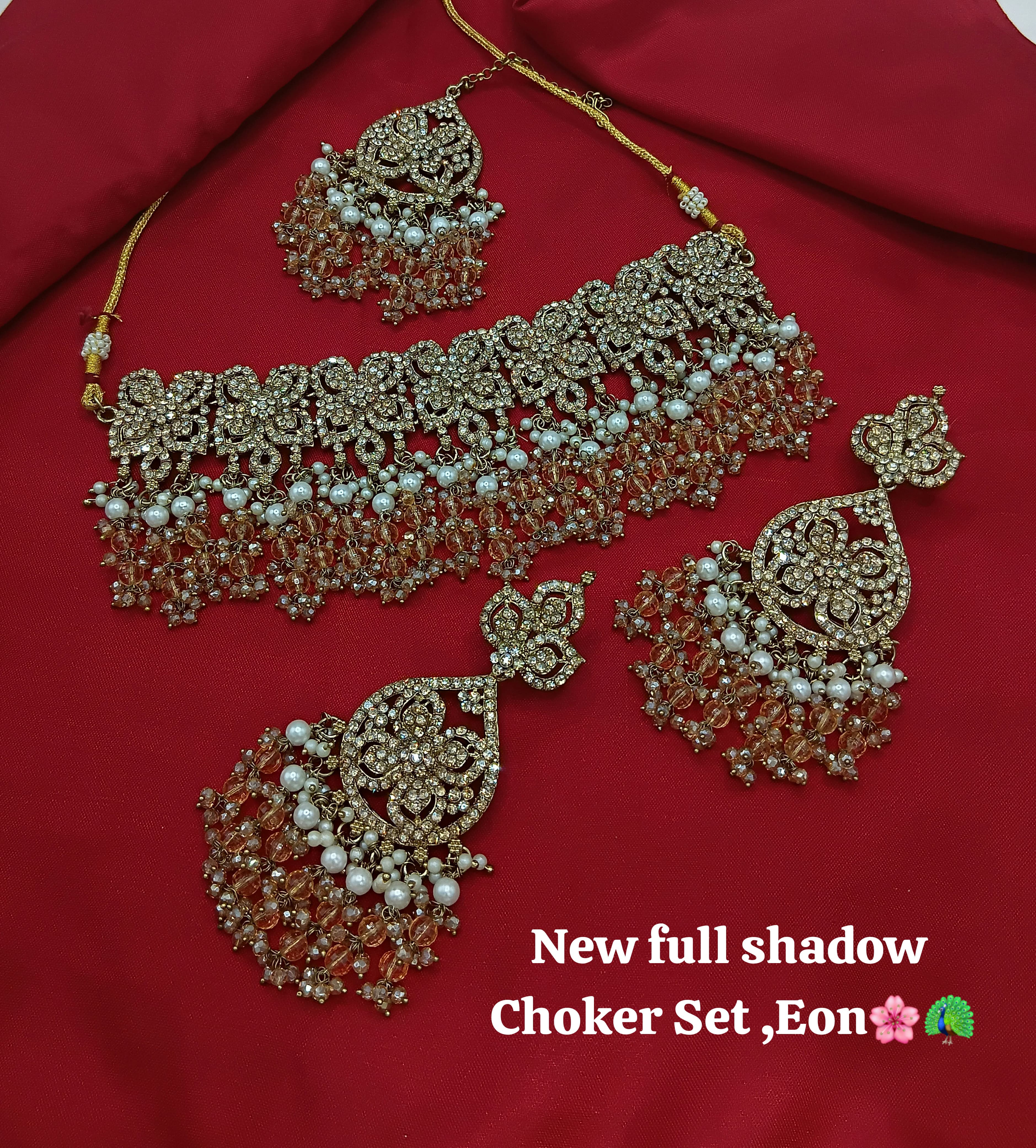 This Full Shadow Choker Necklace Set is an exquisite blend of elegance and traditional charm, featuring intricate floral motifs adorned with sparkling stones. The choker is...