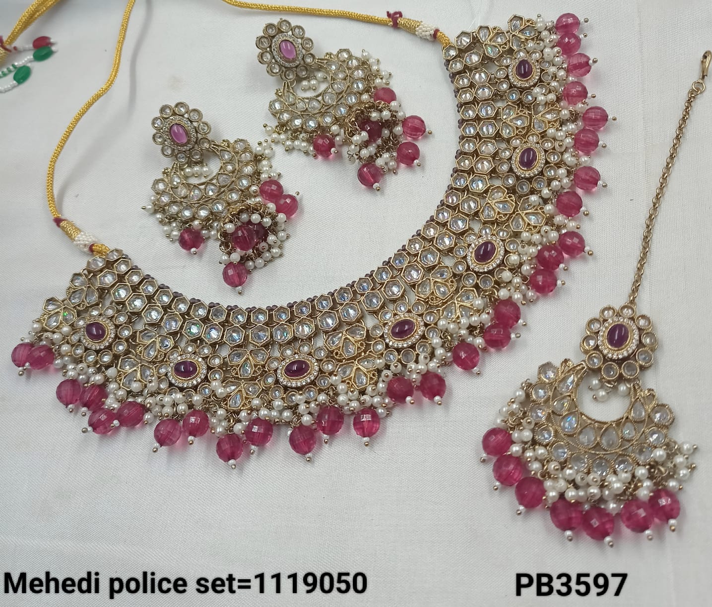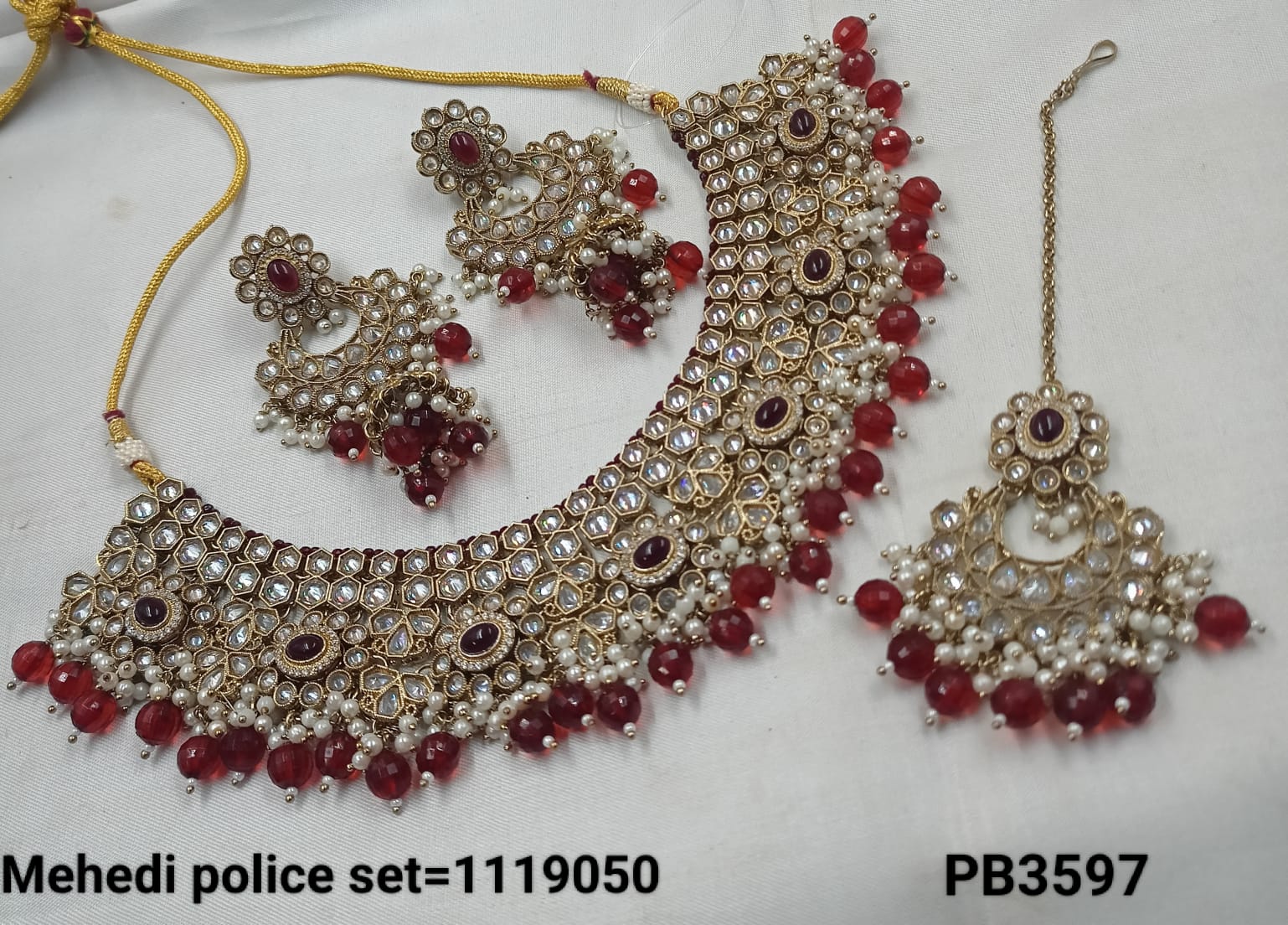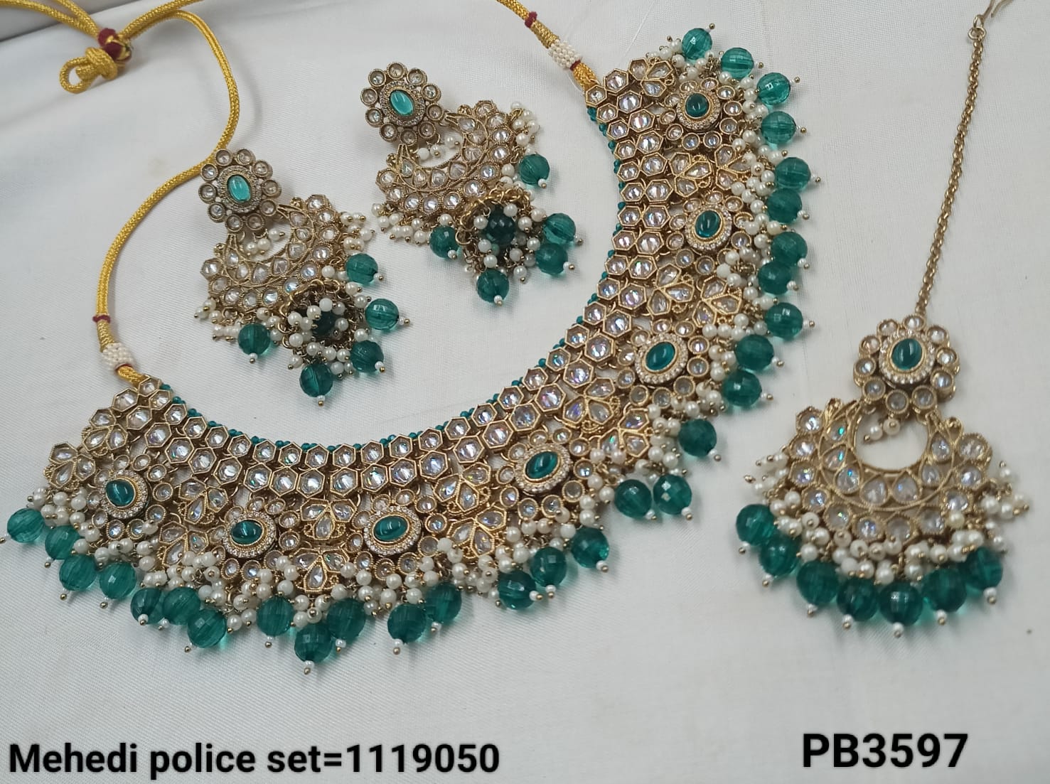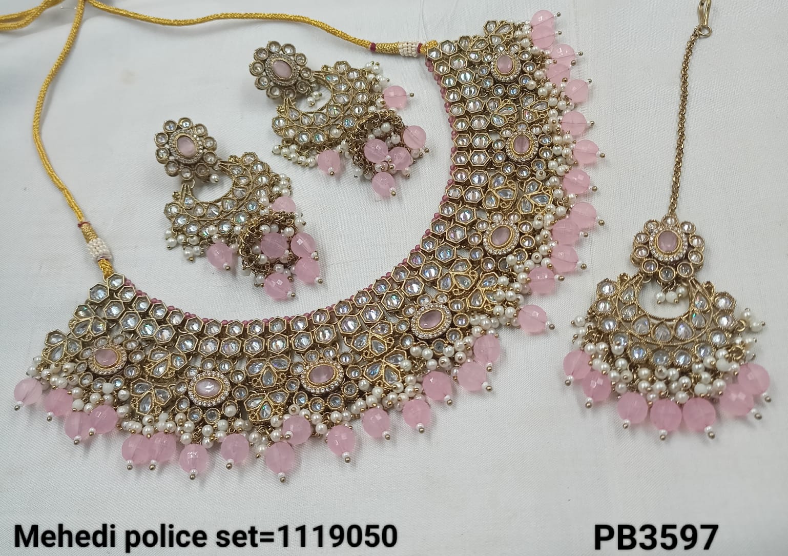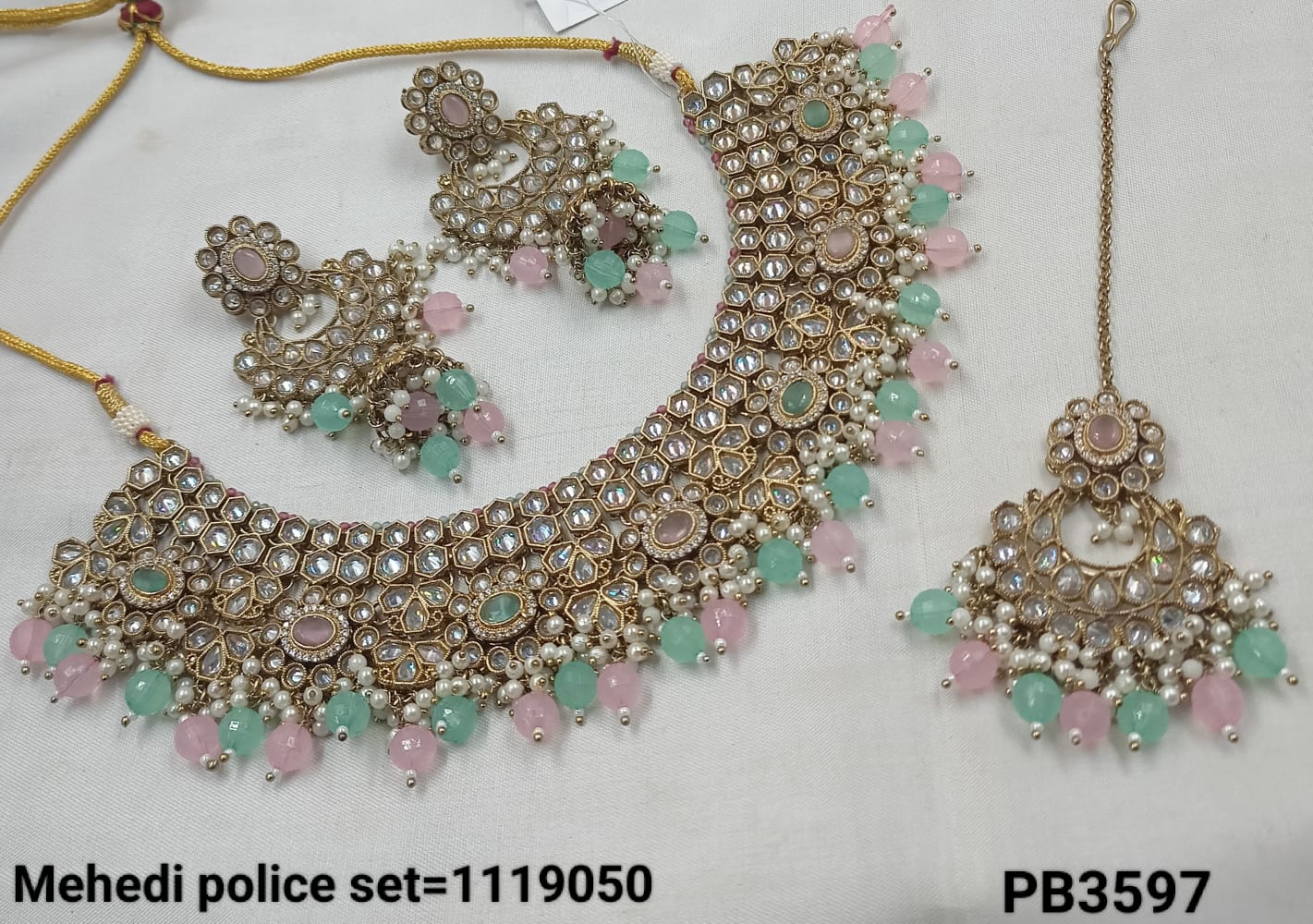 This exquisite choker necklace set features an antique gold plating complemented by lustrous pearls, combining timeless elegance with expert craftsmanship. It Has A Pack Of :-1...