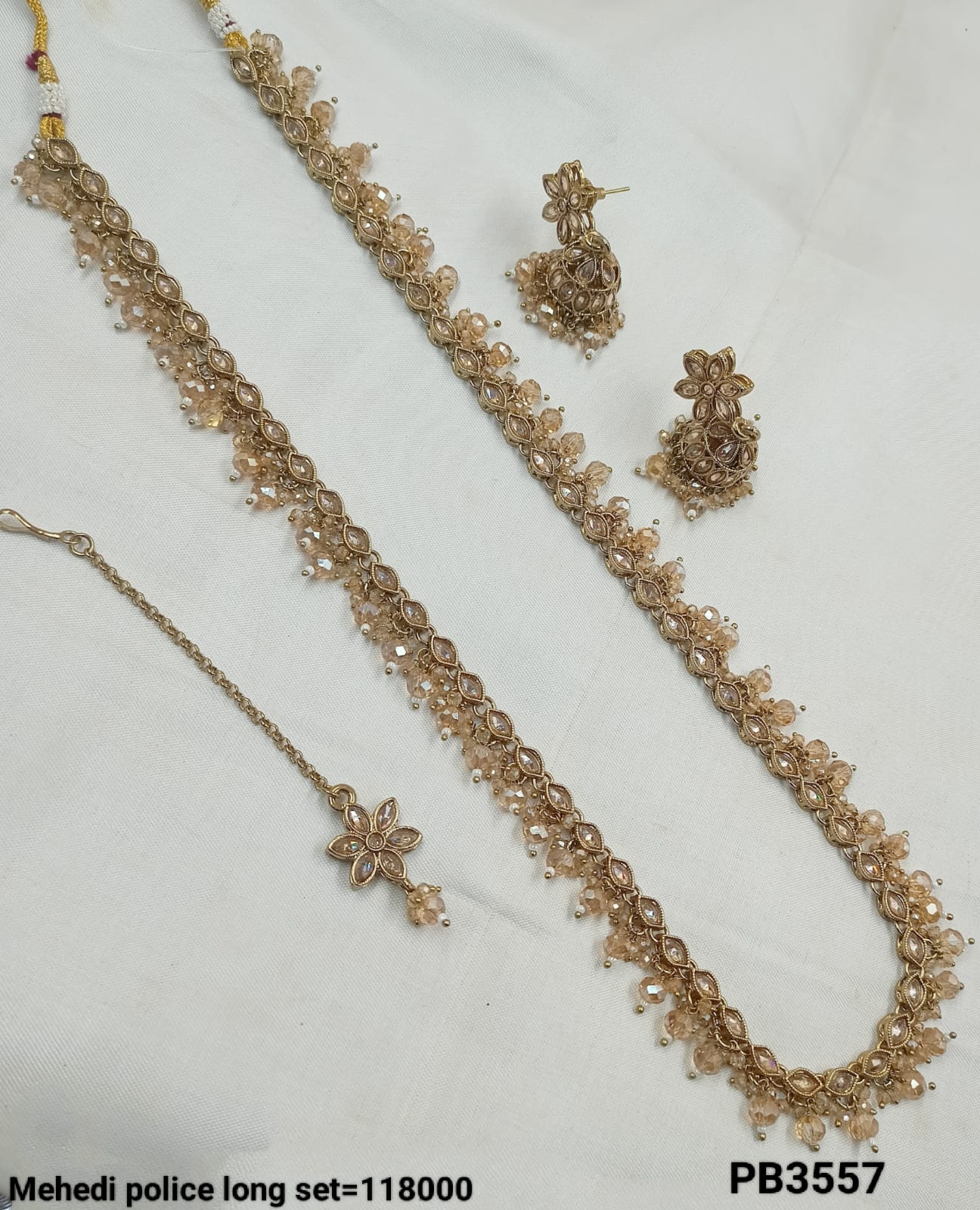 This exquisite long jewellery set features a traditional design with an antique gold plating, offering a timeless and elegant accessory for special occasions. It Has A...