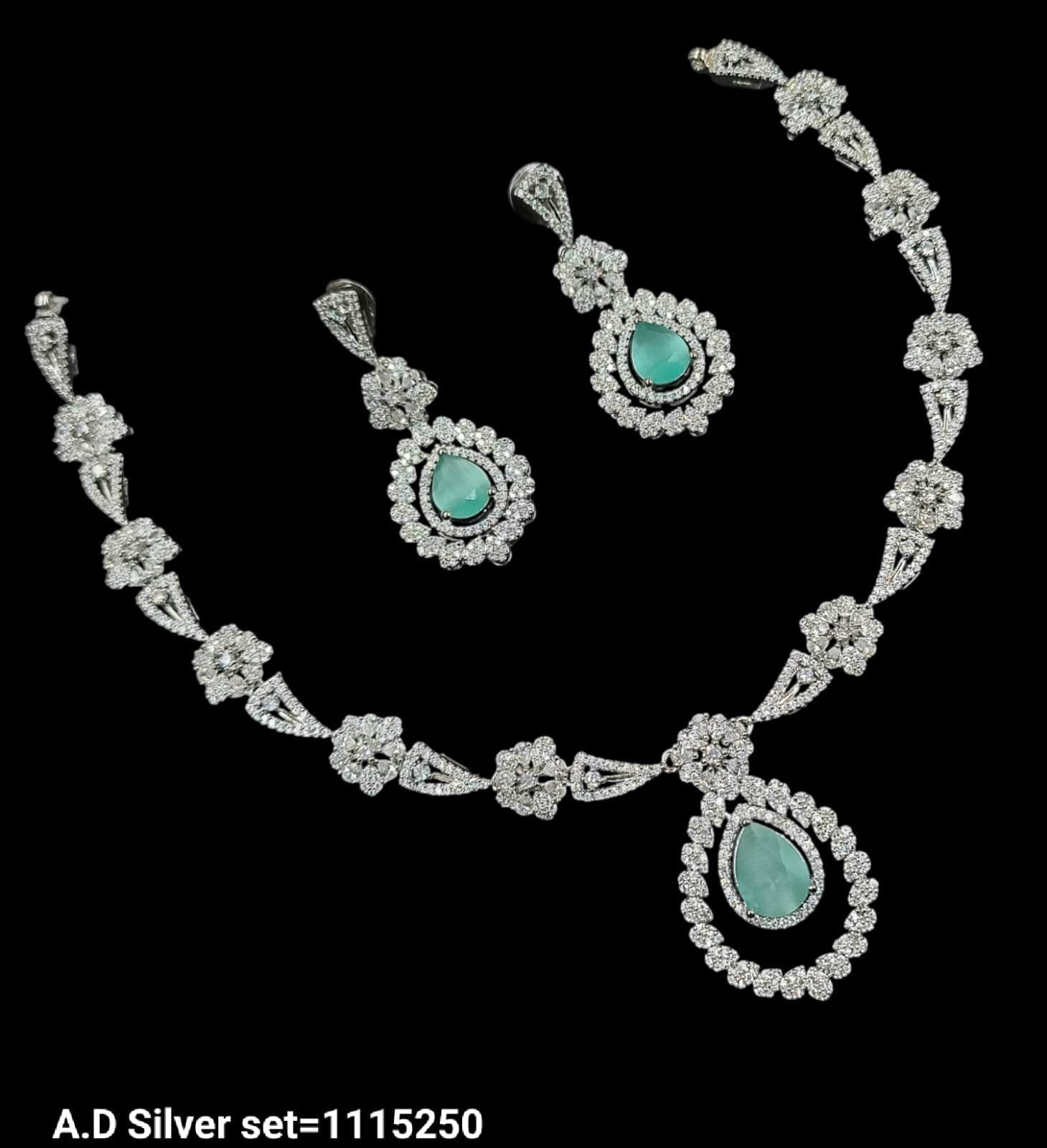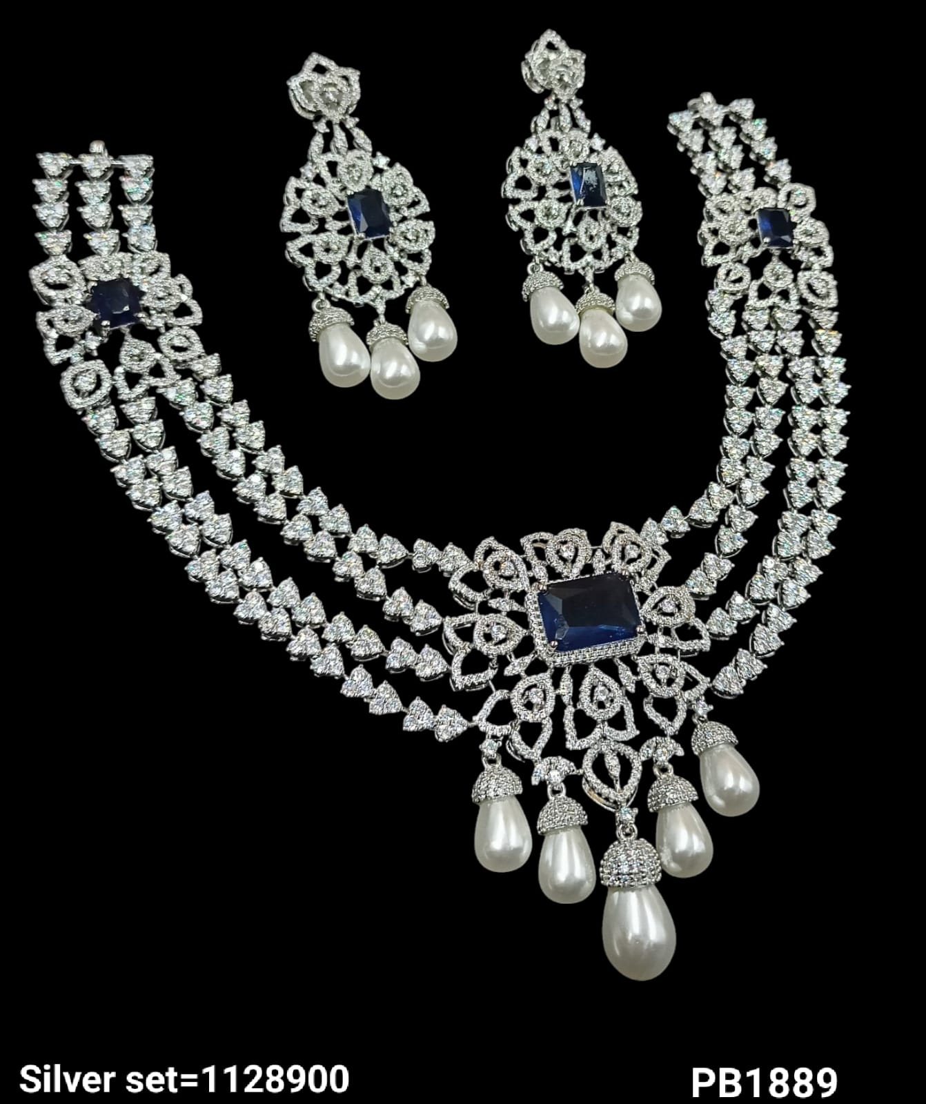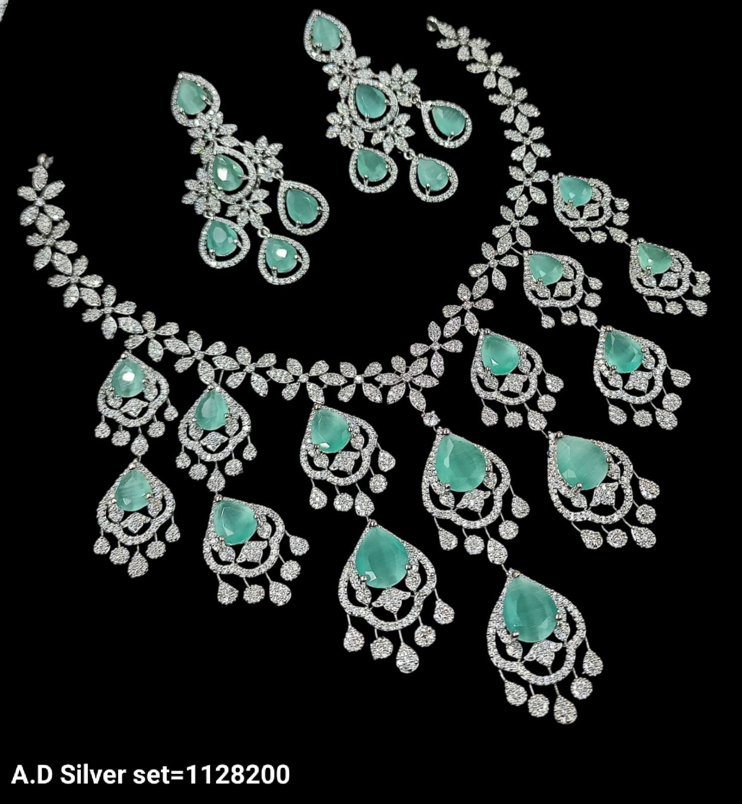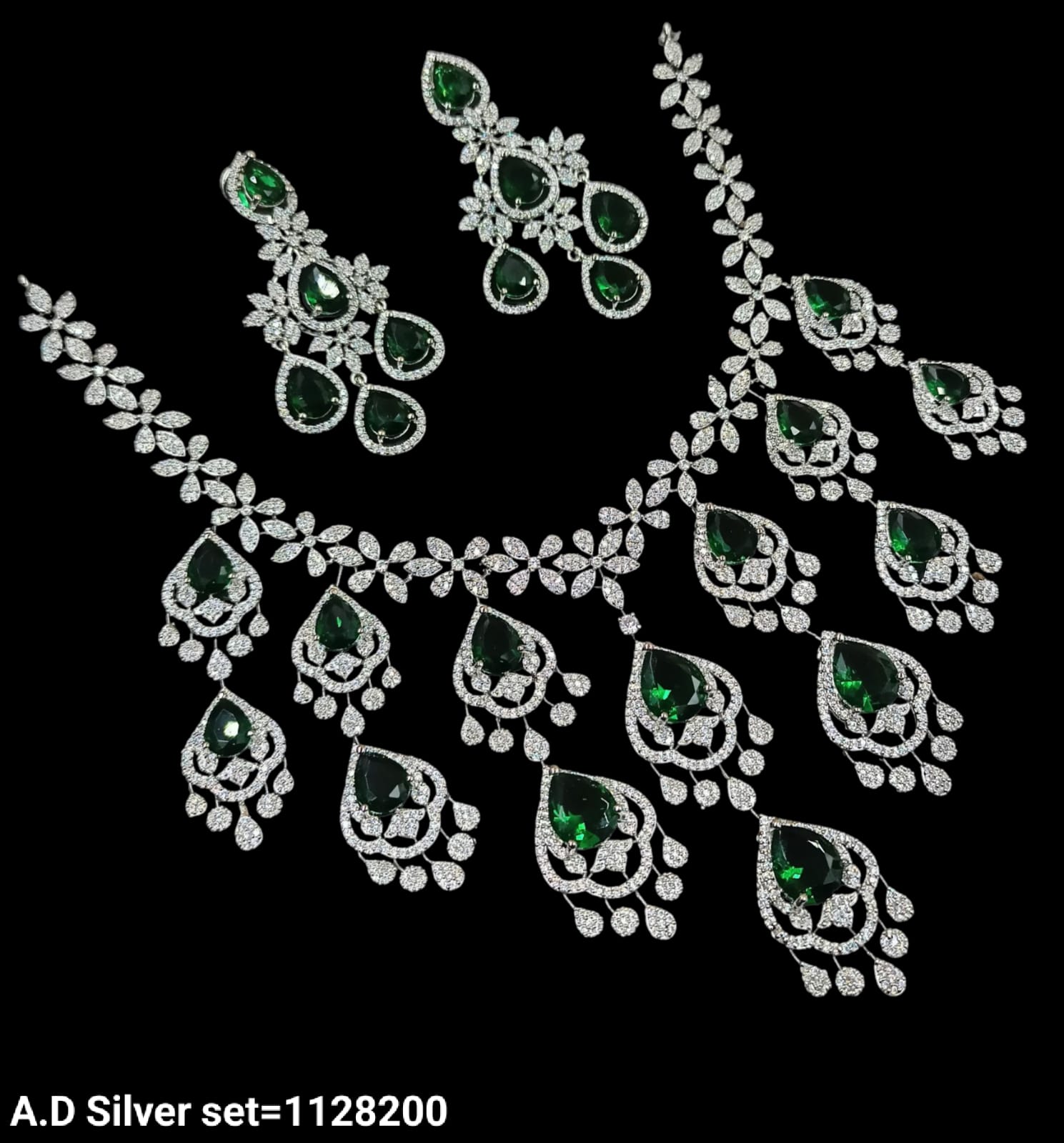 This exquisite jewellery set features a silver-plated finish adorned with sparkling American diamonds, combining elegance with timeless craftsmanship. It Has A Pack Of :-Original Ad Necklace...