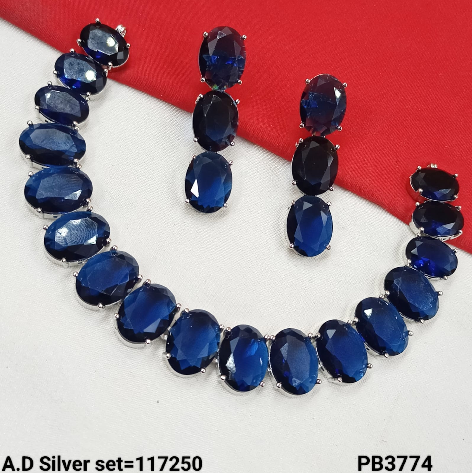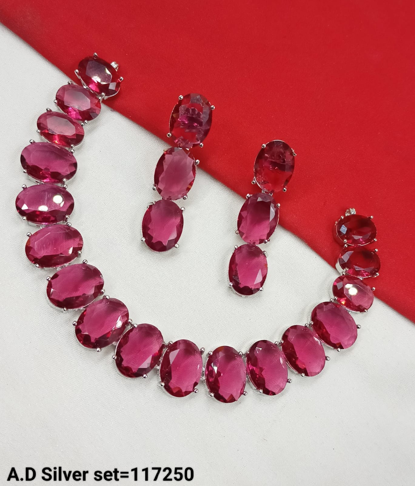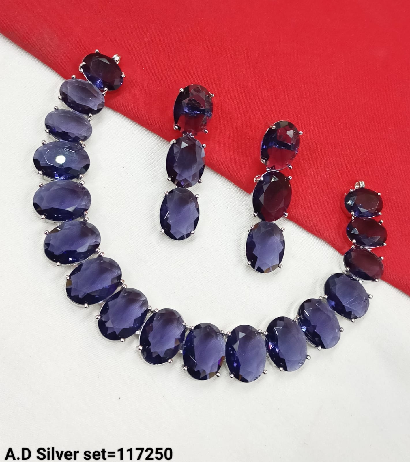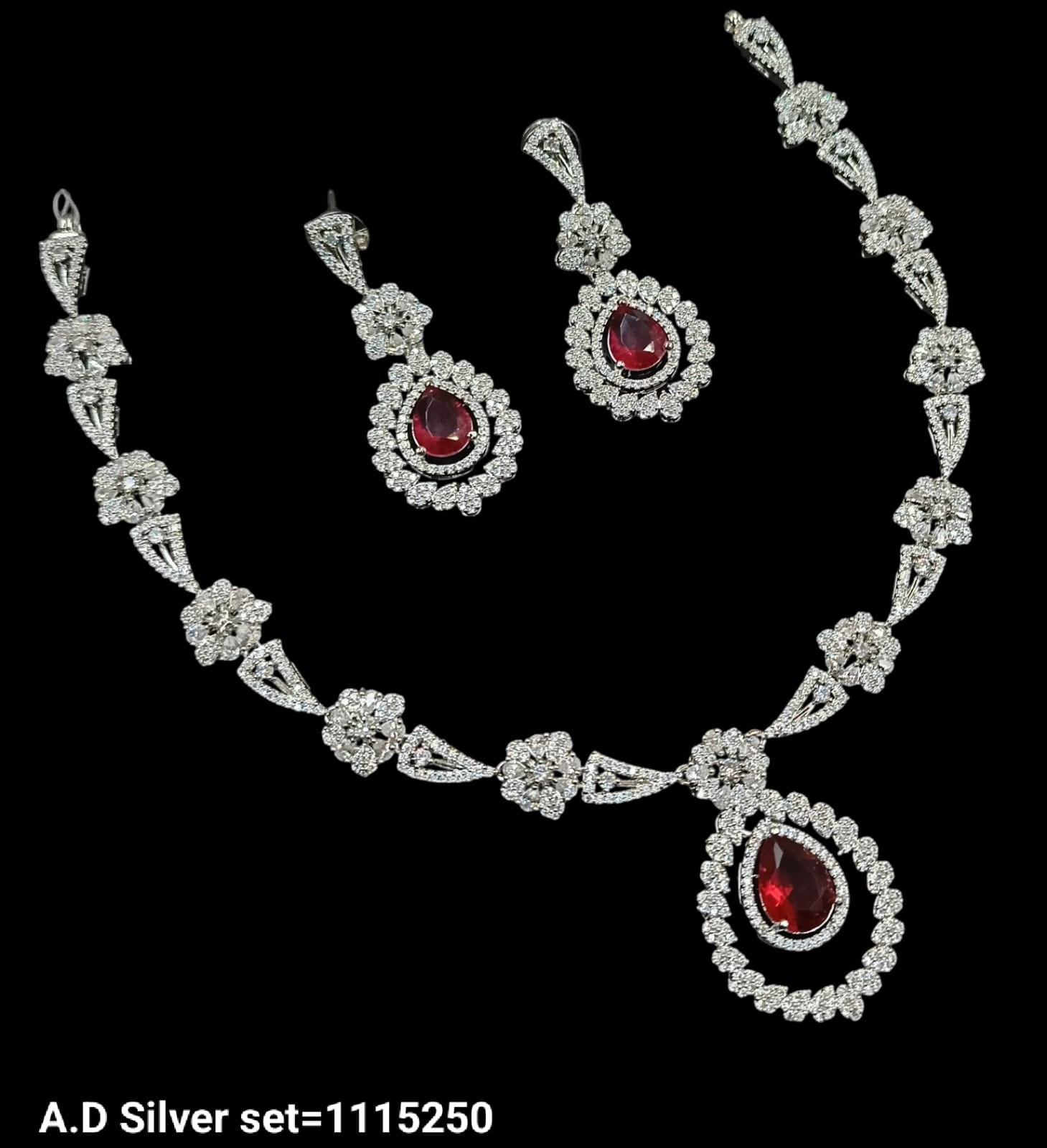 This exquisite jewellery set features a silver-plated finish adorned with sparkling American diamonds, combining elegance with timeless craftsmanship. It Has A Pack Of :-Original Ad Necklace...