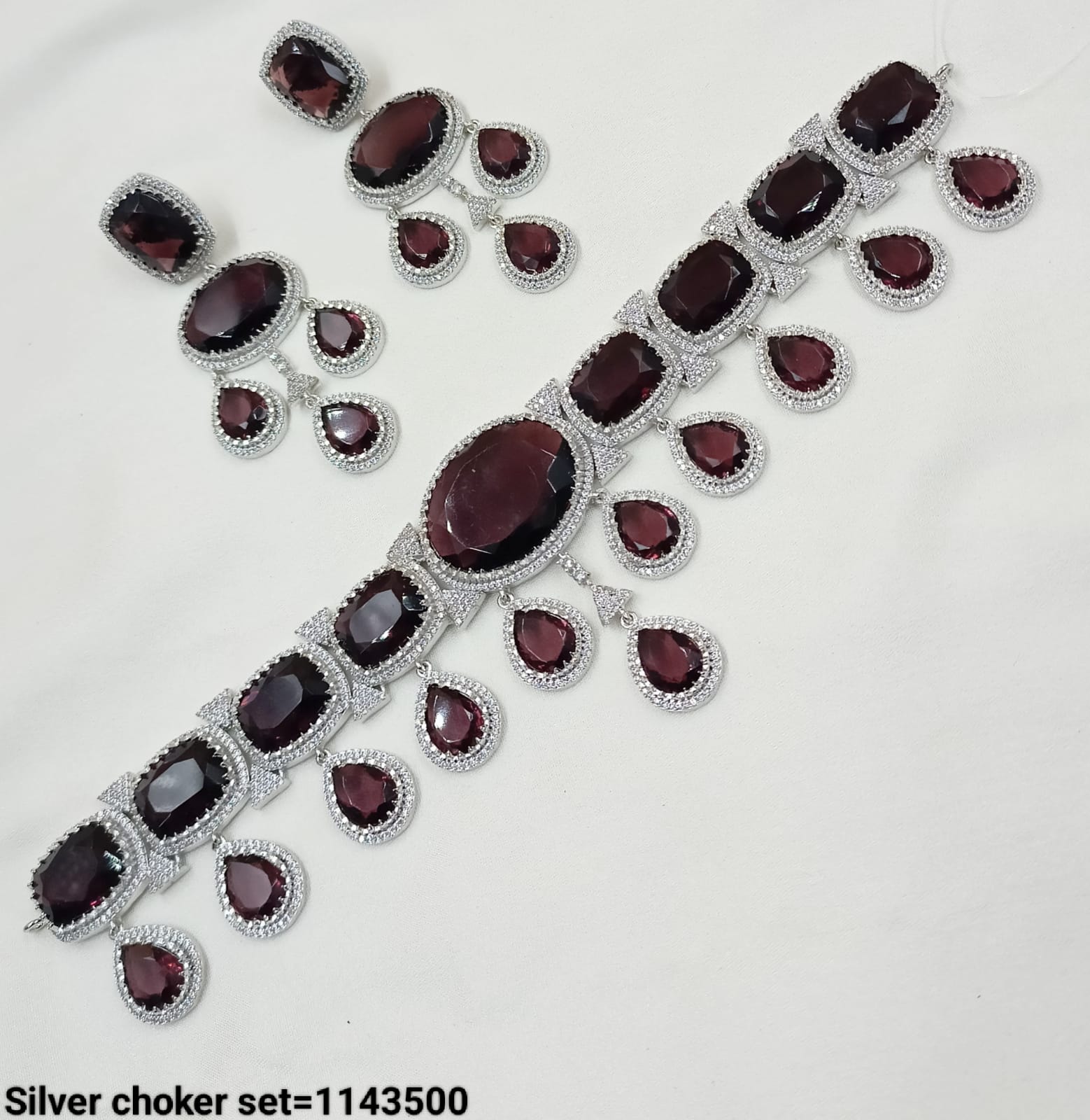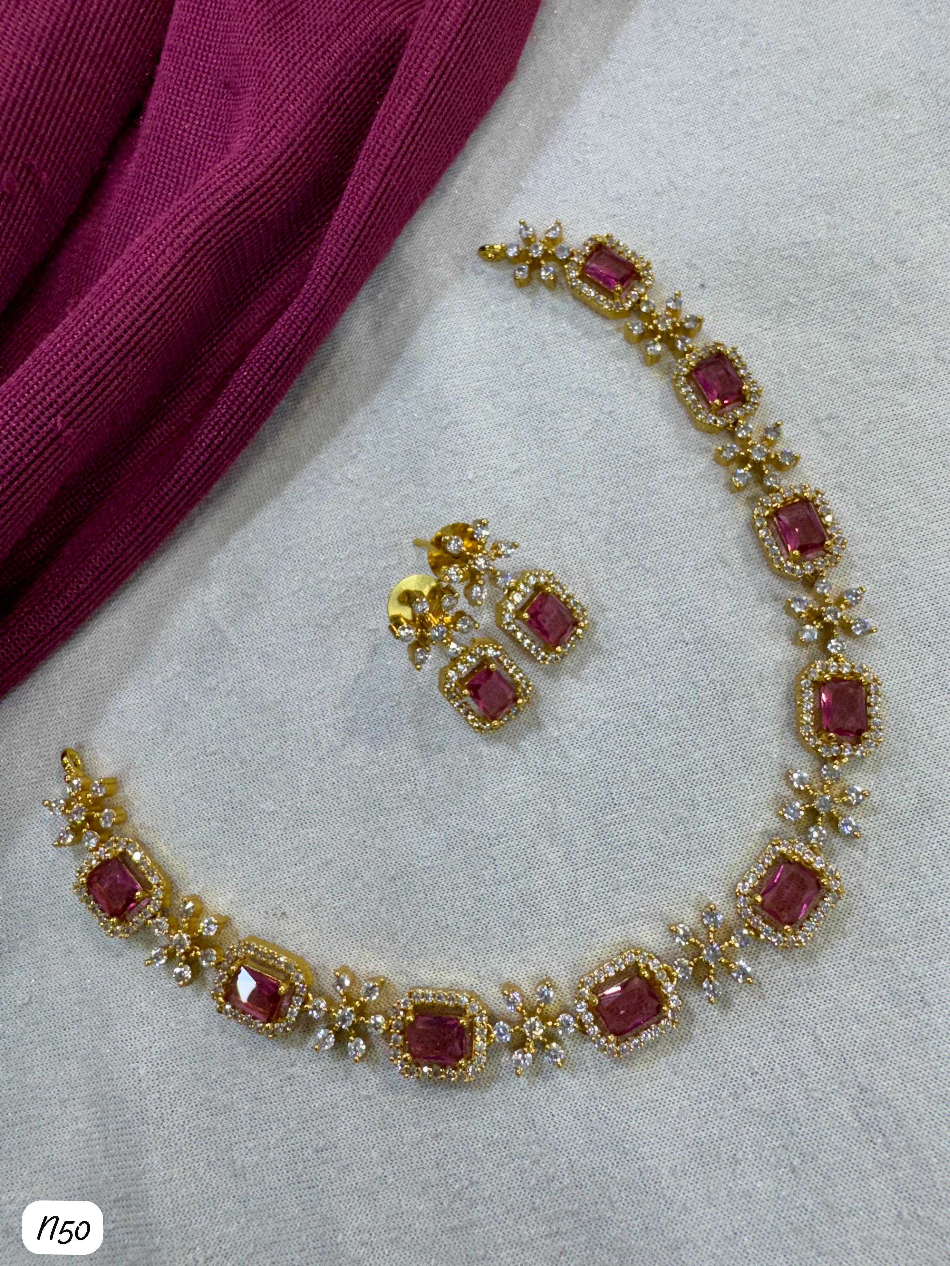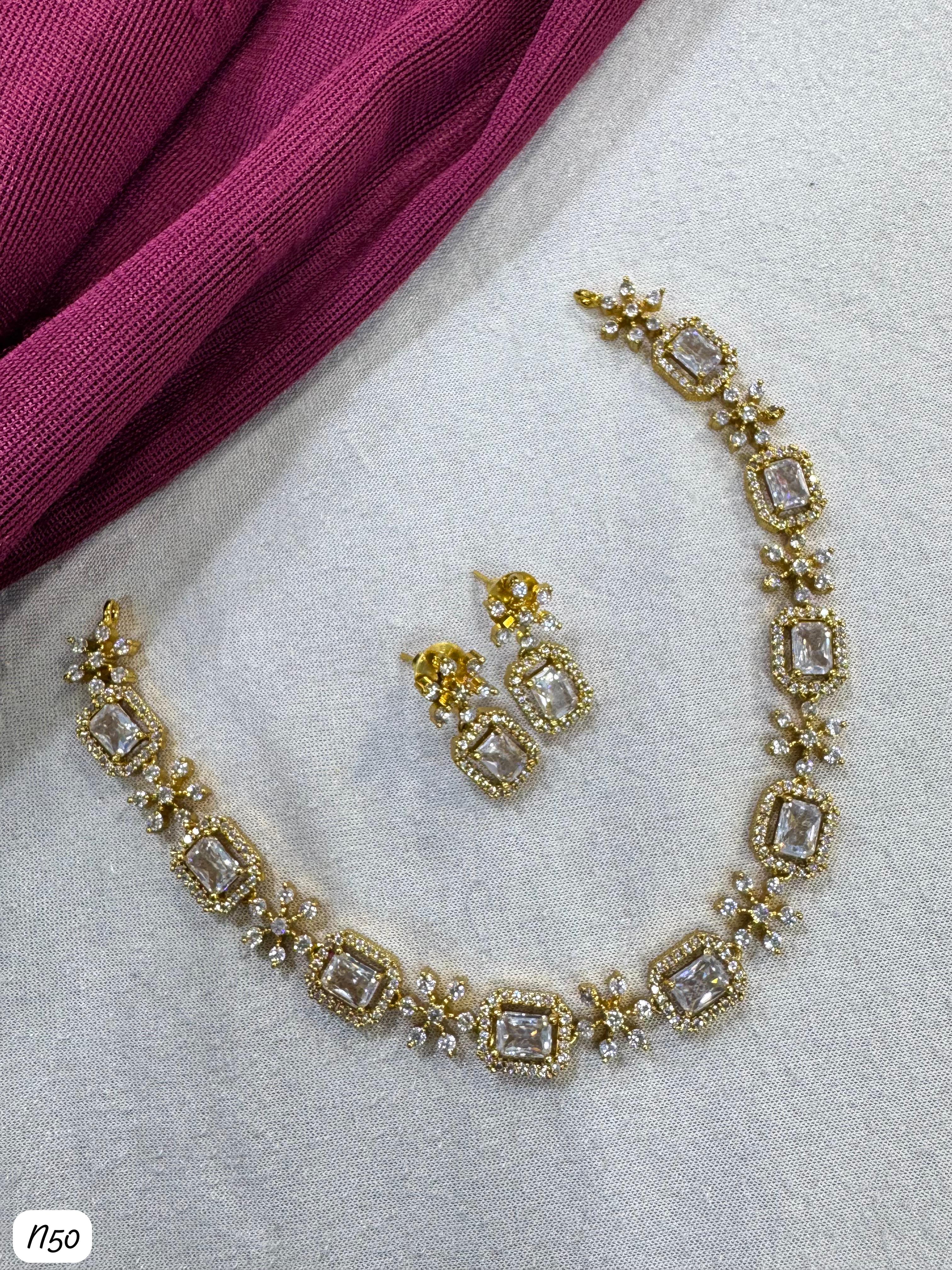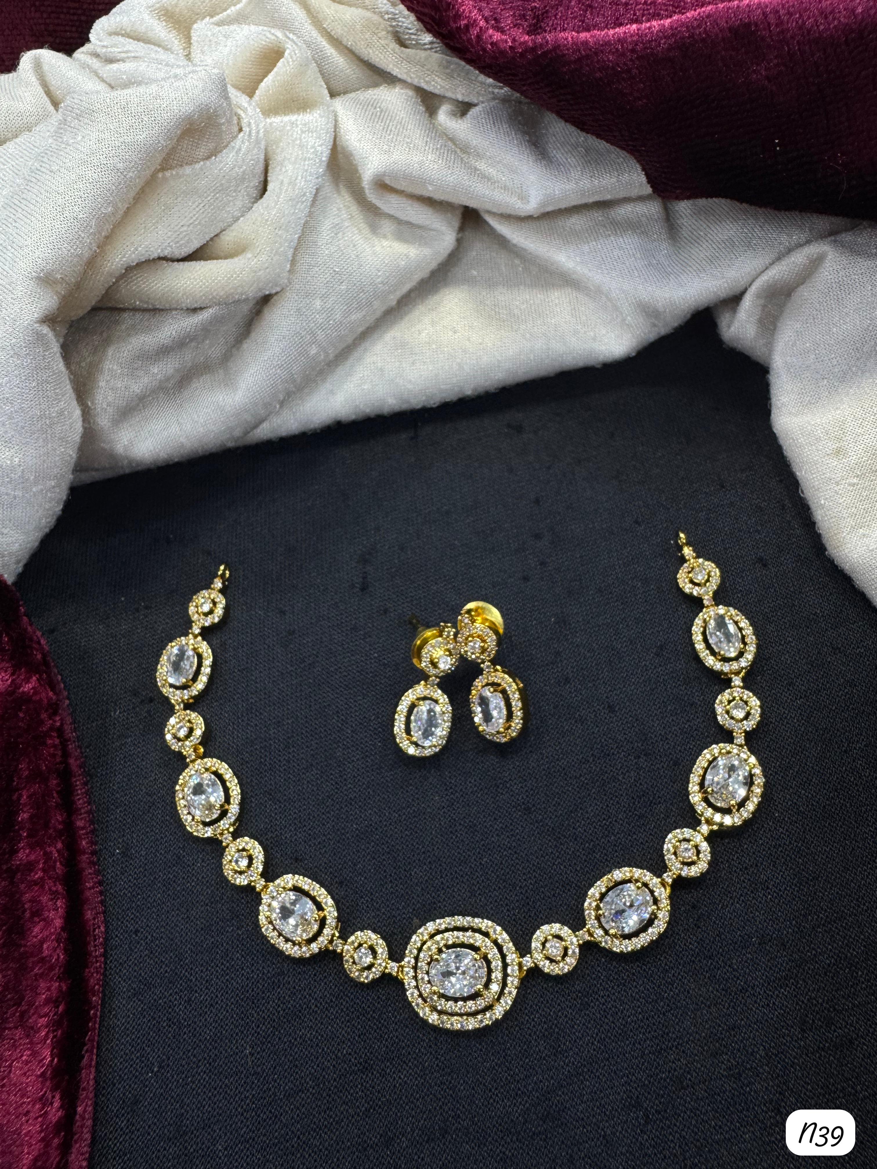 This exquisite necklace set features American diamonds meticulously set on a silver-plated base, combining elegance with lasting shine for a sophisticated accessory. It Has A Pack...
