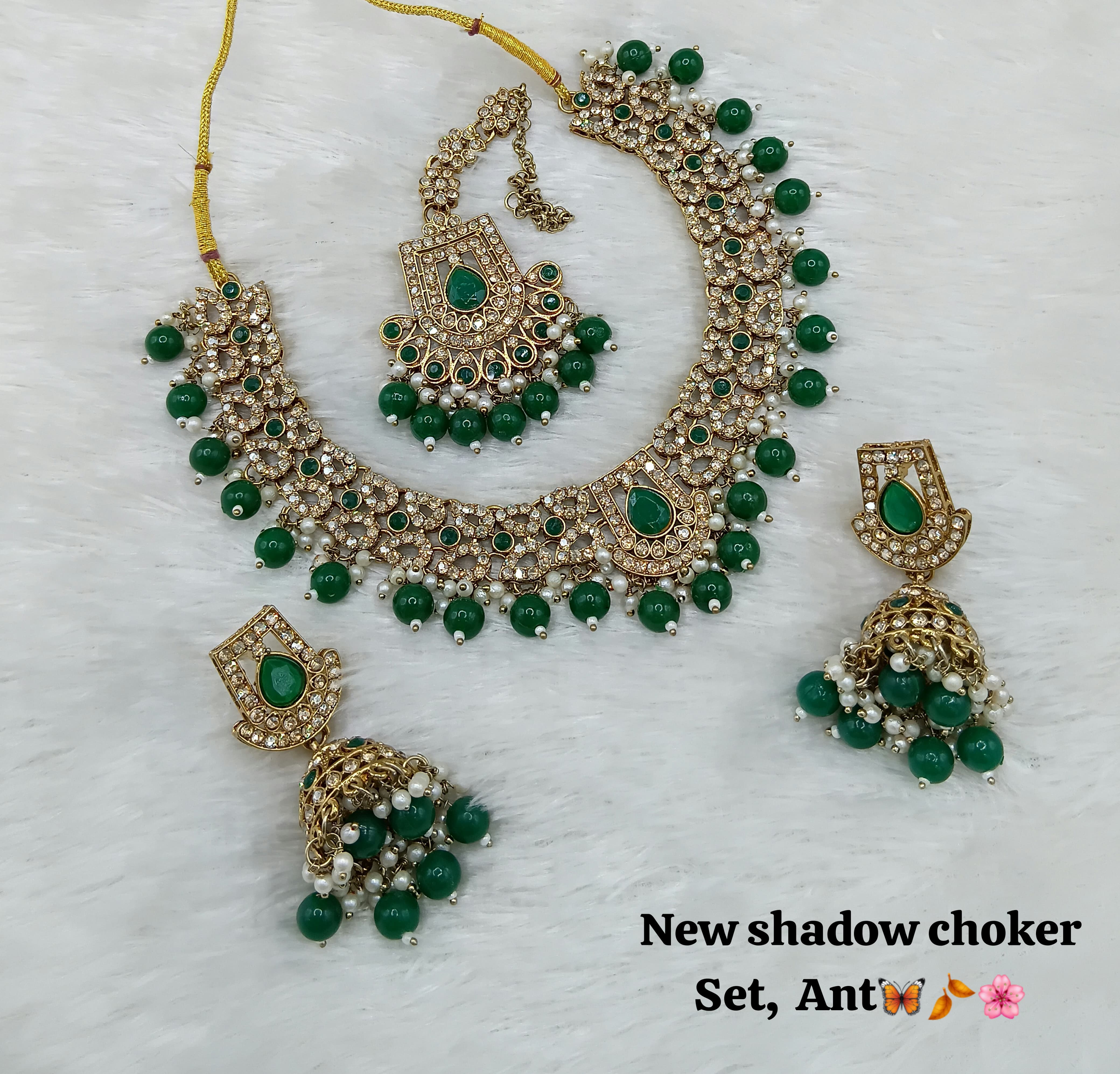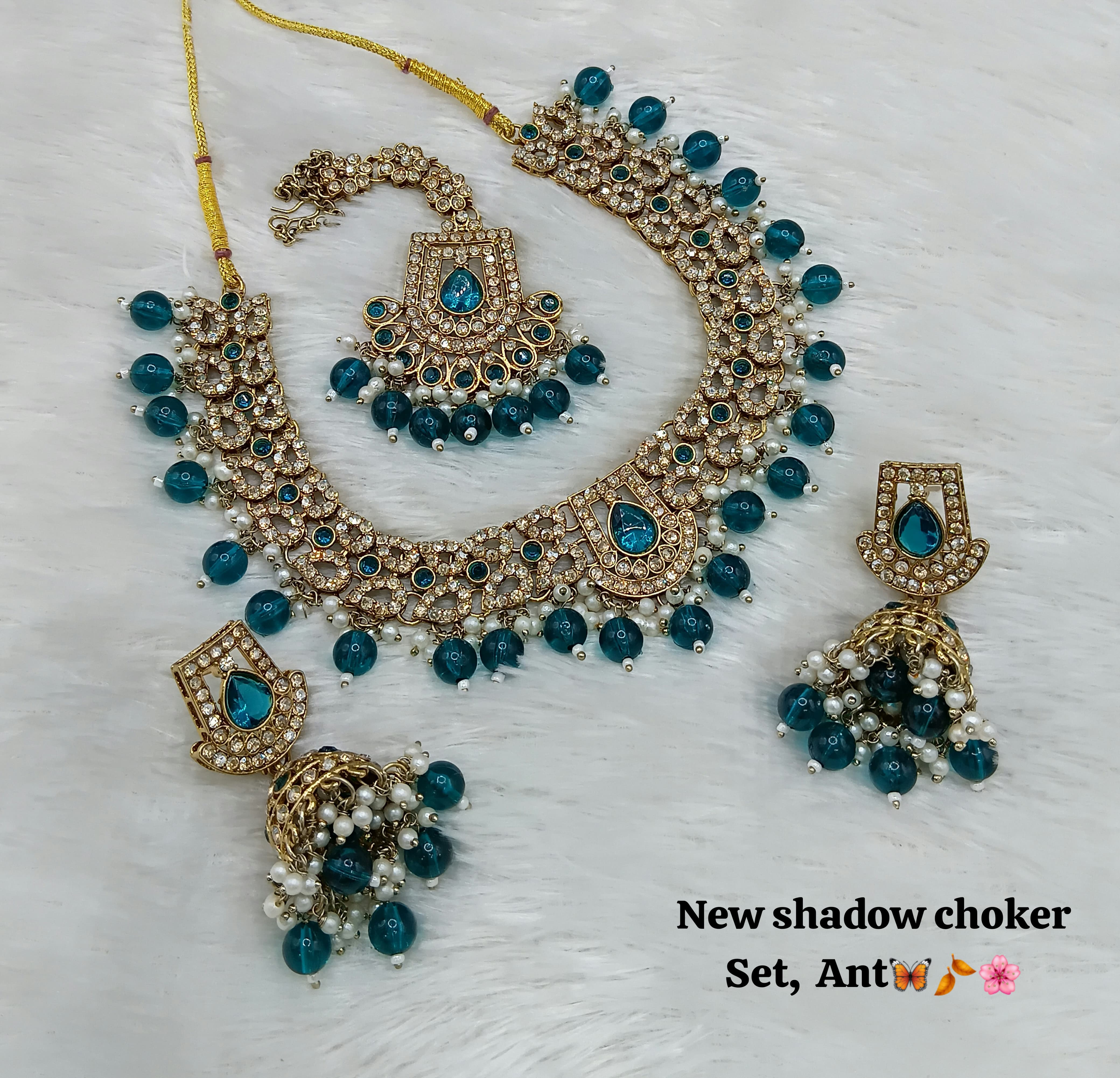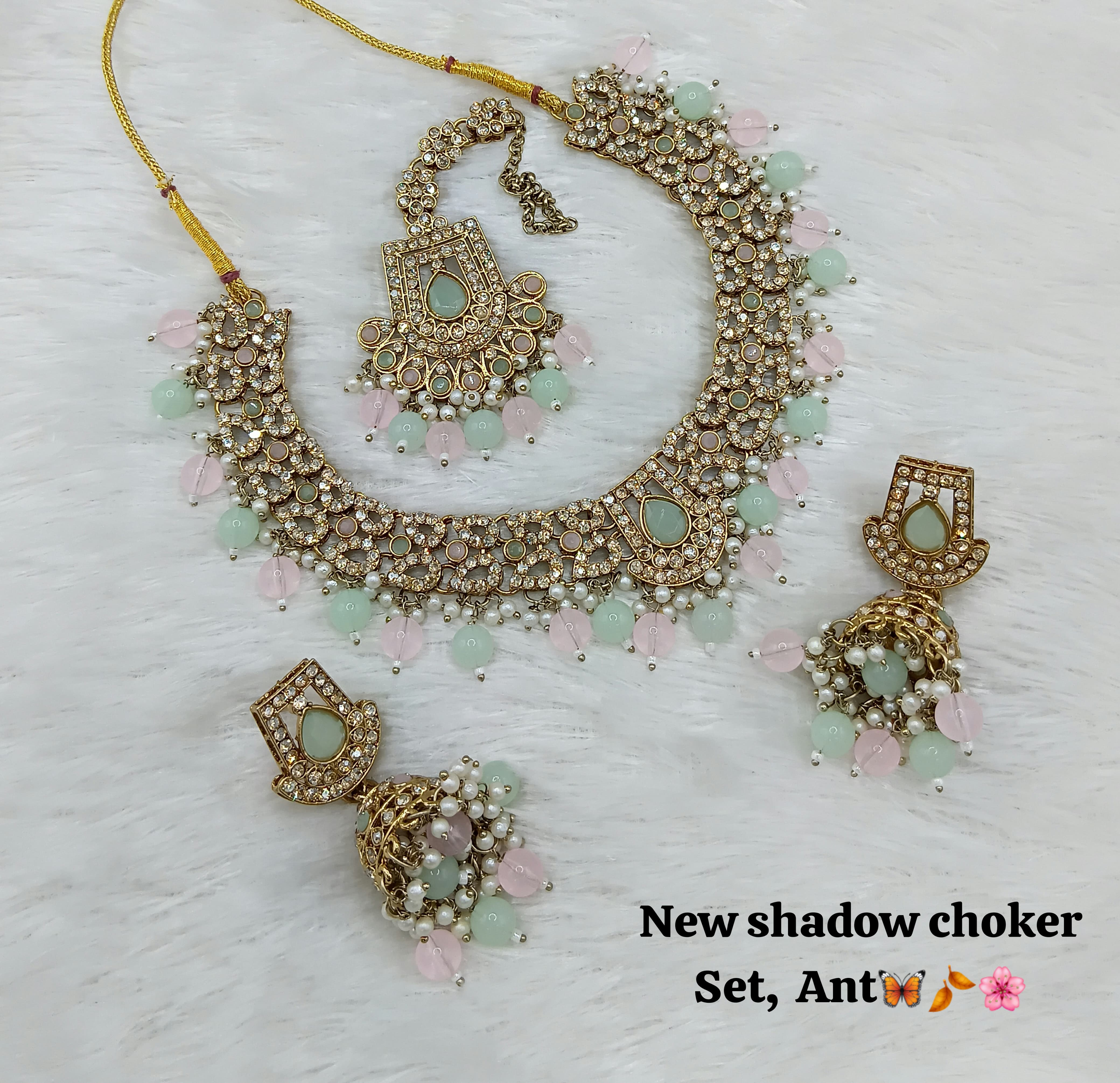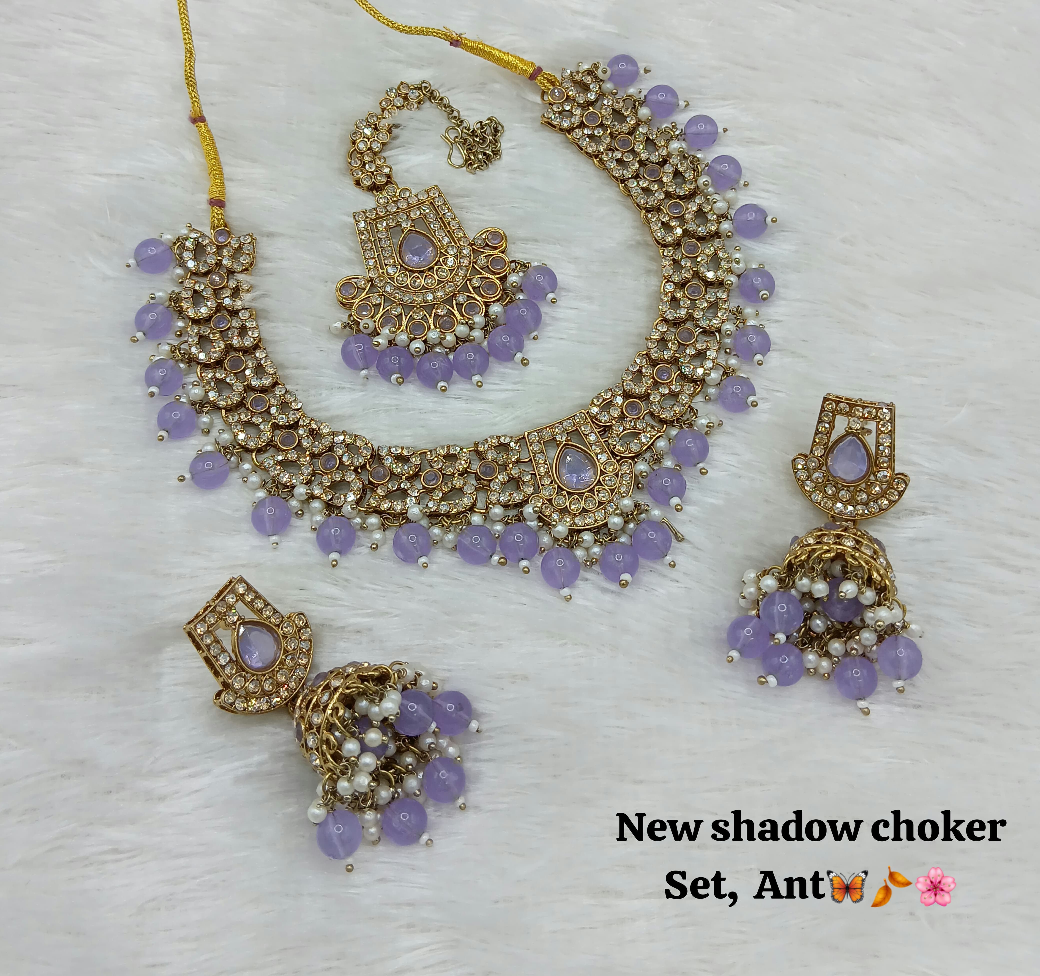 Expertly crafted with intricate Kundan stone detailing and a luxurious antique gold plating, this choker jewellery set is the perfect addition to any elegant outfit. Elevate...