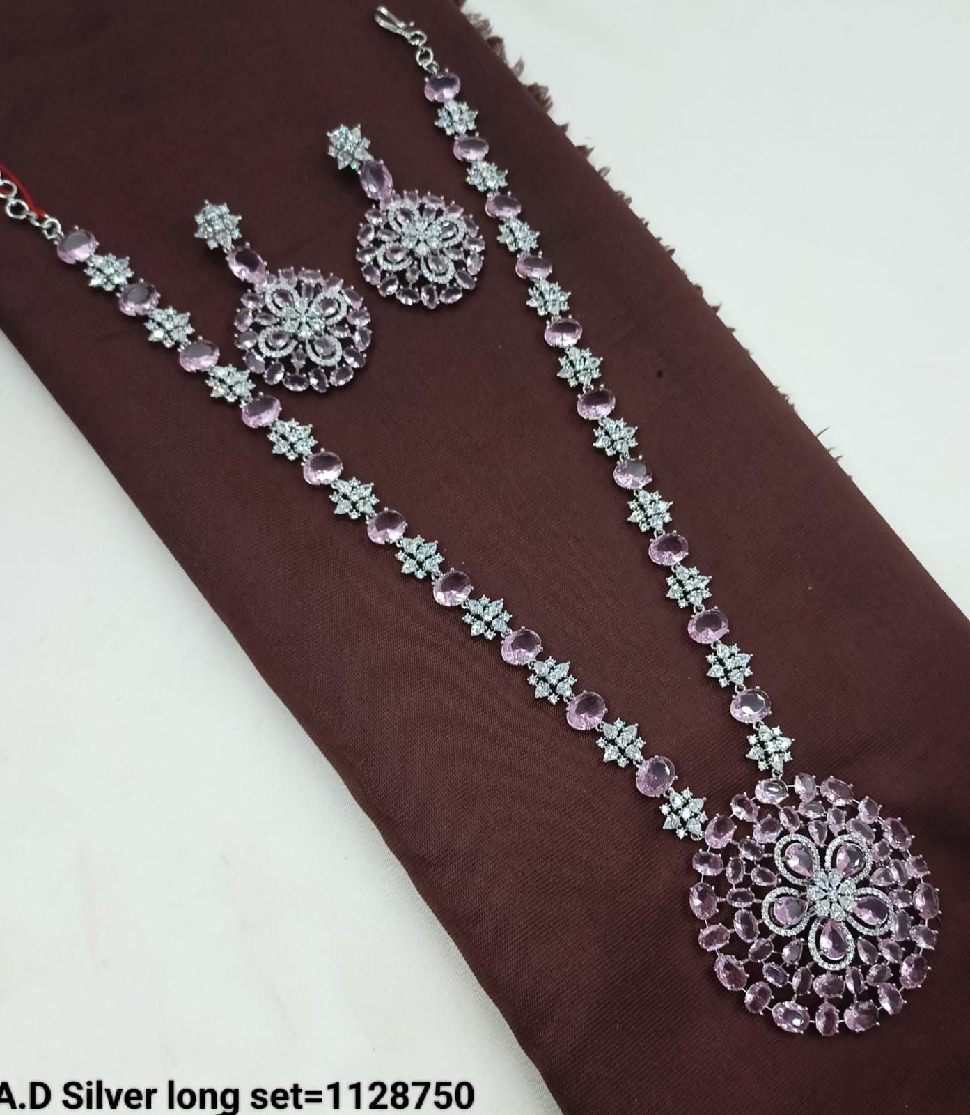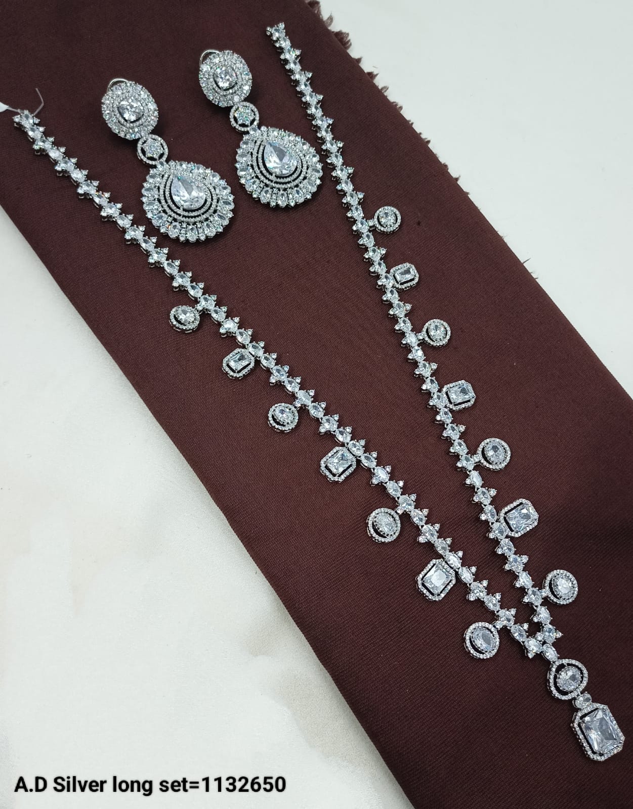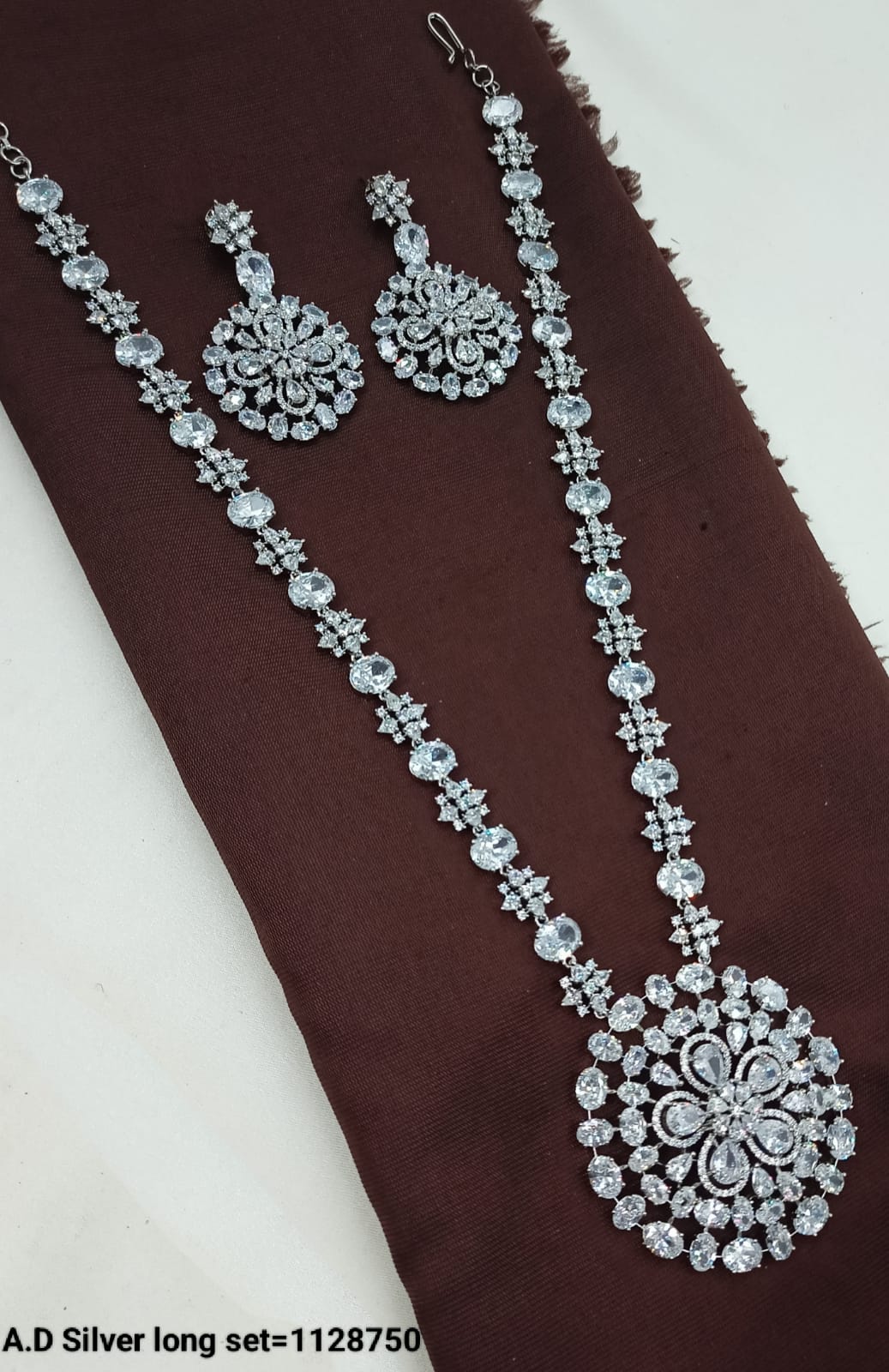 Elegant Silver Long AD Necklace and Earring Set – Stunning Design for Any Occasion