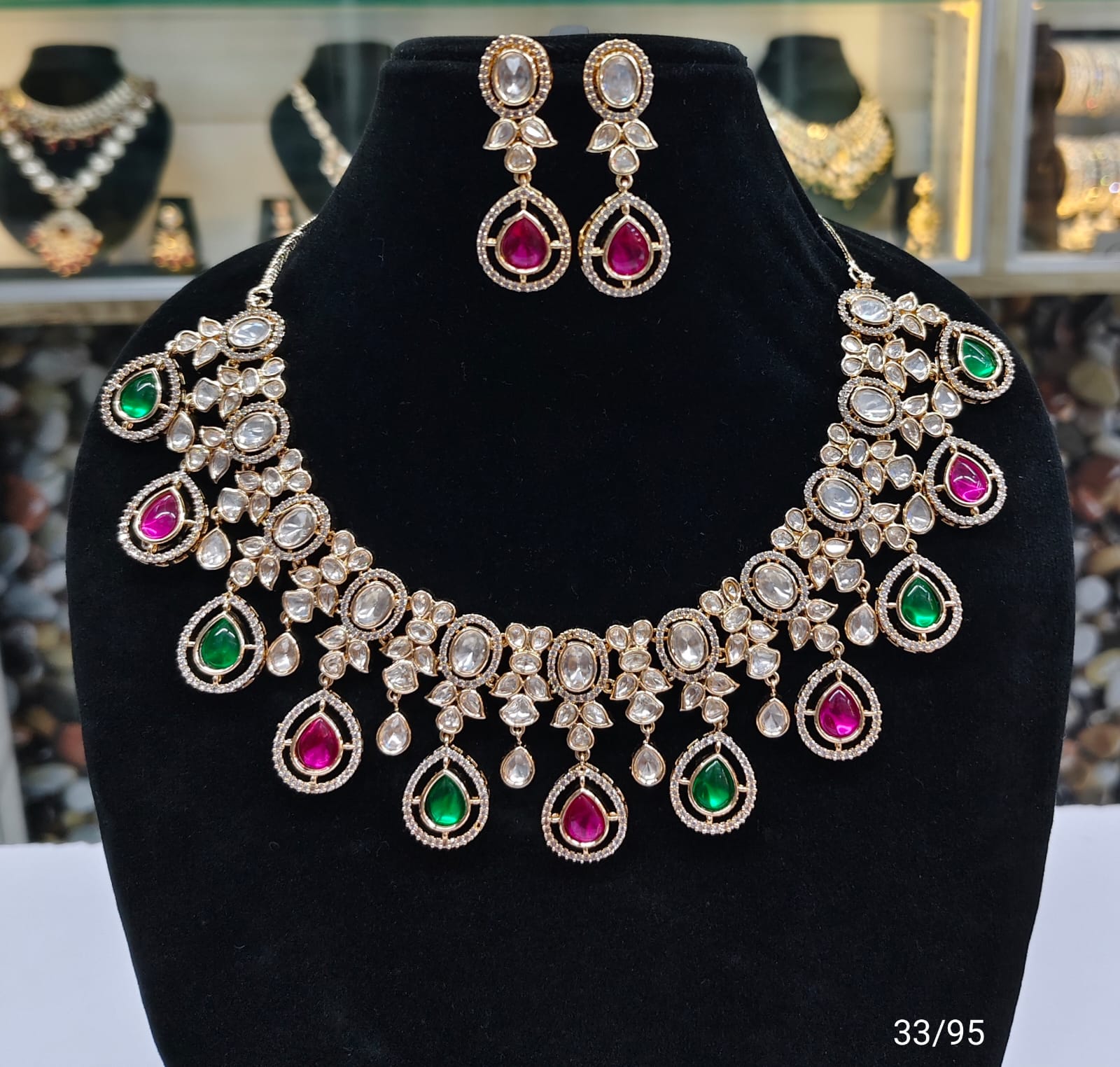 Make a stunning impression with this exquisite Pachi Kundan Necklace Set, designed with precision and elegance. The necklace showcases classic oval-shaped green stone drops bordered with...