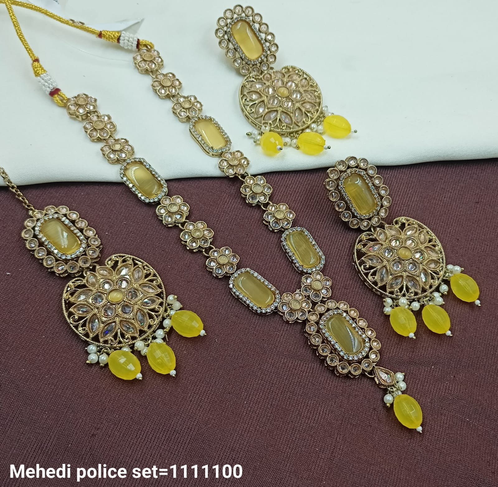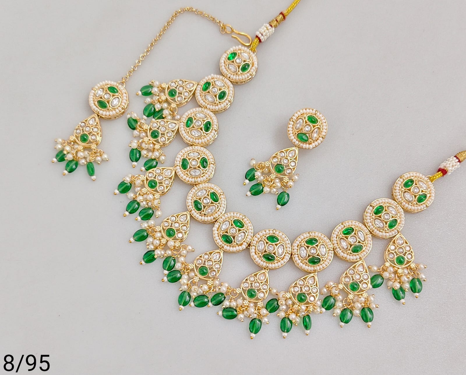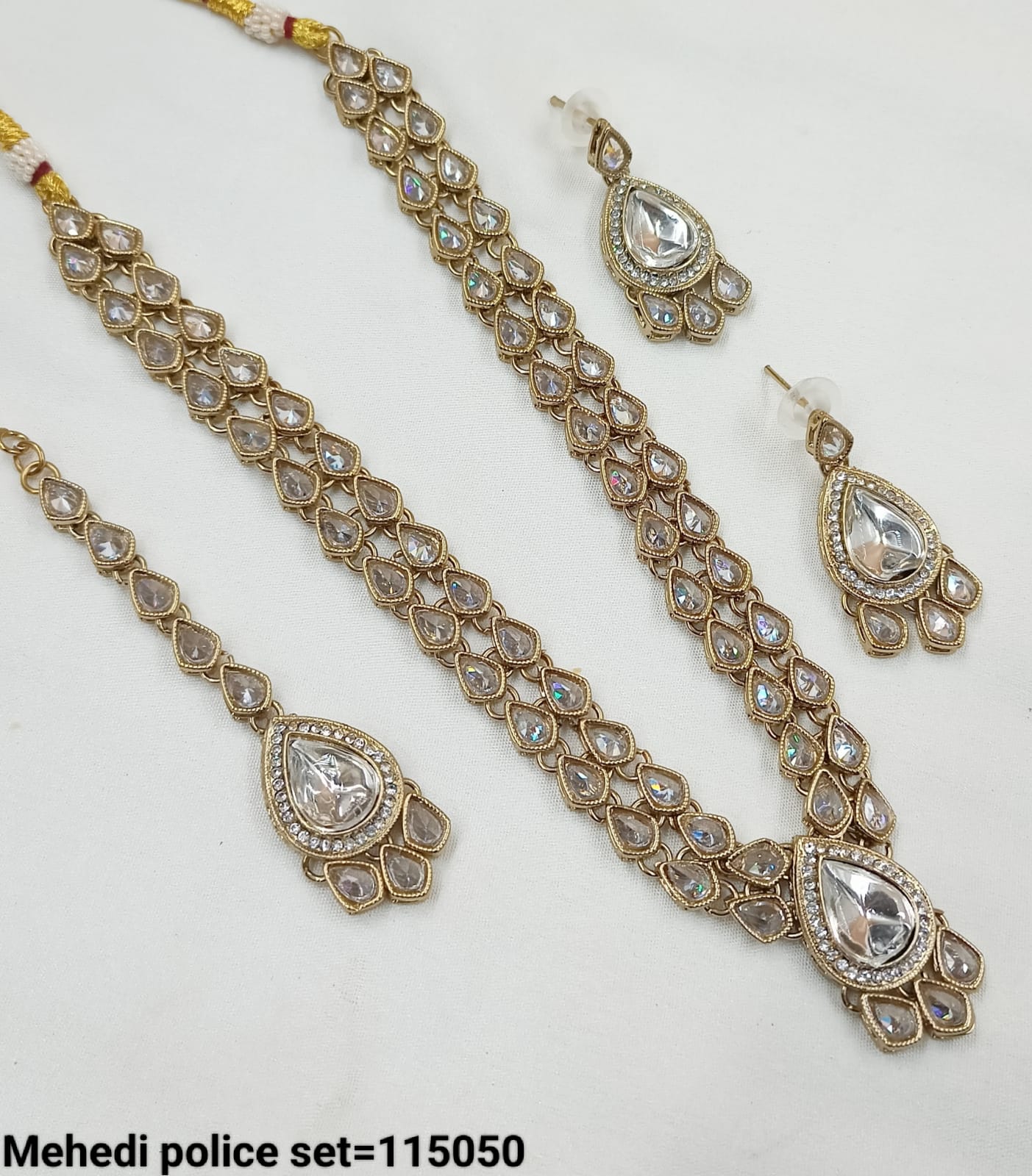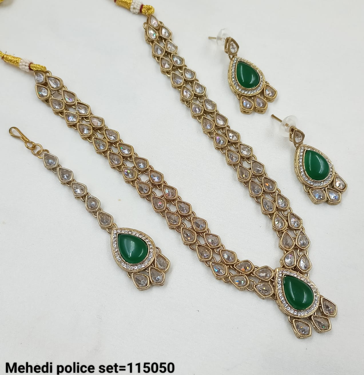 Add a touch of royalty to your ethnic ensemble with this elegant Mehendi Polki Necklace Set, complete with matching earrings and maang tikka. Crafted with precision,...