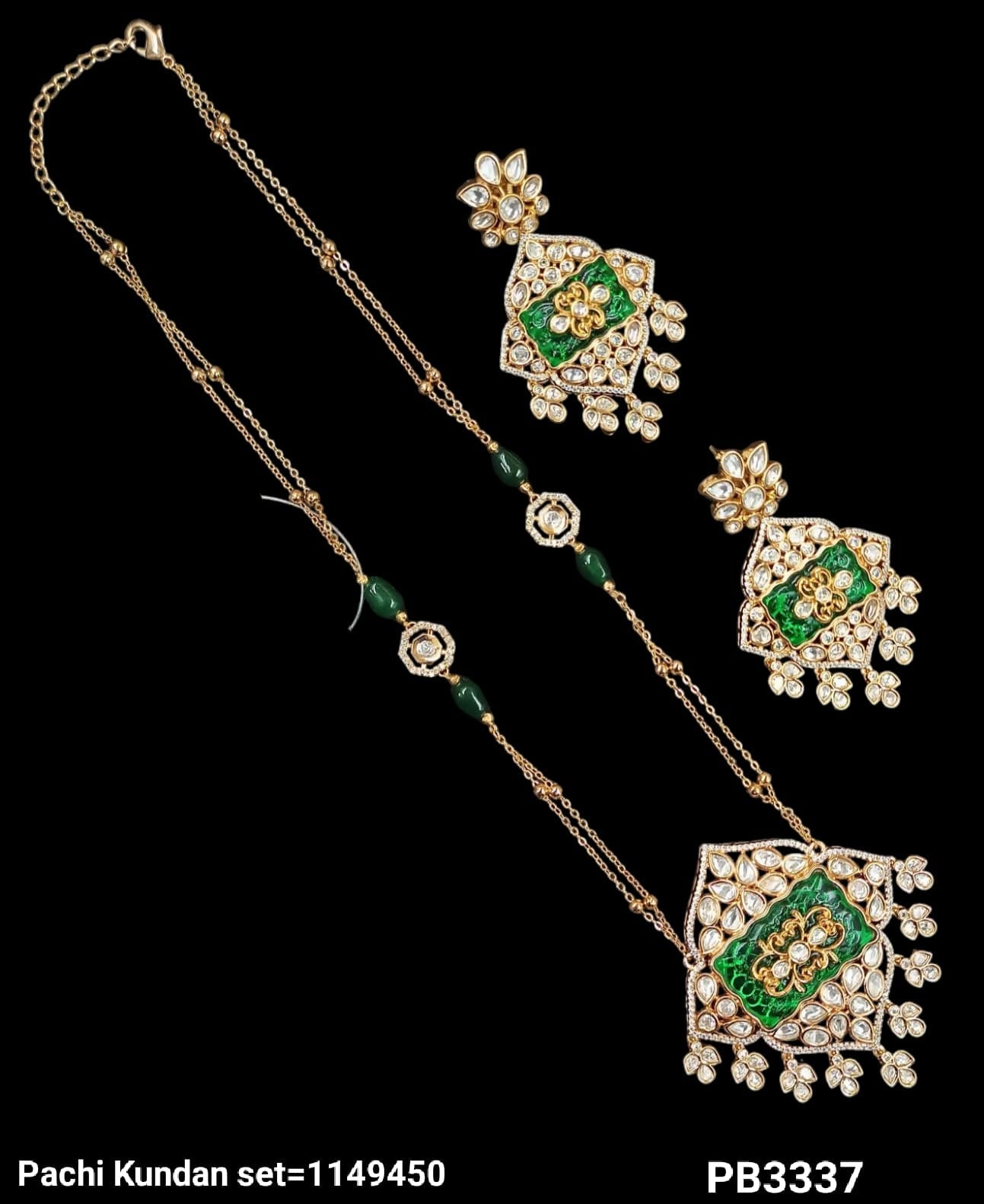 Add a touch of royal elegance to your festive or bridal look with this beautifully handcrafted Pachi Kundan jewelry set. Featuring a statement pendant necklace and...