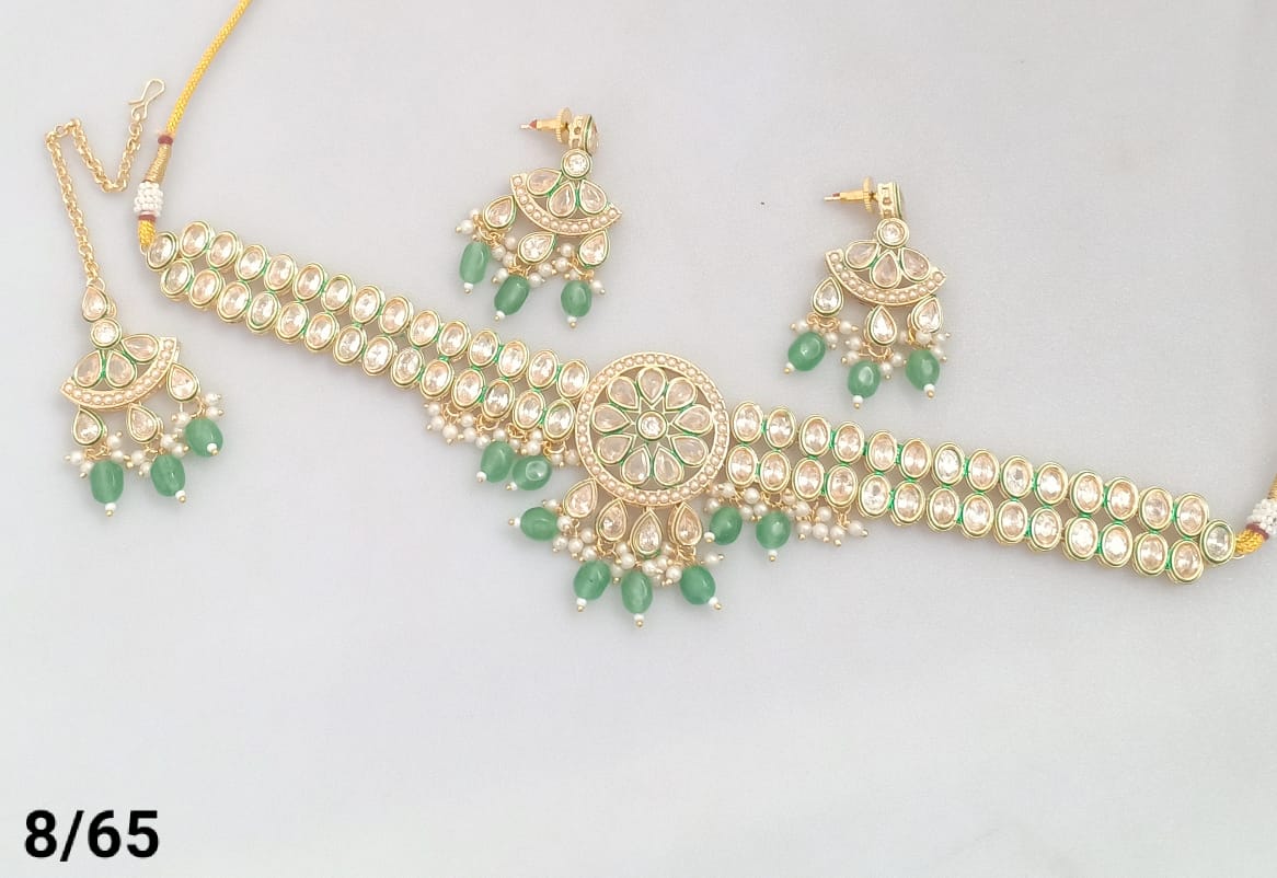 Antique Gold Polki Necklace Set with Matching Earrings and Maang Tikka