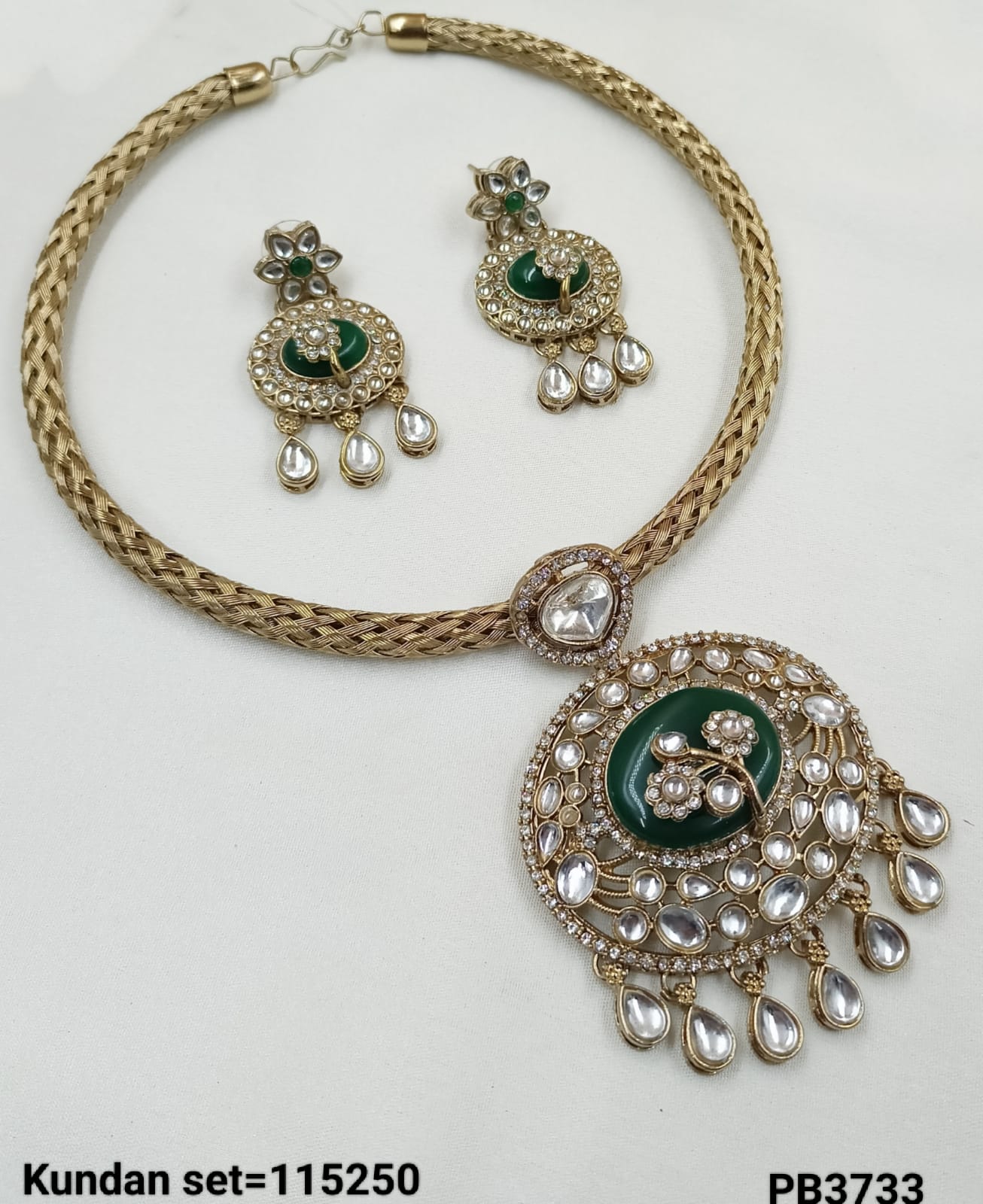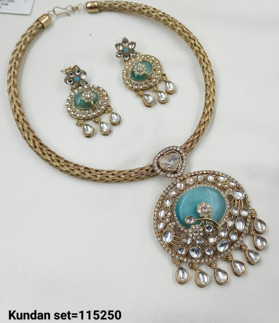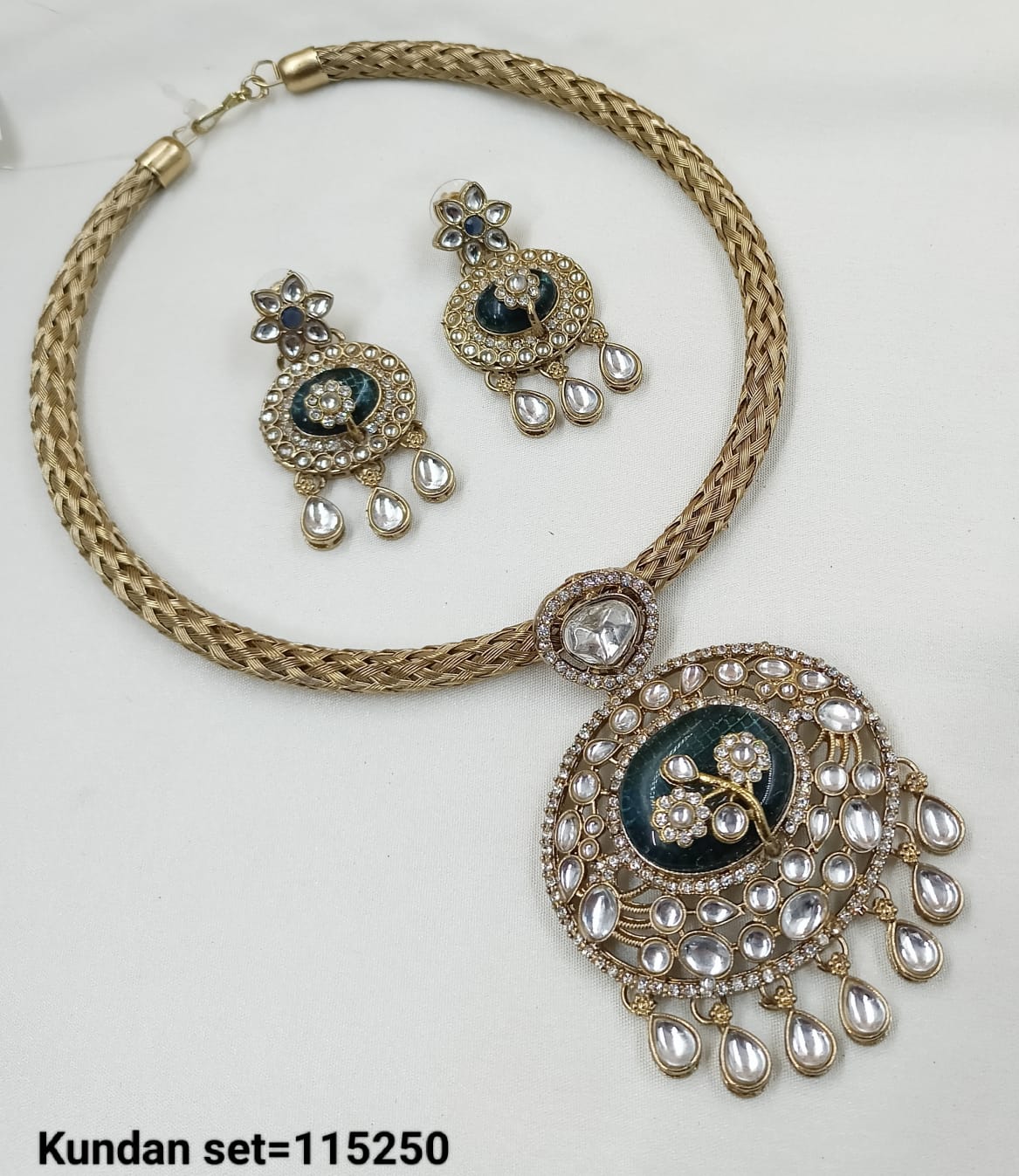 Elevate your ethnic elegance with this Pachi Kundan necklace set, featuring sparkling stones framed in intricate gold-tone detailing. The set includes a statement necklace and matching...