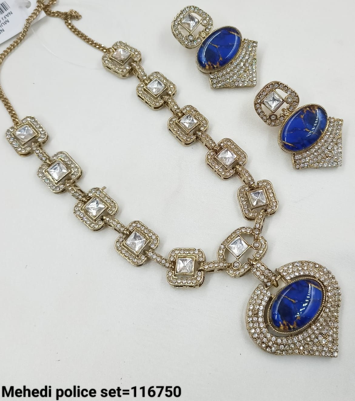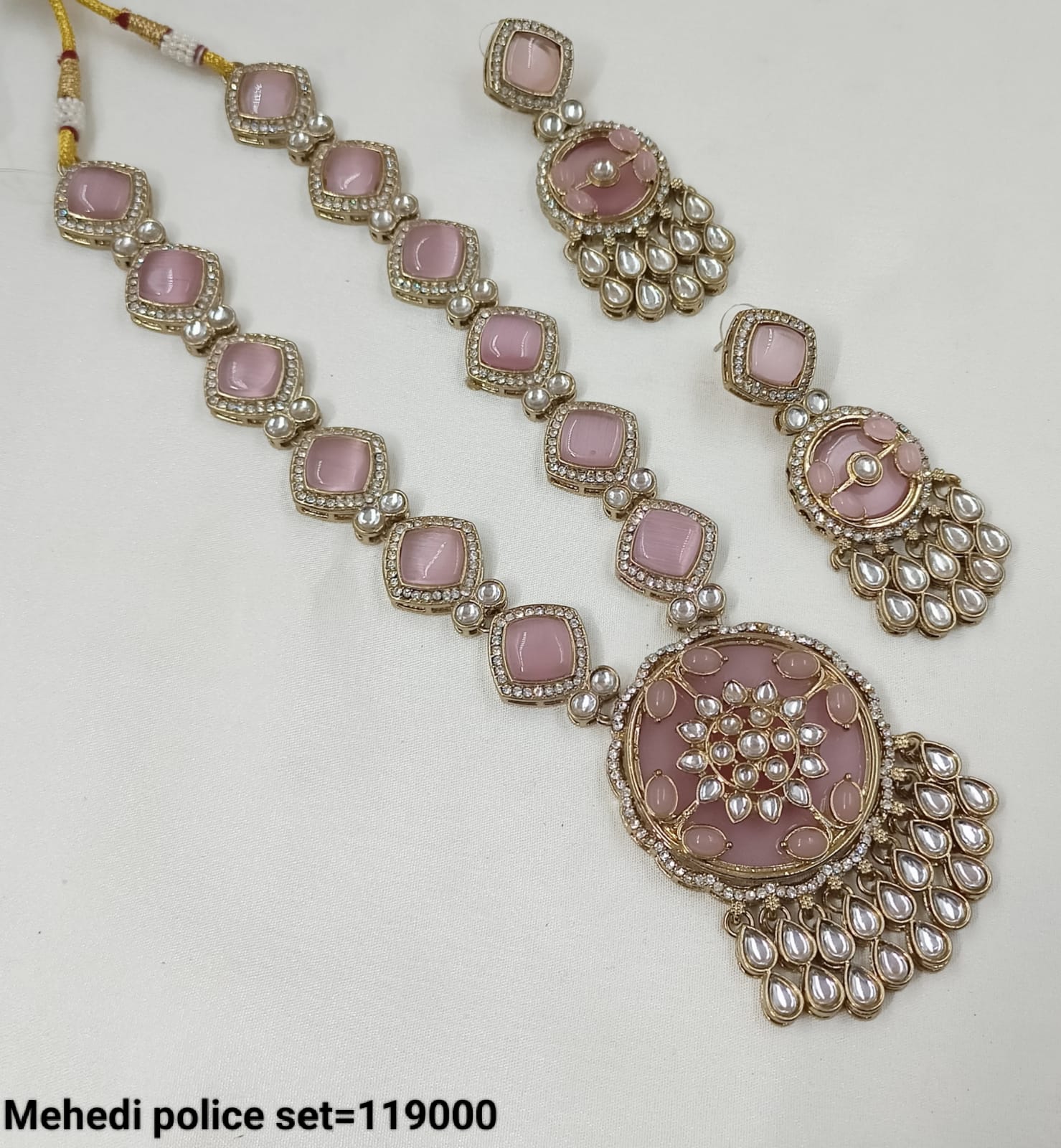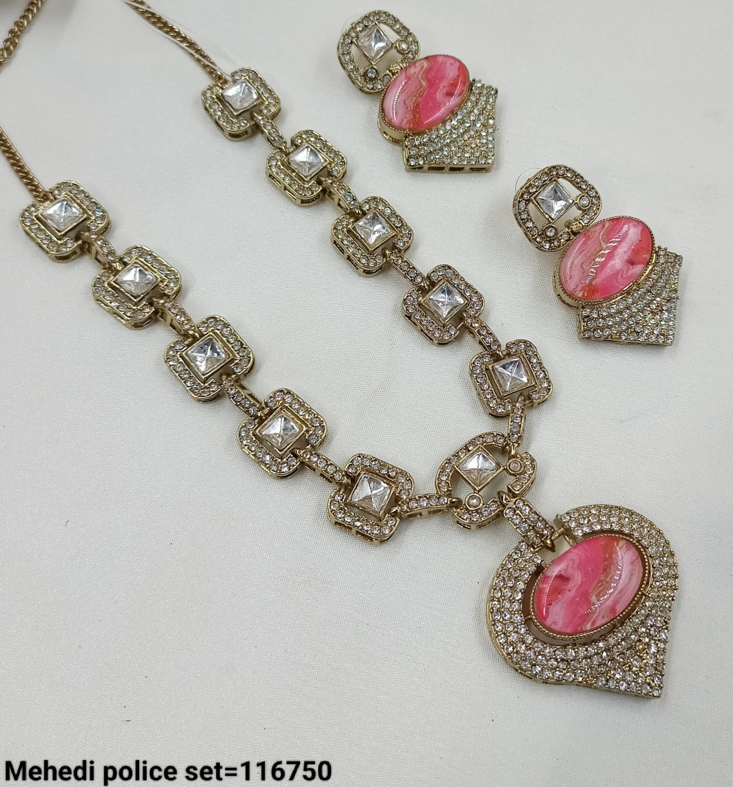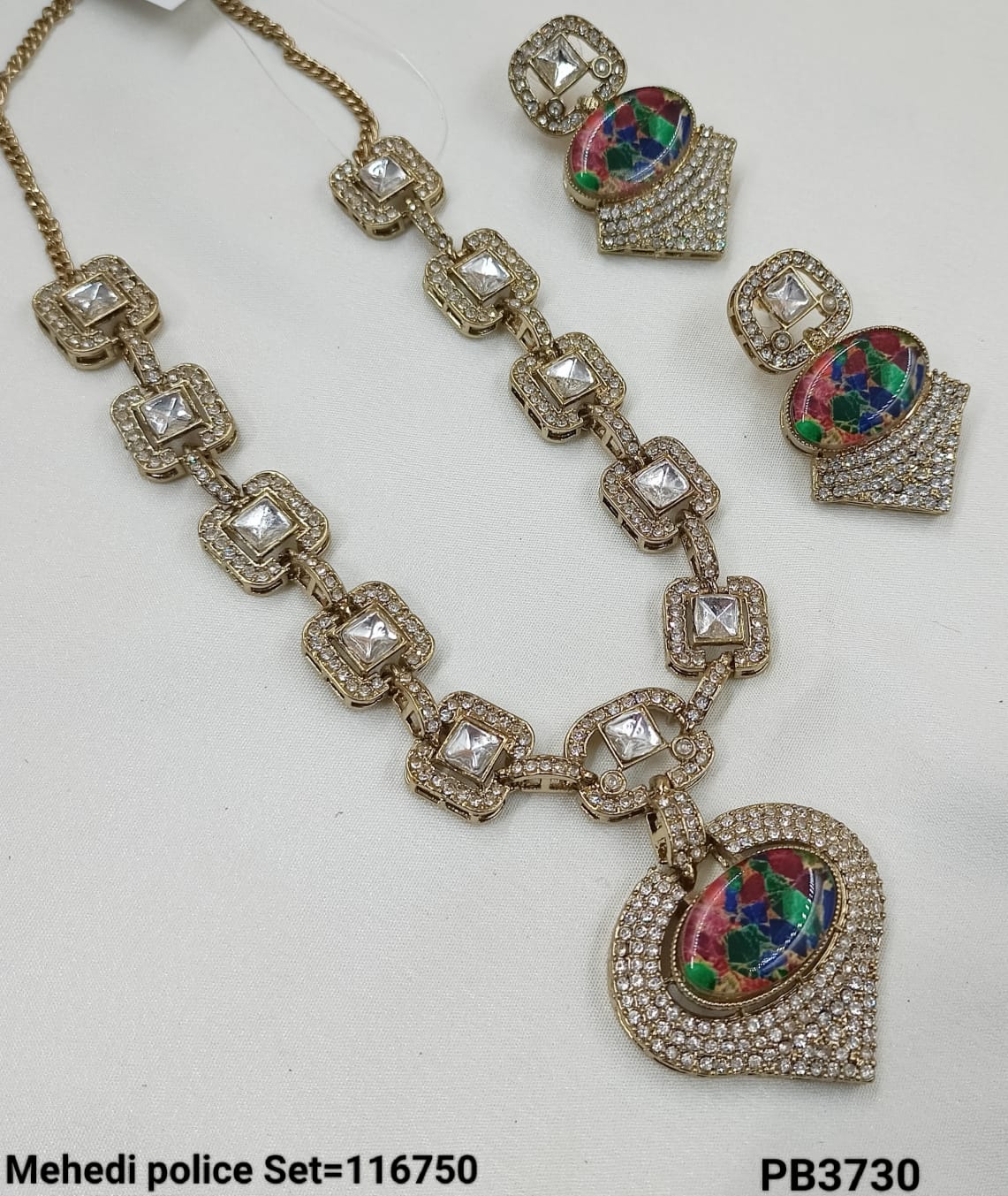 Elevate your ethnic elegance with this Pachi Kundan necklace set, featuring sparkling stones framed in intricate gold-tone detailing. The set includes a statement necklace and matching...