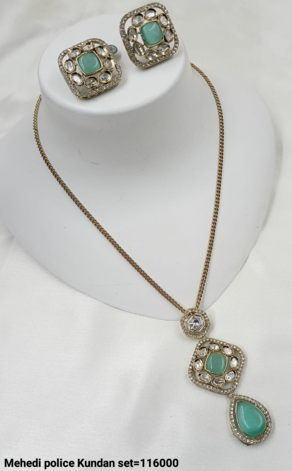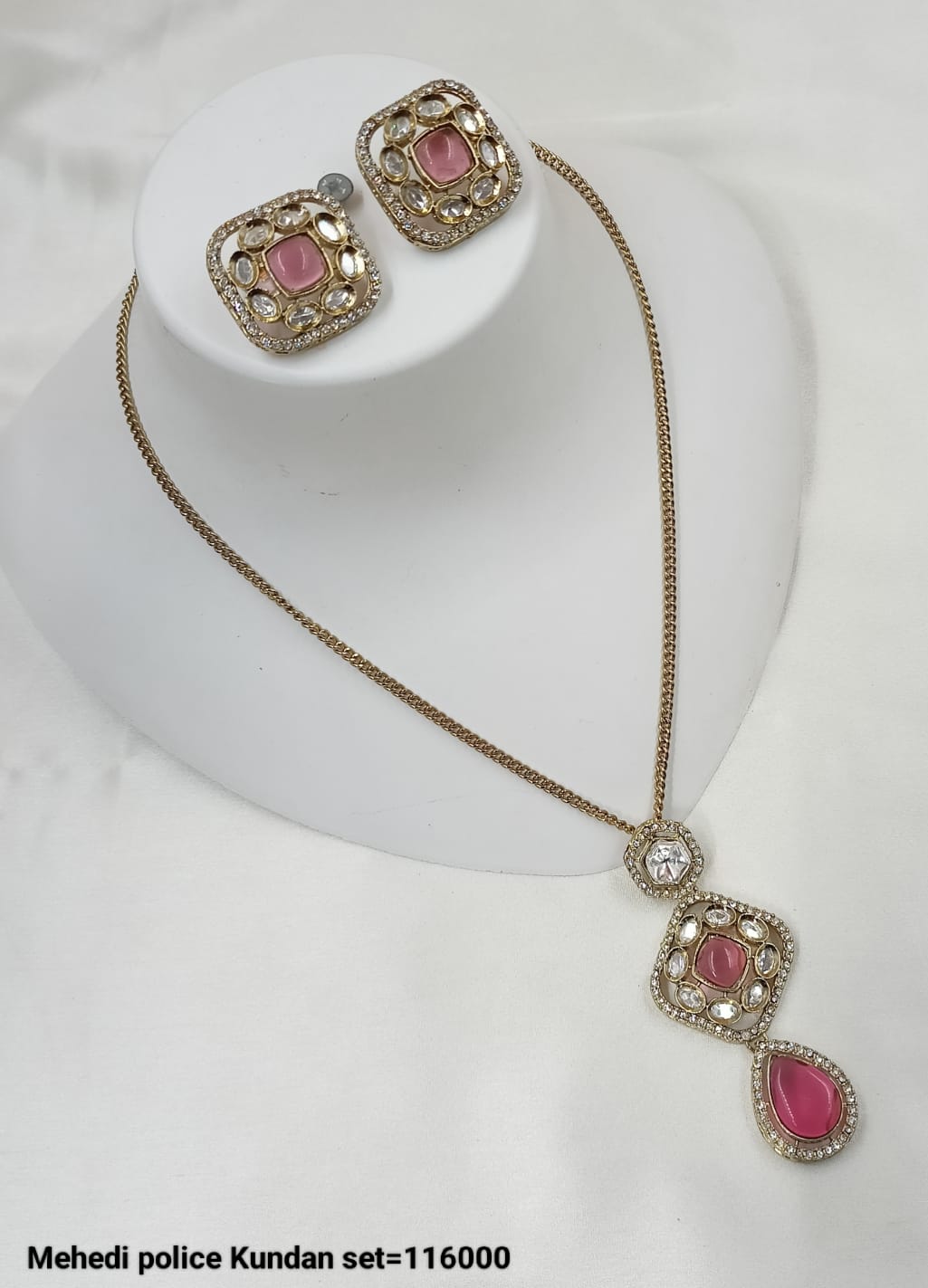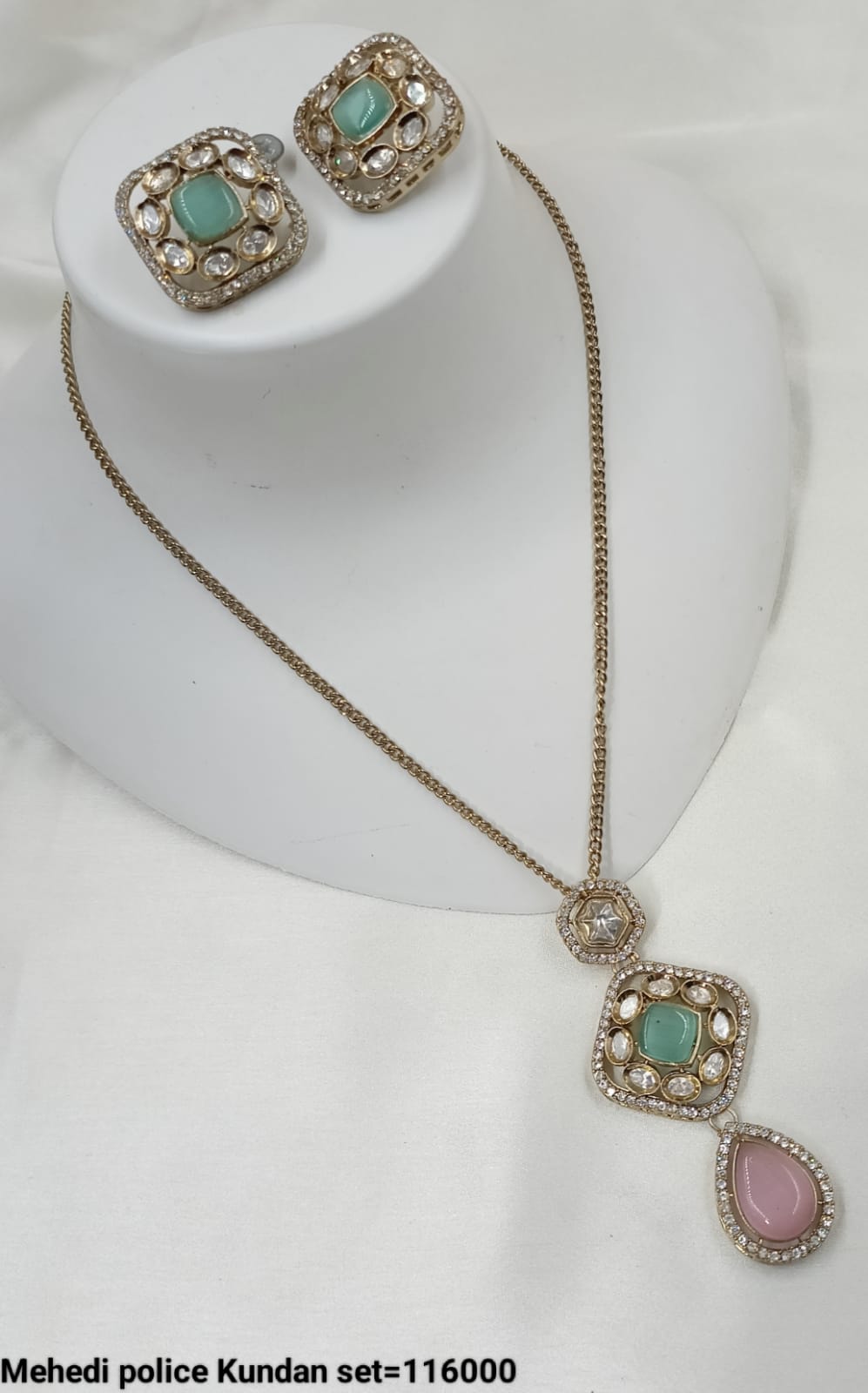 This exquisite Kundan pendant set showcases a delicate arrangement of traditional Kundan stones, expertly crafted to highlight intricate detailing and fine craftsmanship. The set includes a...