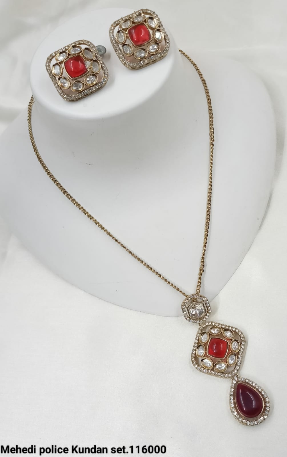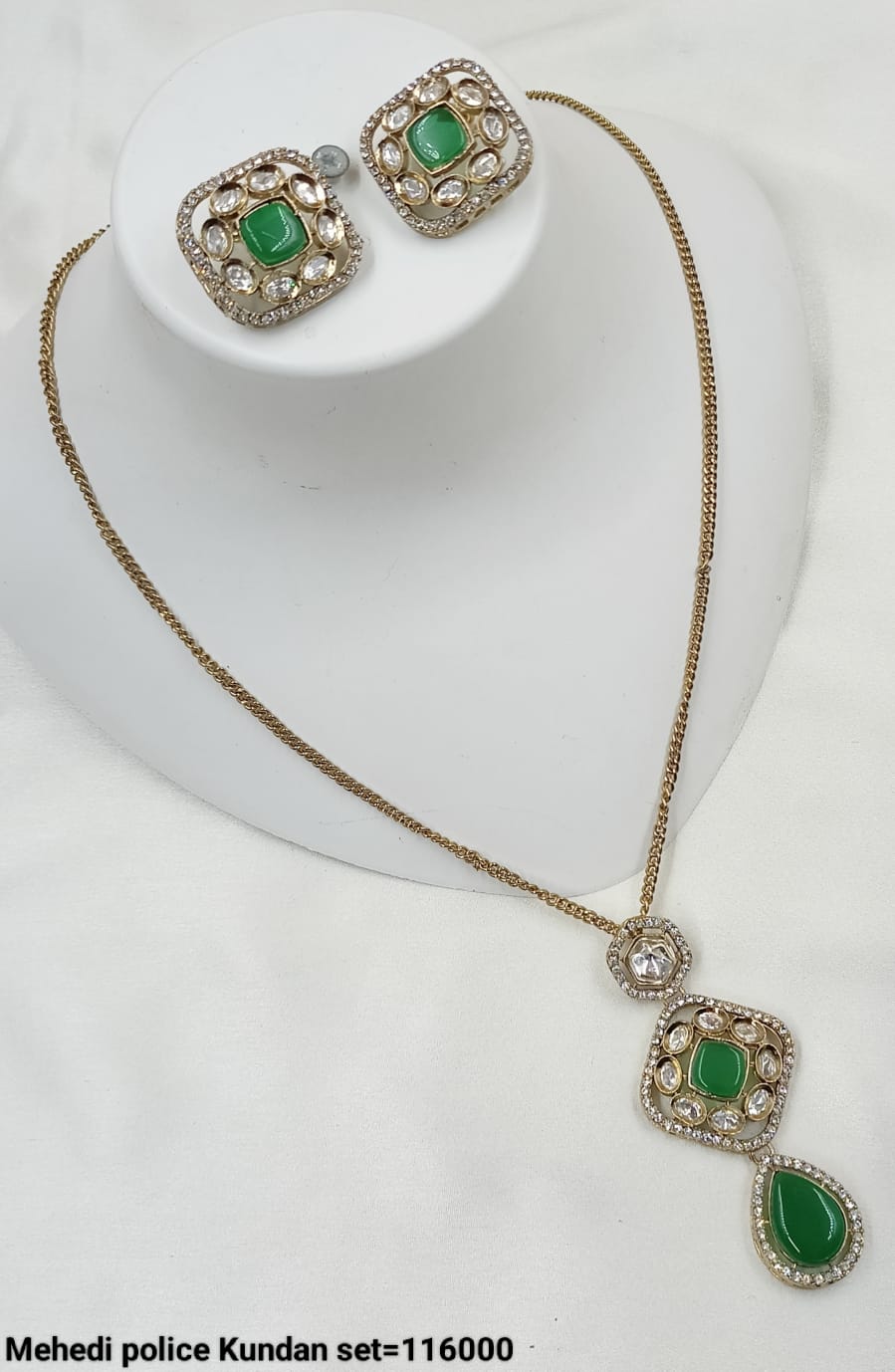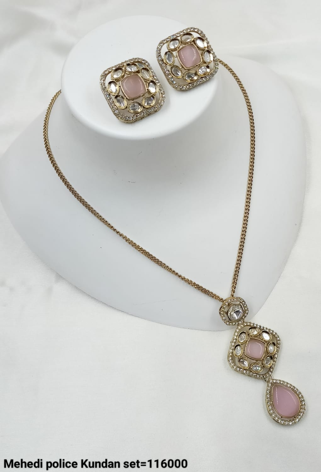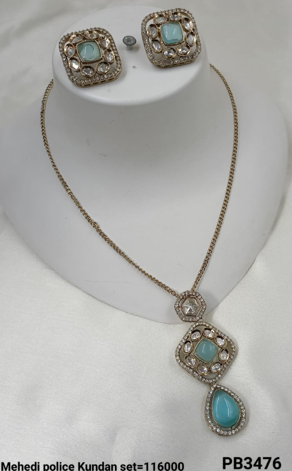 This exquisite Kundan pendant set showcases a delicate arrangement of traditional Kundan stones, expertly crafted to highlight intricate detailing and fine craftsmanship. The set includes a...
