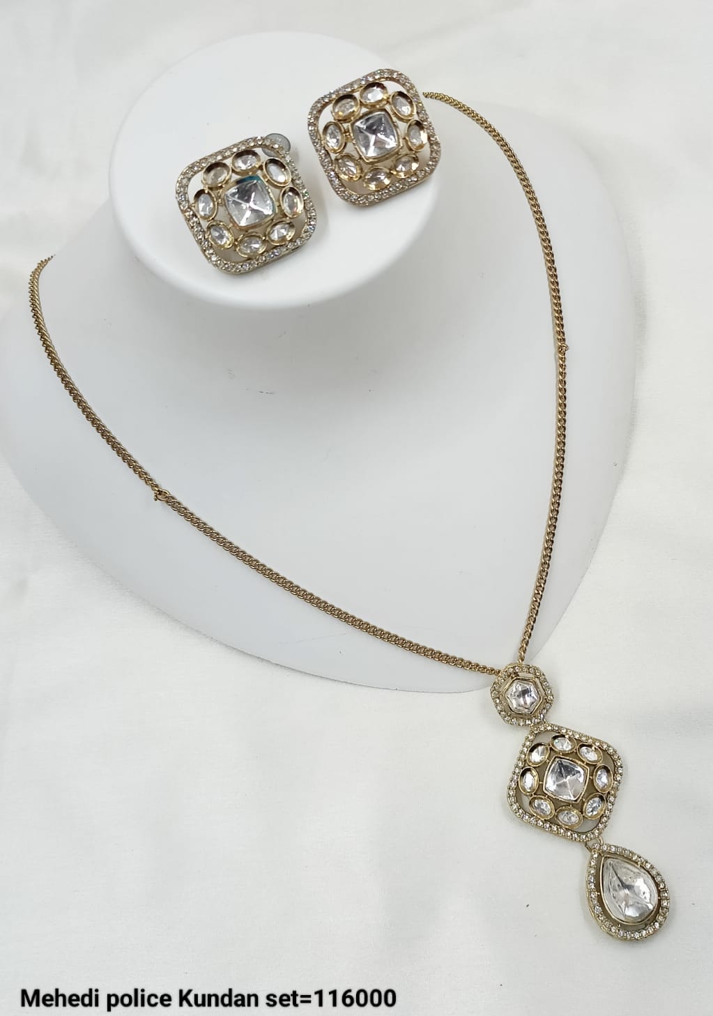 This elegant Kundan pendant set features a beautifully crafted pendant and matching earrings, adorned with clear kundan stones set in a gold-tone base. The design is...