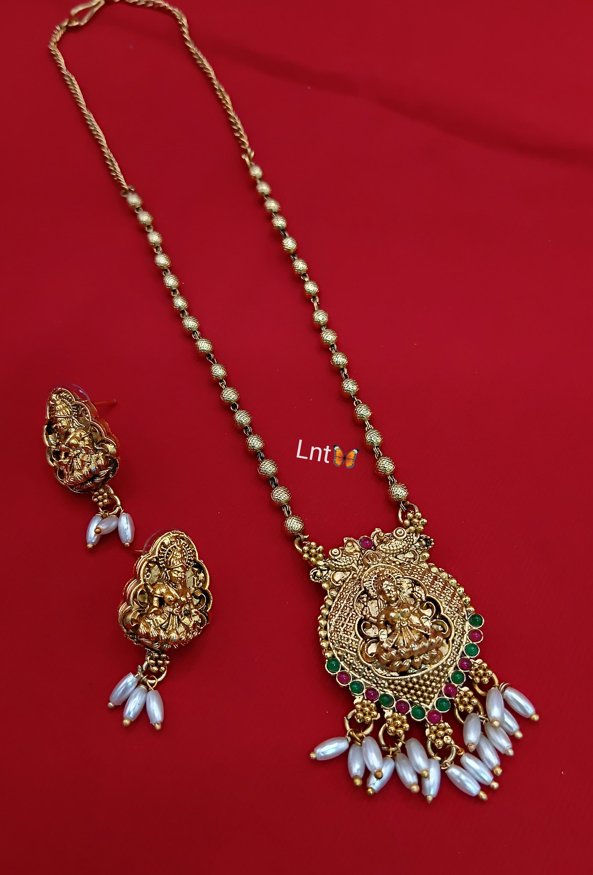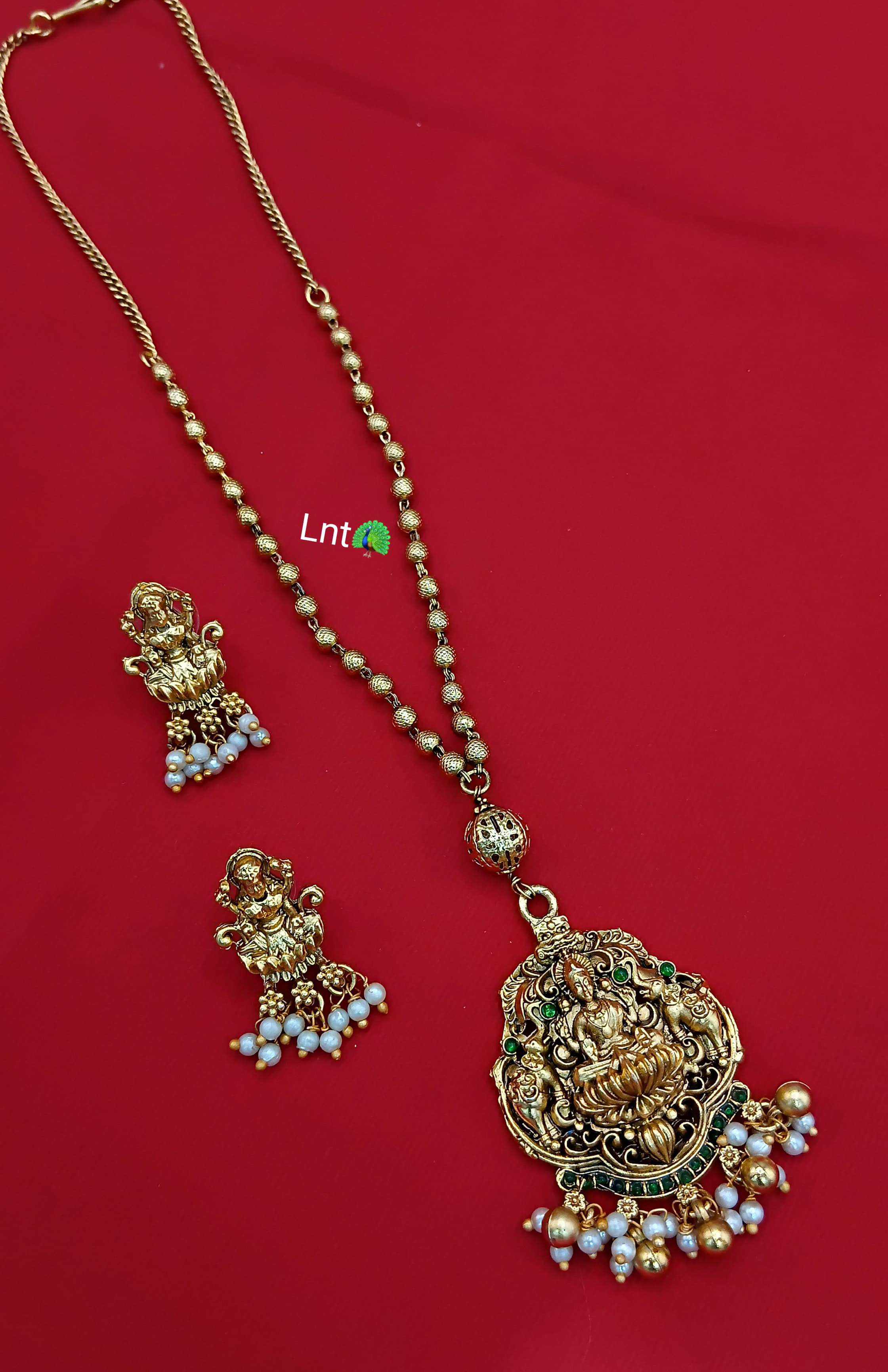 Temple Design Lakshmi Long Necklace Set with Beads & Earrings
