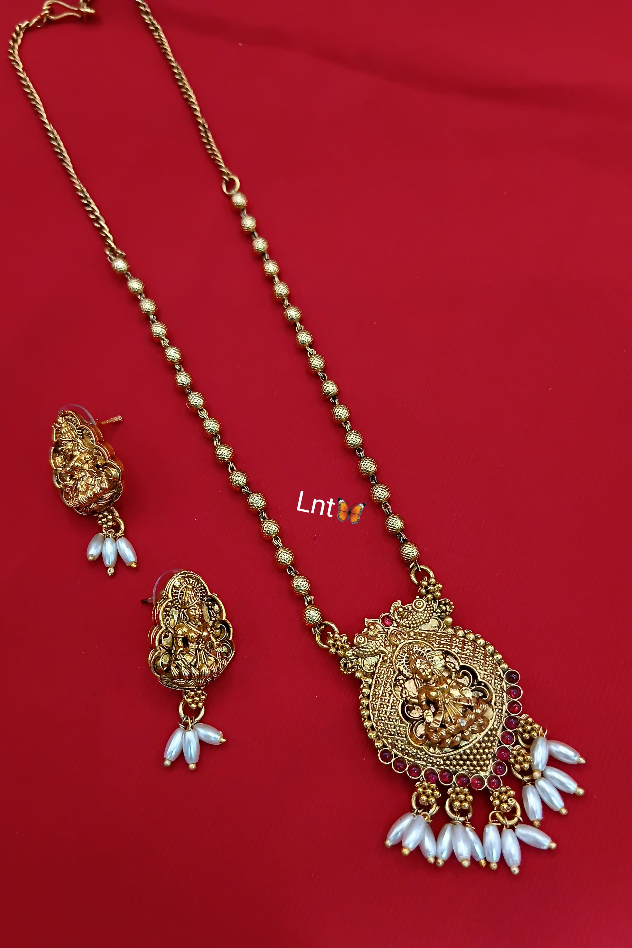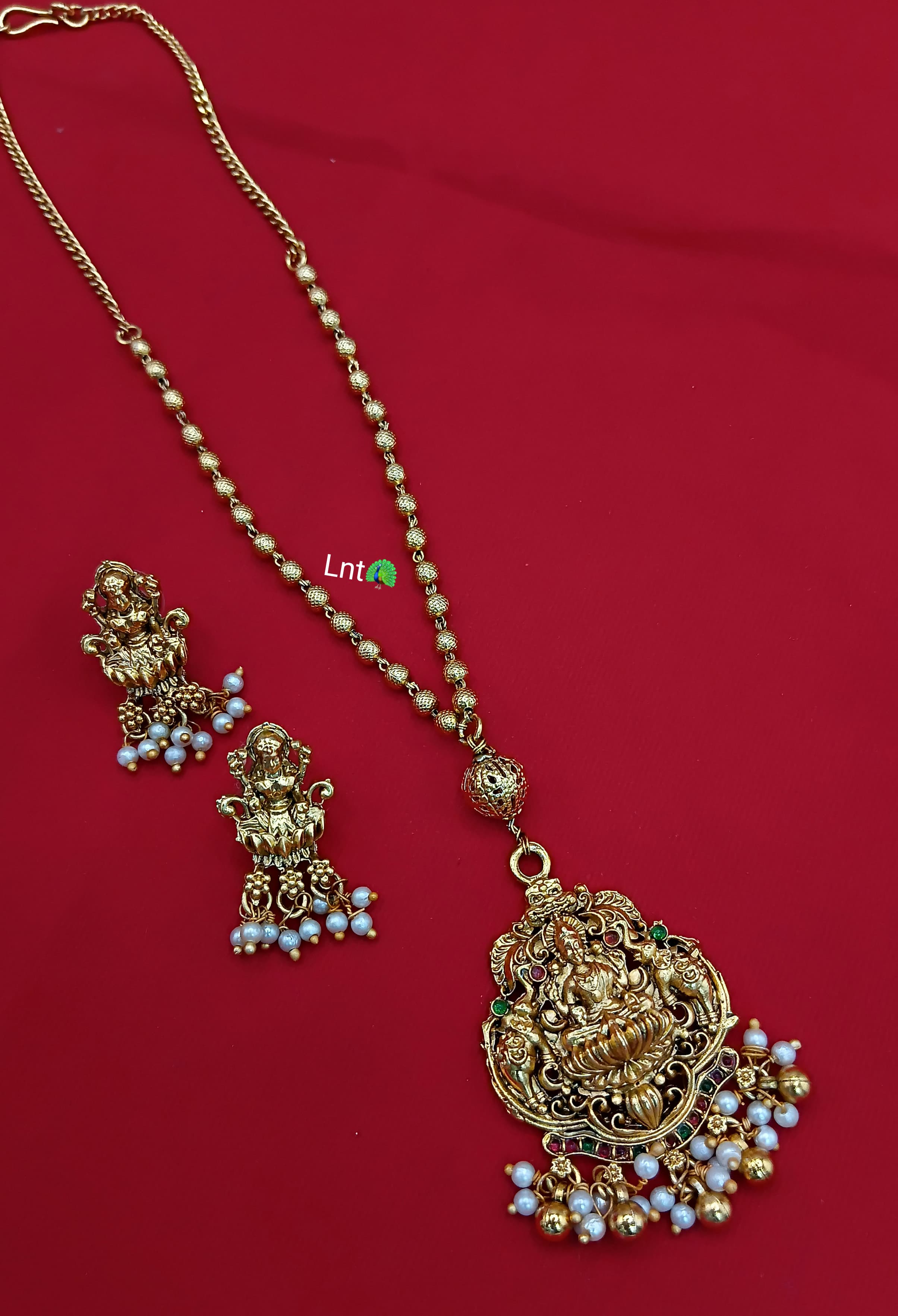 Temple Jewelry Set with Goddess Lakshmi Pendant & Earrings – Gold-Plated with Pearl Drops