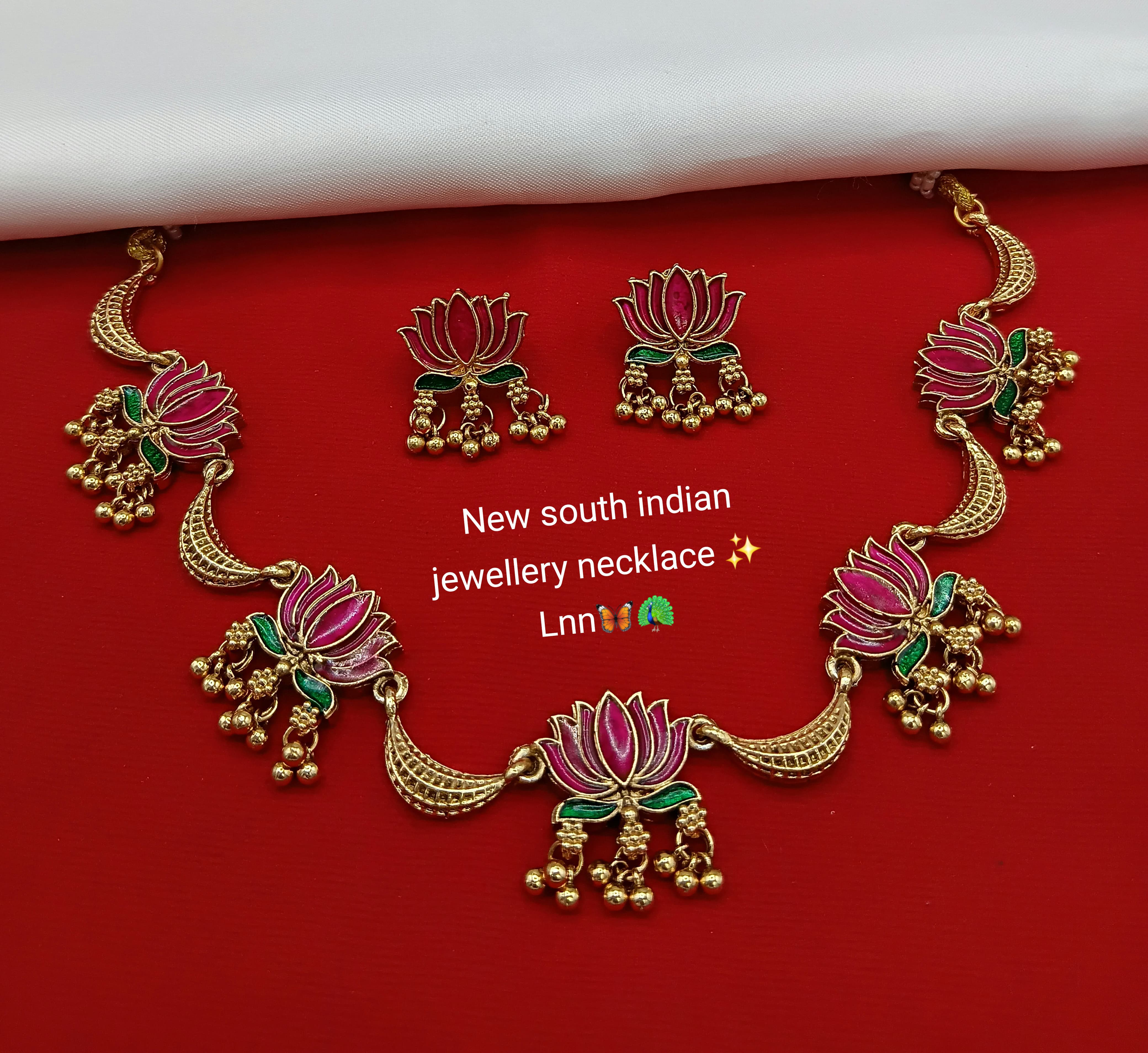 Elevate your ethnic style with this stunning Lotus Design South Indian Necklace Set. Featuring beautifully crafted lotus motifs adorned with intricate detailing, this necklace set comes...