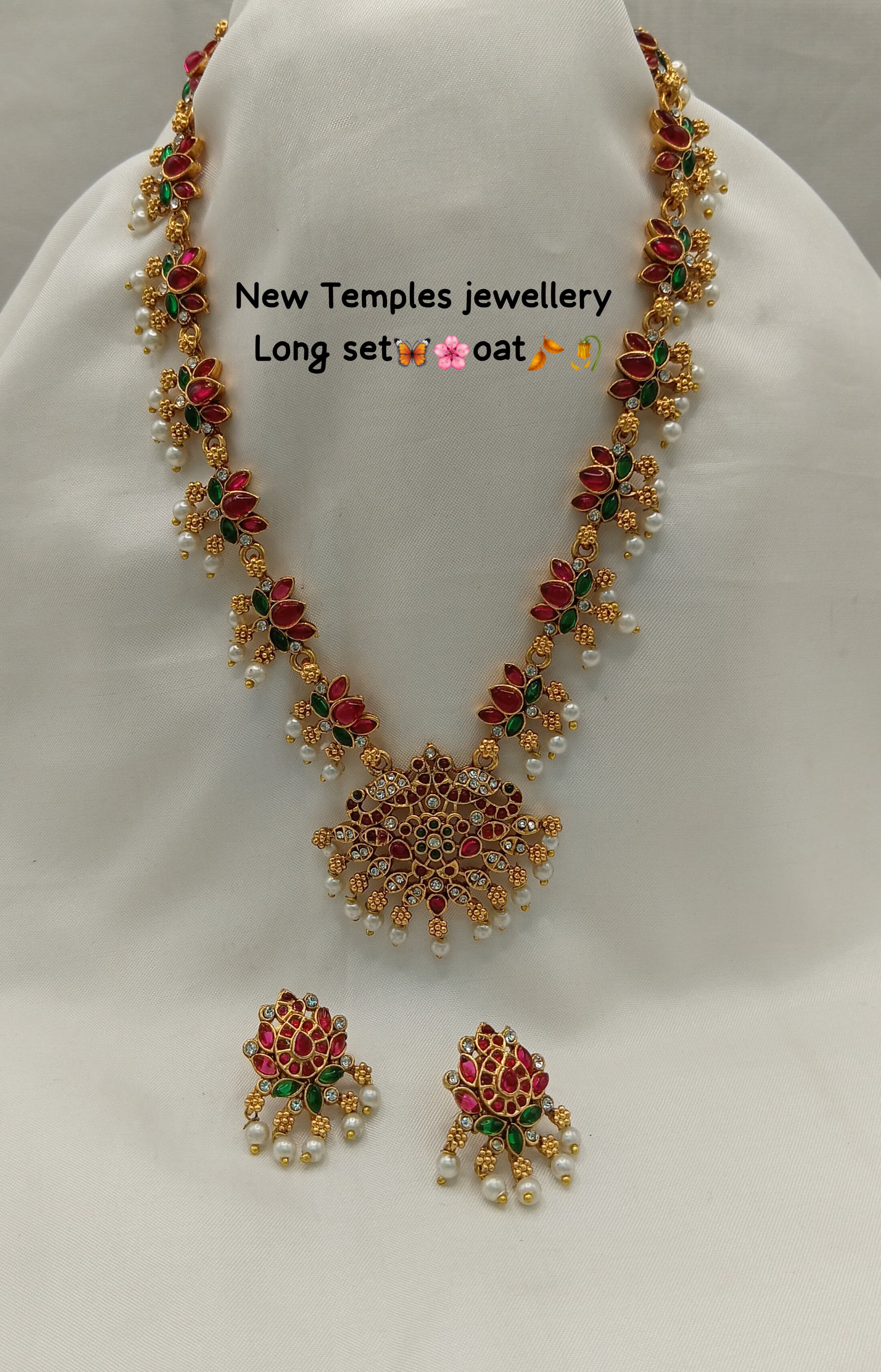 Elegant Temple Jewelry Long Necklace Set with Earrings – Pearl & Floral Design