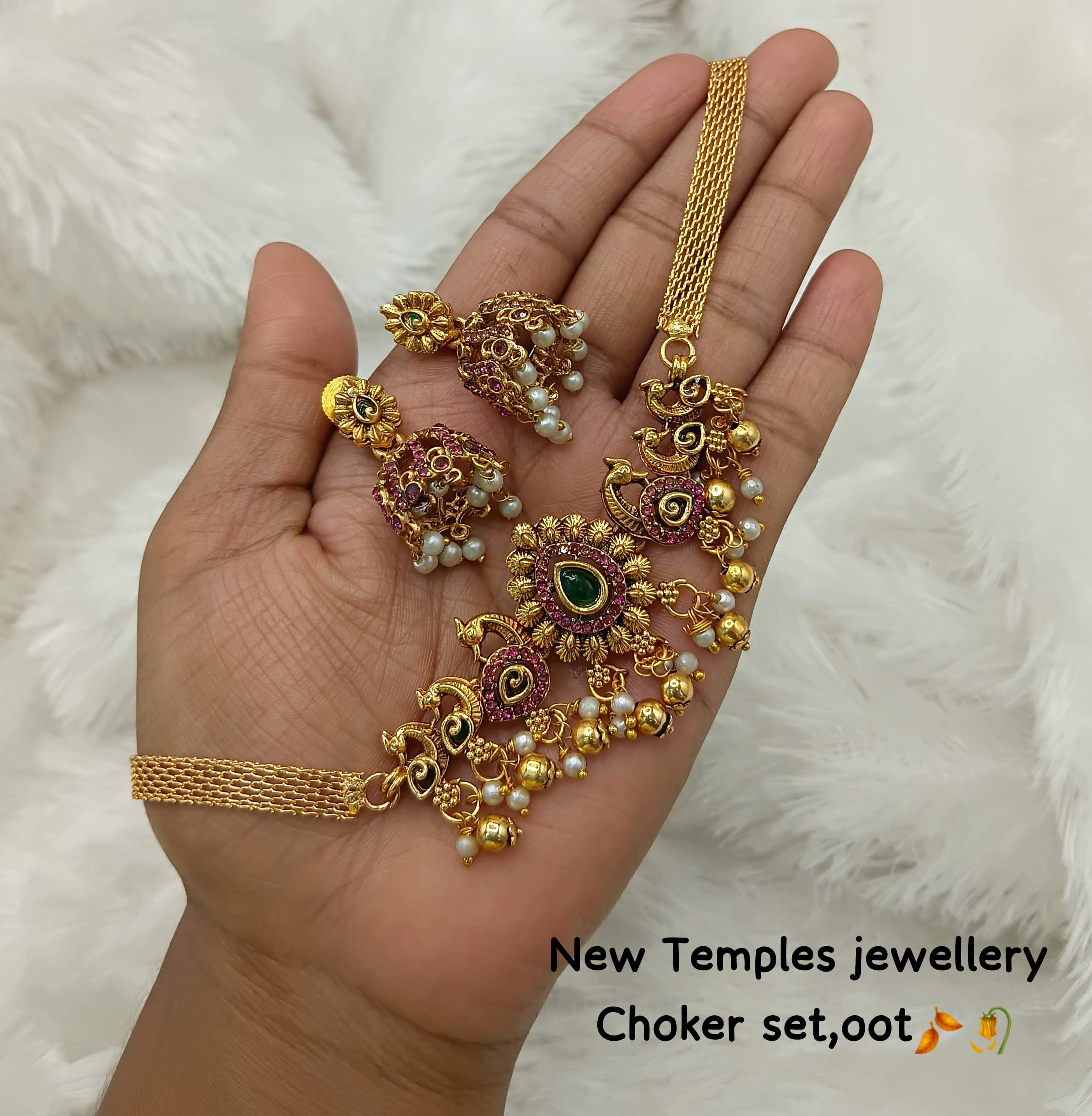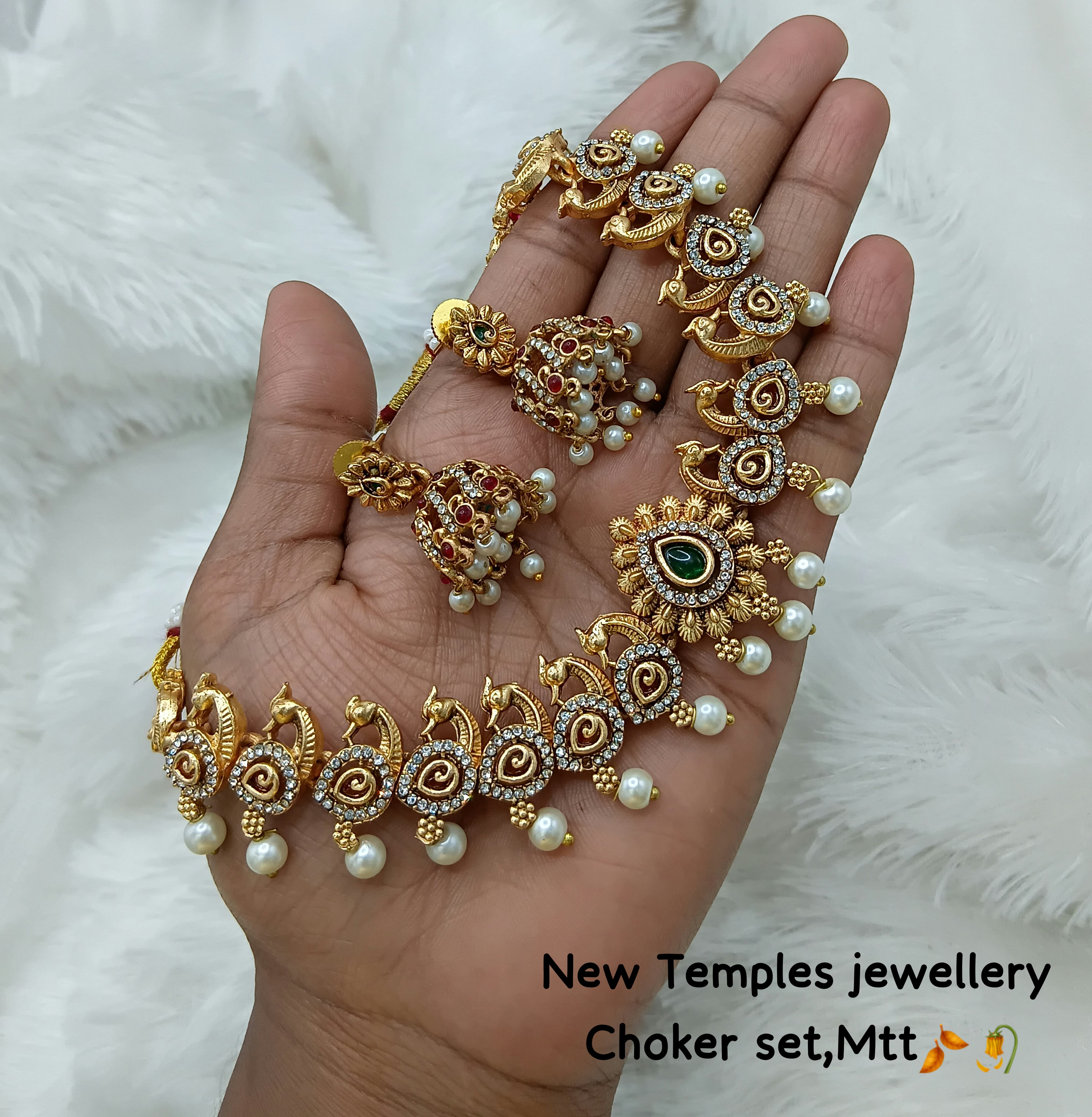 Elevate your ethnic elegance with this stunning Peacock Design Temple Choker Set. Handcrafted with intricate detailing, this set features graceful peacock motifs adorned with green enamel,...