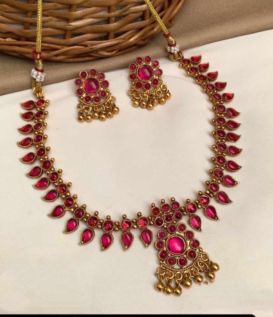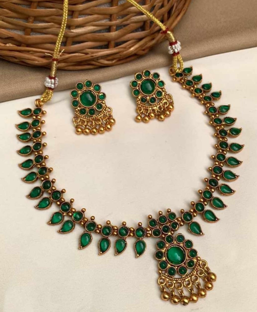 Celebrate timeless tradition with this Premium Temple Necklace & Earring Set, featuring alternating red and green oval stones set against a rich gold finish. Handcrafted on a...