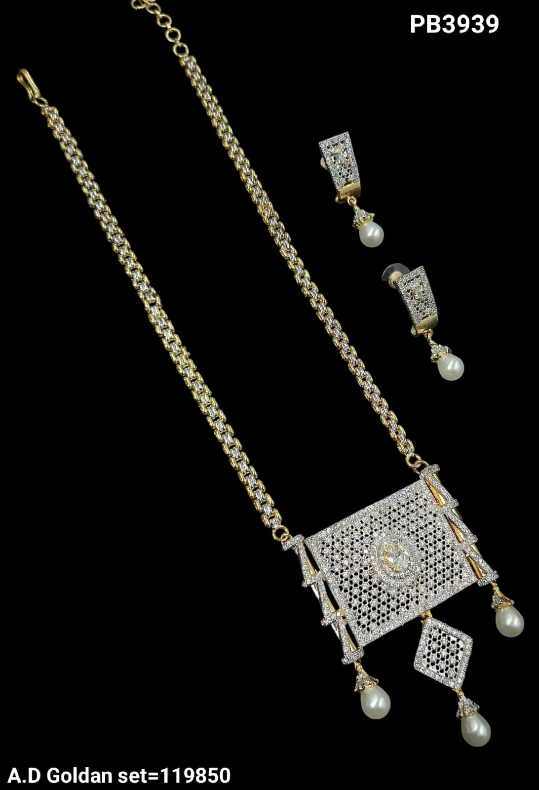 Elegant AD Pendant Necklace Set with Earrings – Gold-Toned Finish & Pearl Drops