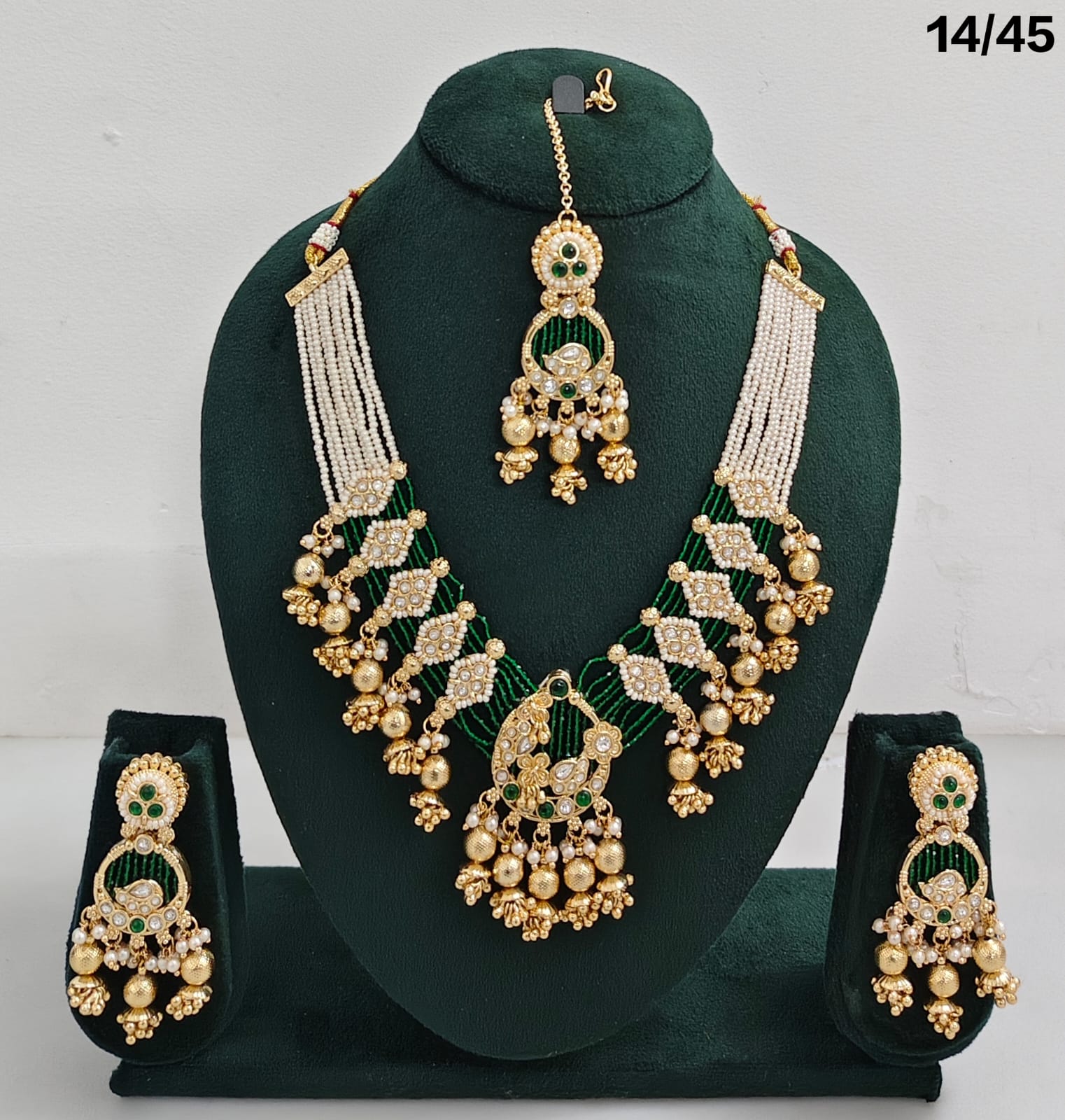 Antique Gold-Plated Kundan Necklace Set with Hanging Pearls & Beads – Earrings & Maang Tikka Included