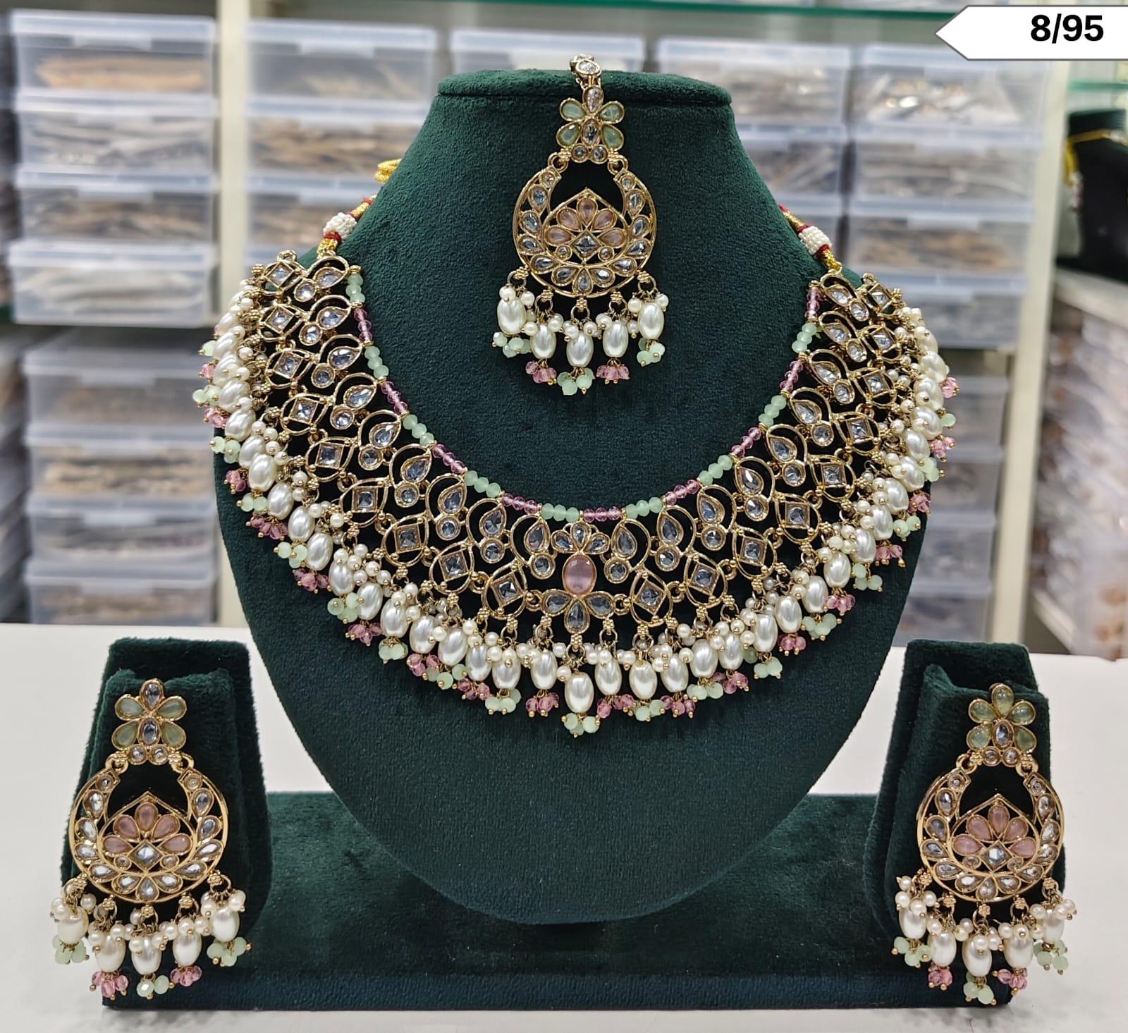 CZ Pearl Choker Necklace Set with Matching Earrings and Maang Tikka – Bridal & Ethnic Jewellery
