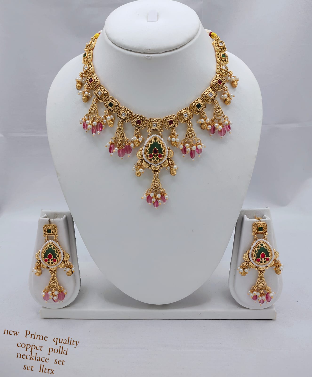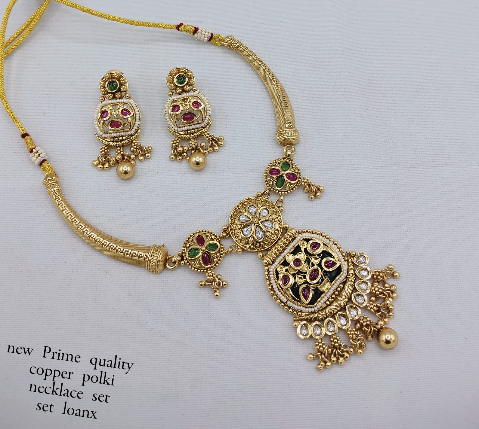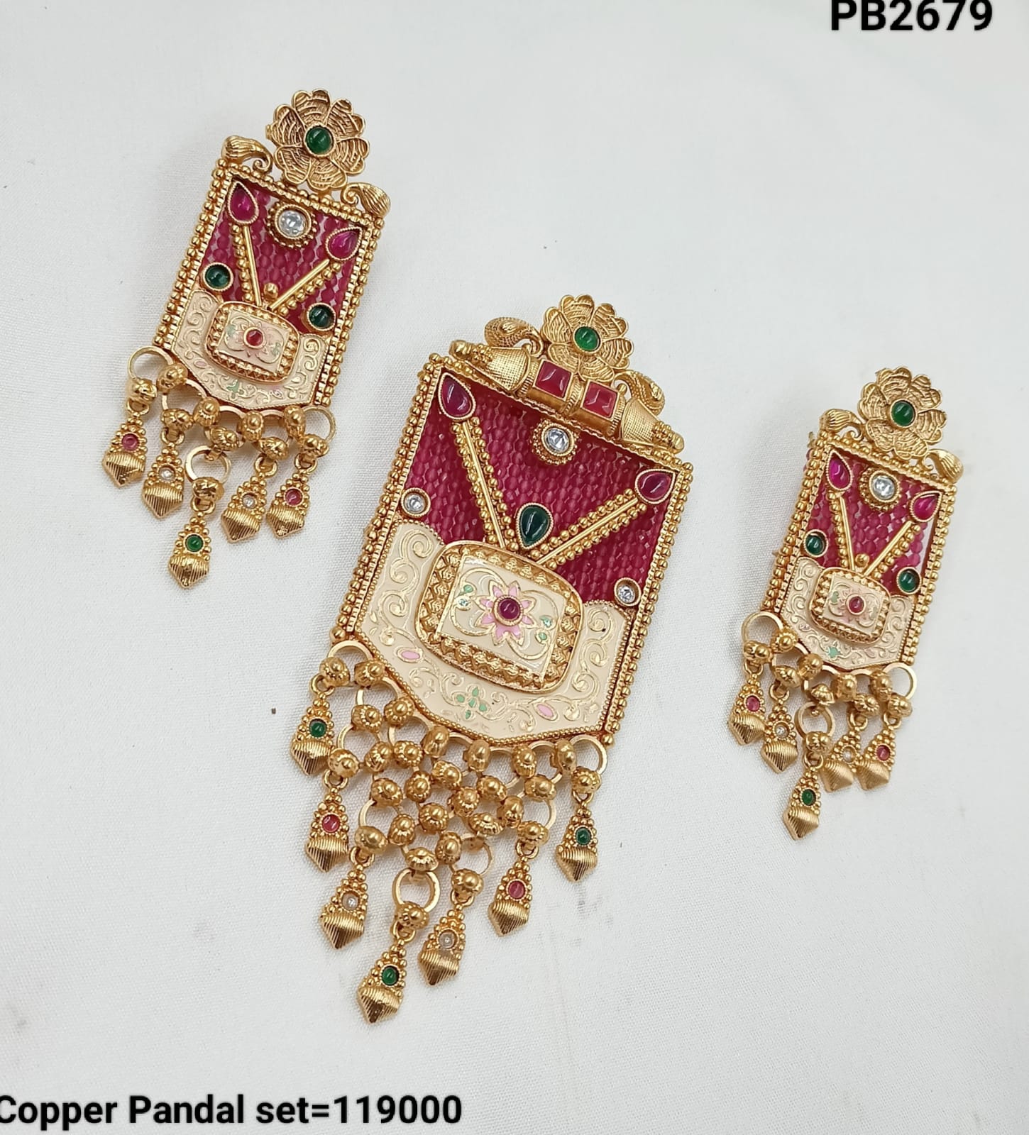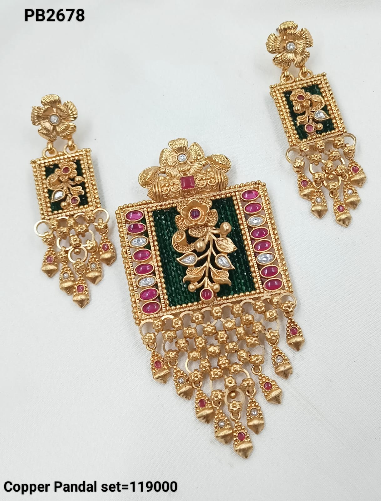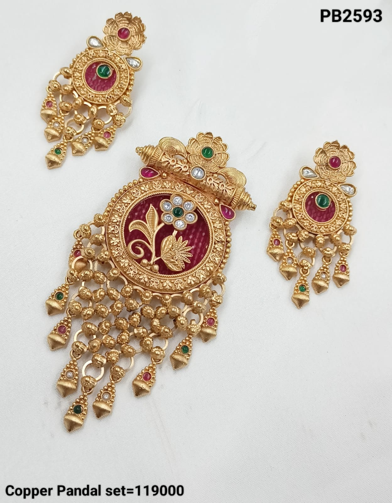 This exquisite copper necklace set is a true statement of elegance and traditional artistry. Adorned with dazzling CZ stones and intricate enamel work, it features a...