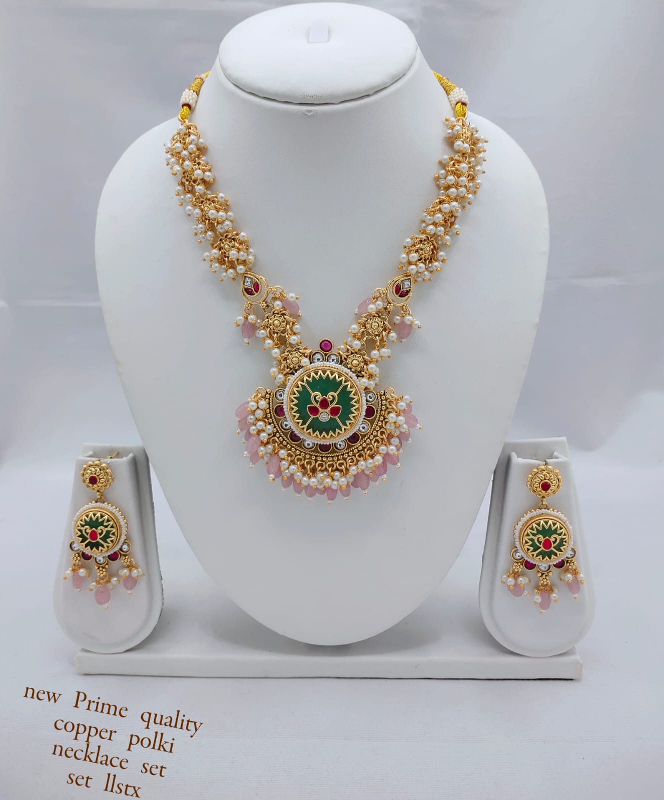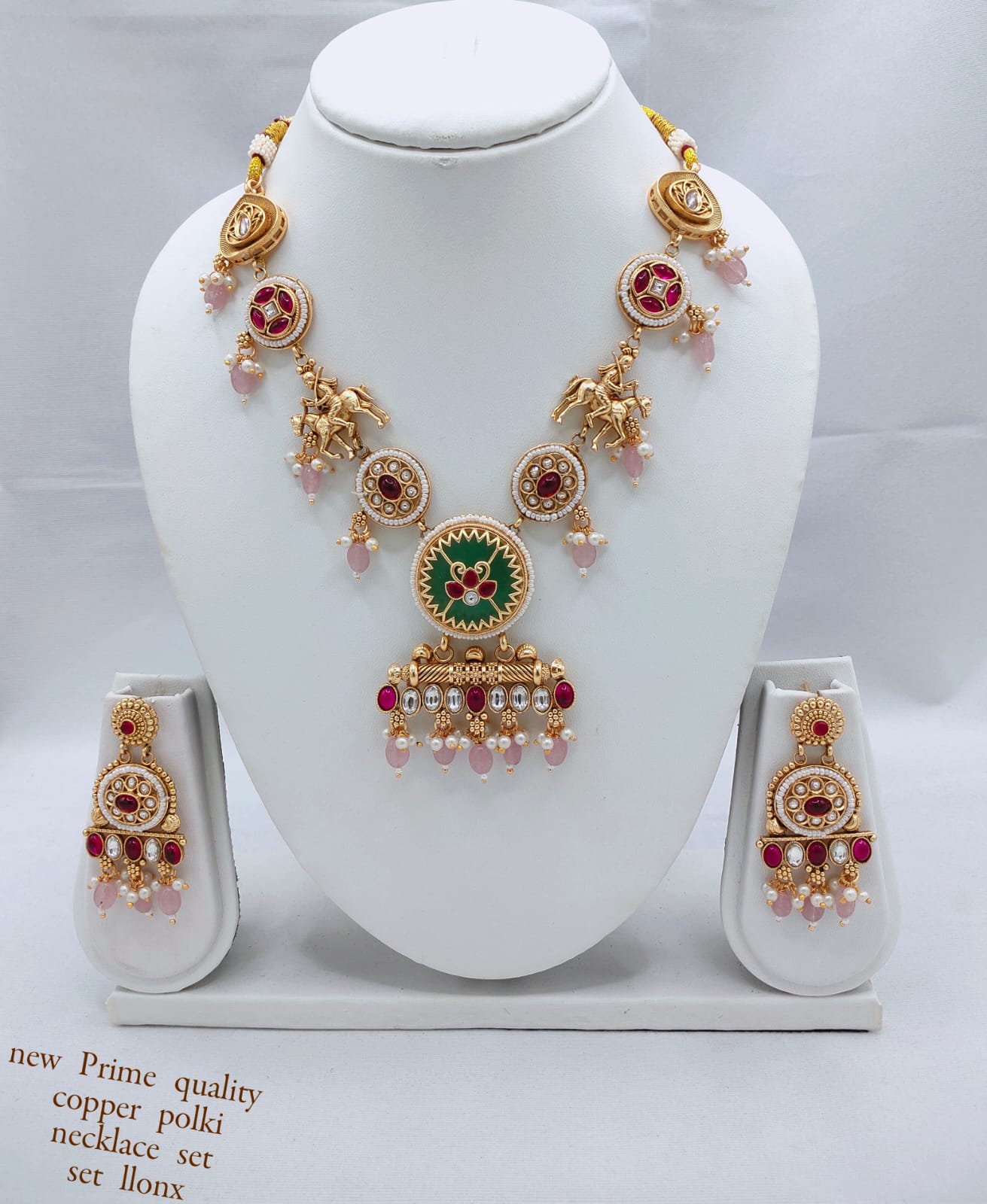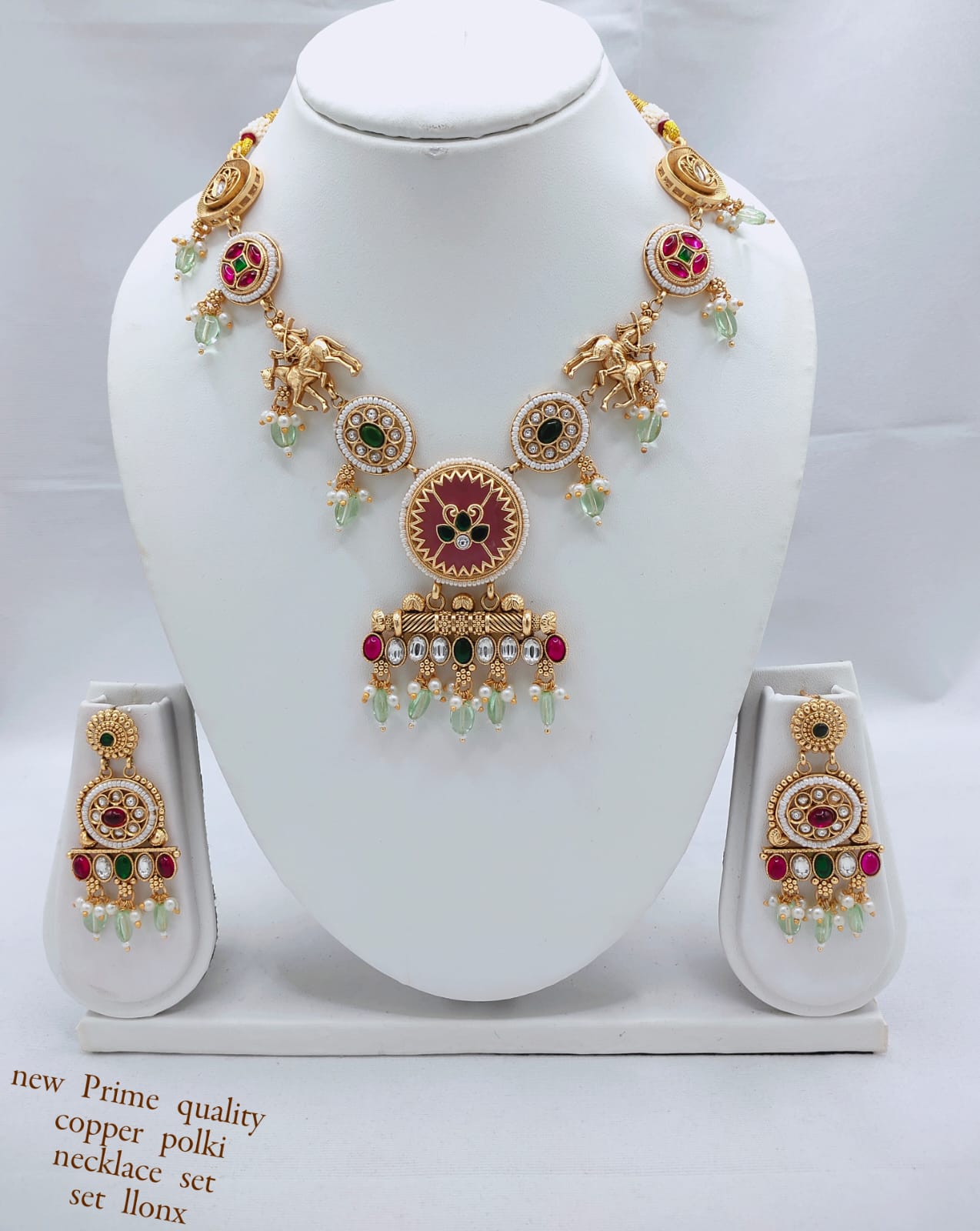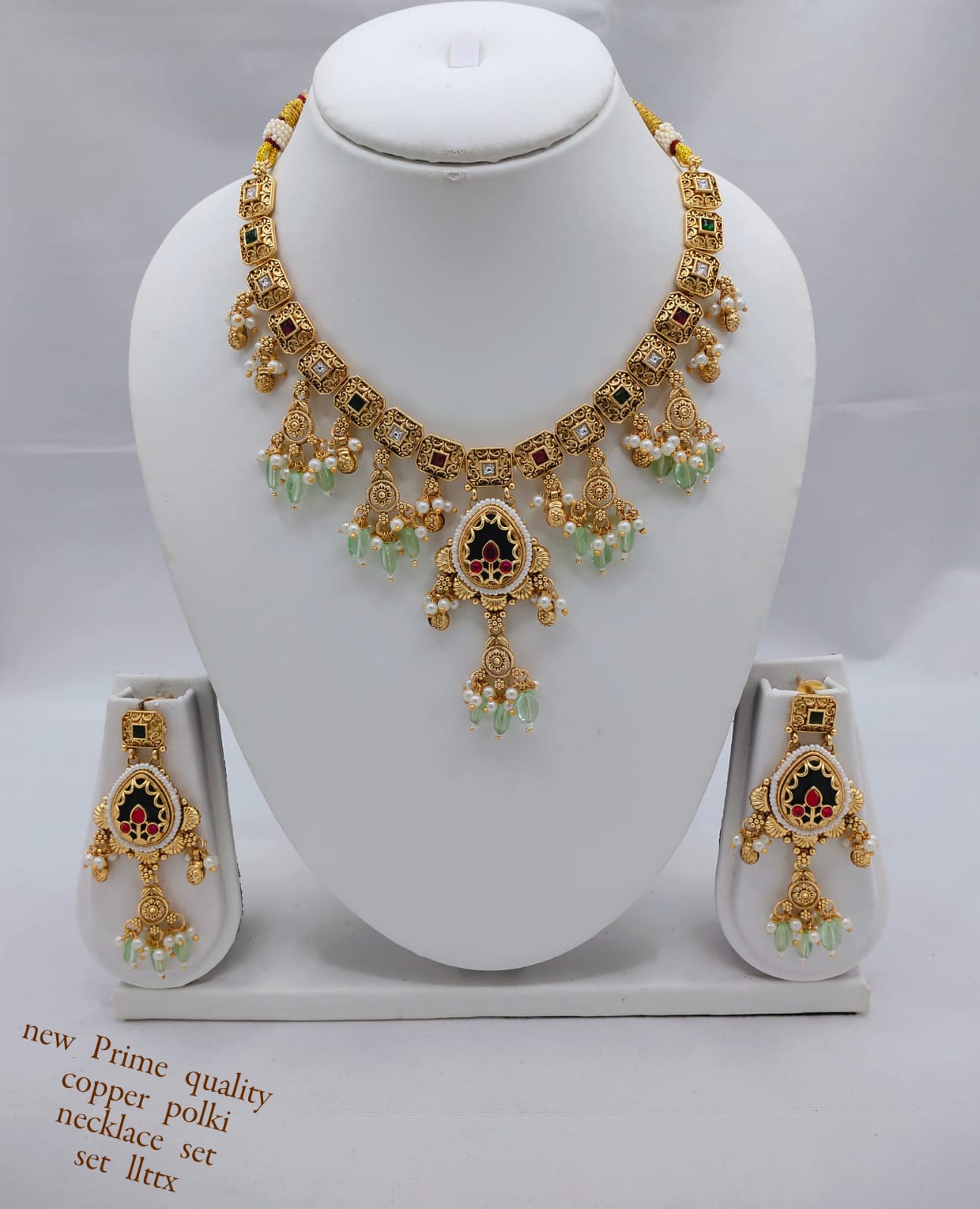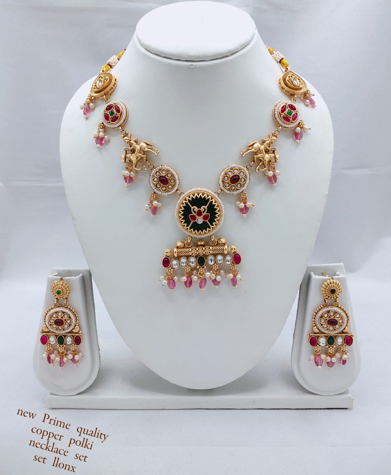This exquisite copper necklace set is a true statement of elegance and traditional artistry. Adorned with dazzling CZ stones and intricate enamel work, it features a...